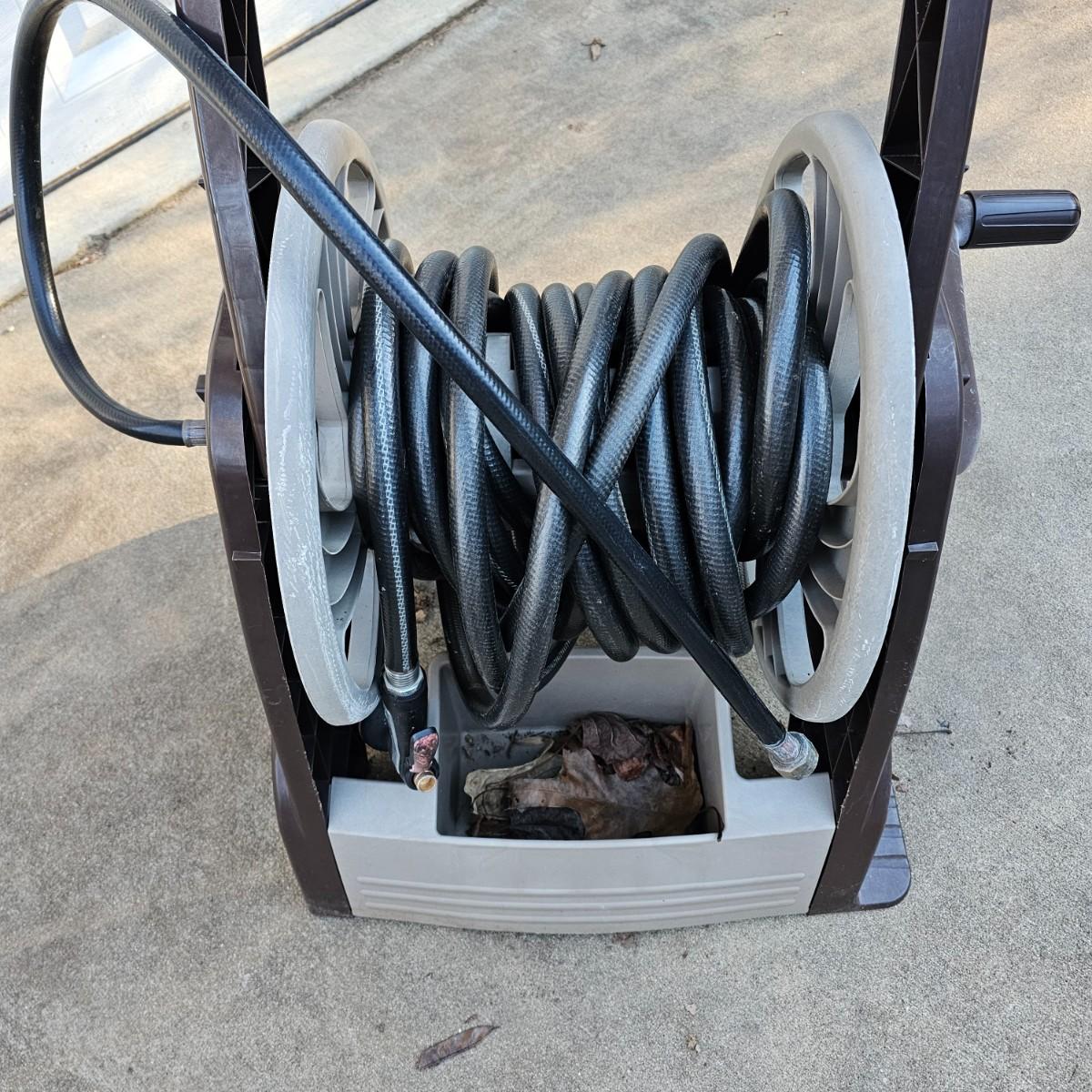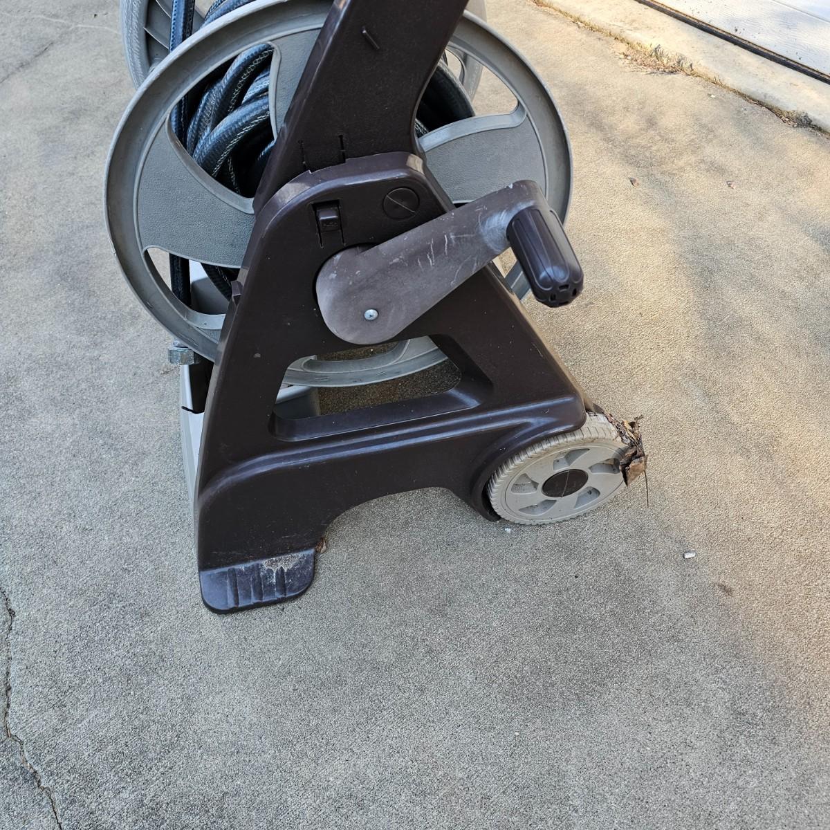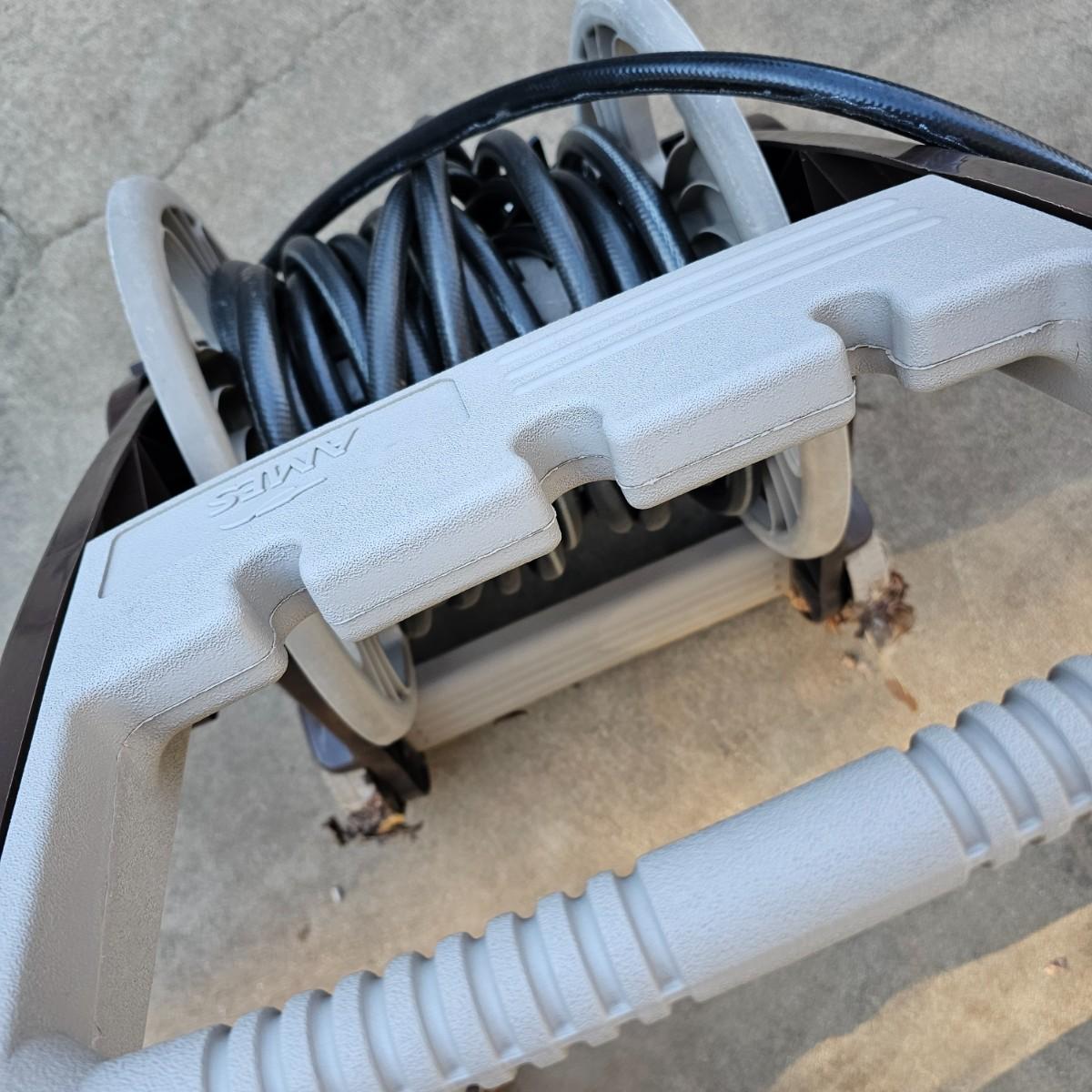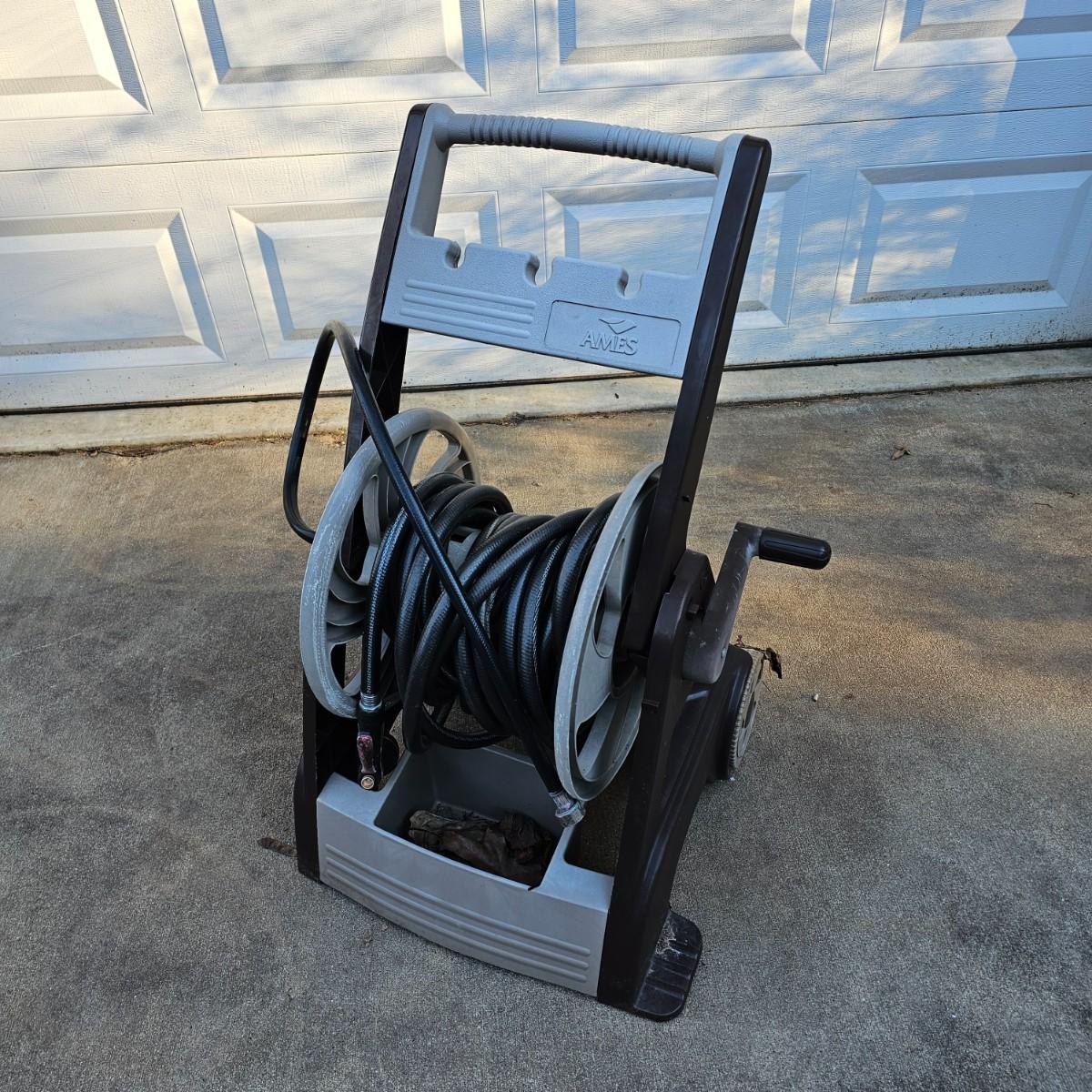 Rolling hose reel cart by Ames. Plastic all around, this item measures 24" x 20" x 34"H. Comes with three hoses and two spray nozzles. See photos for details. Local pickup only.