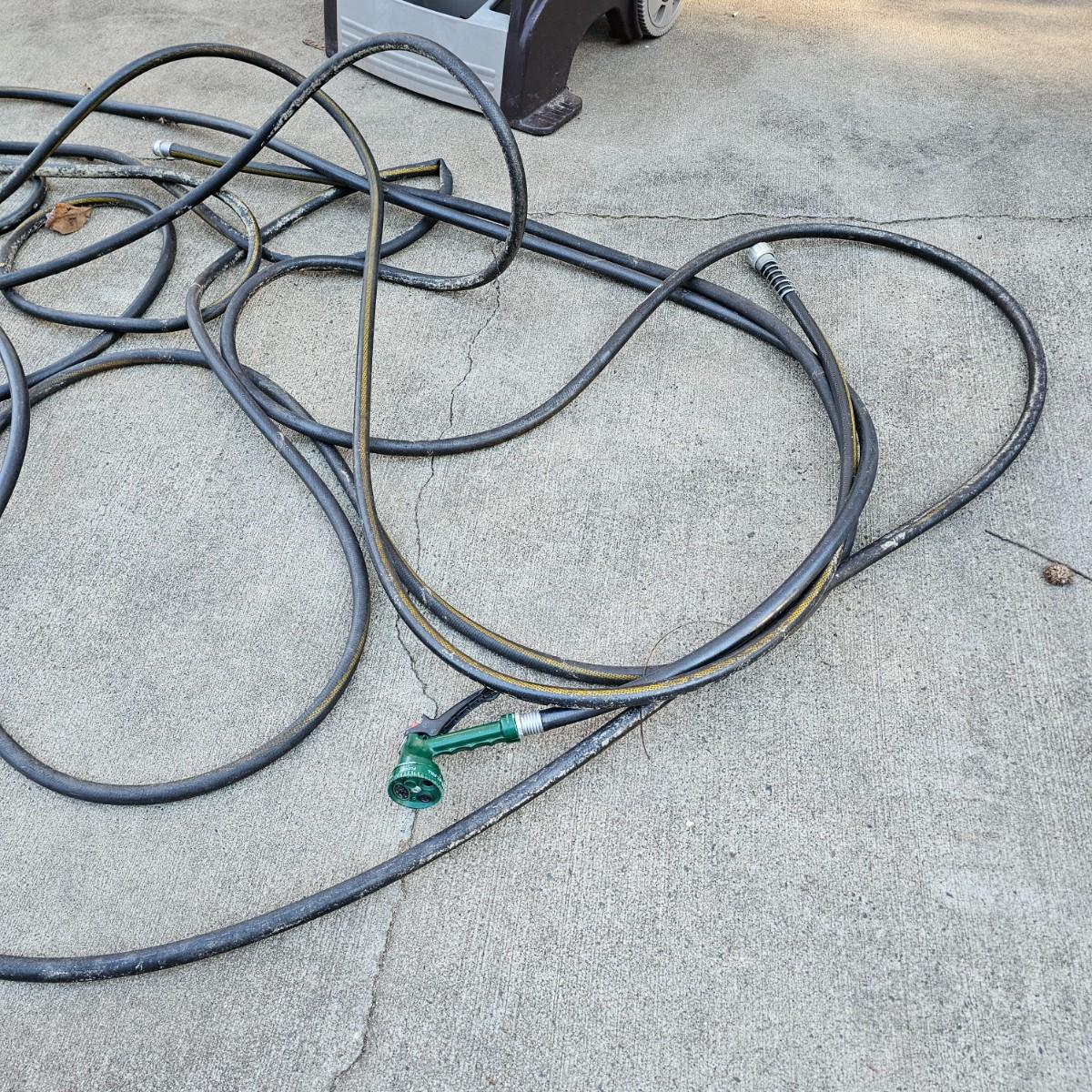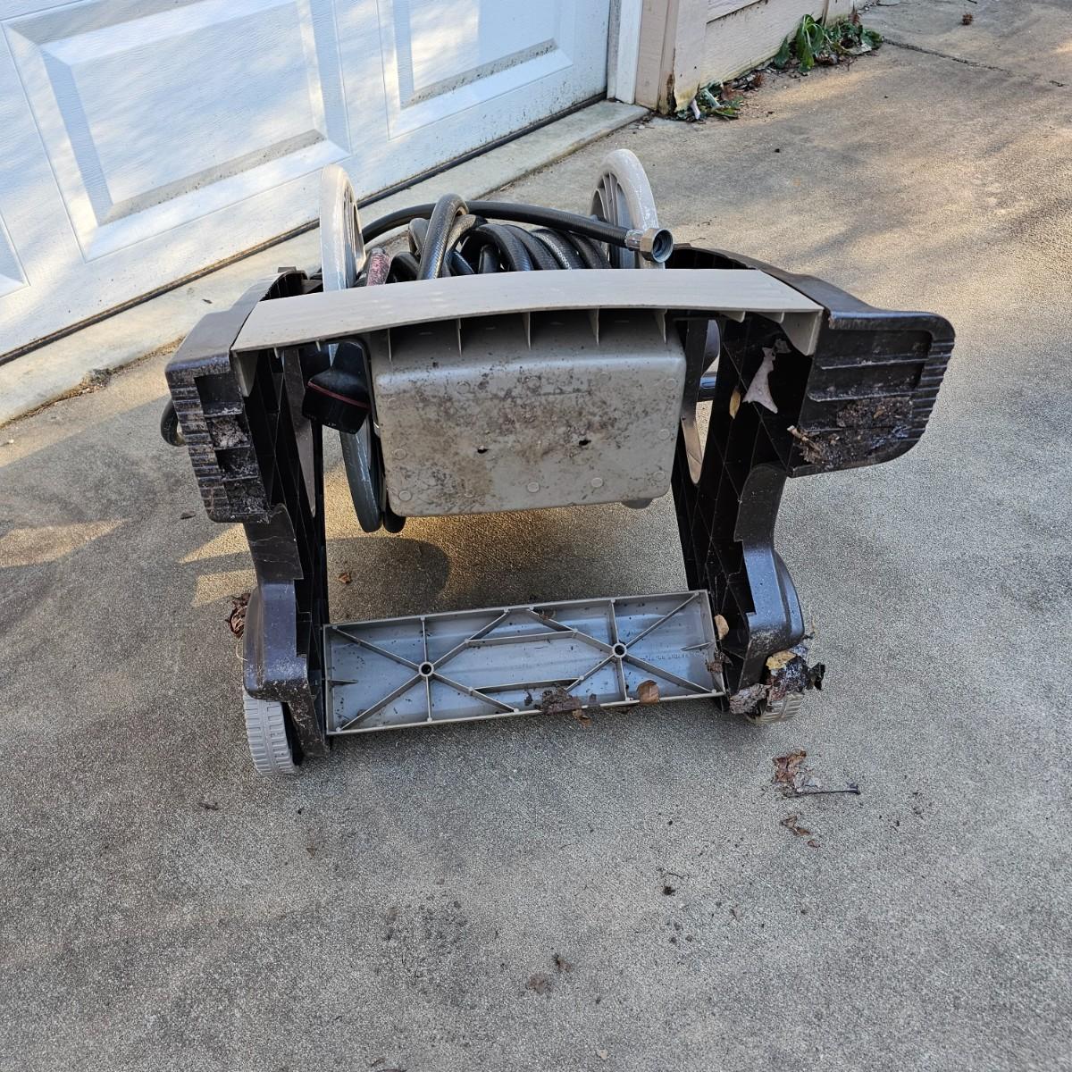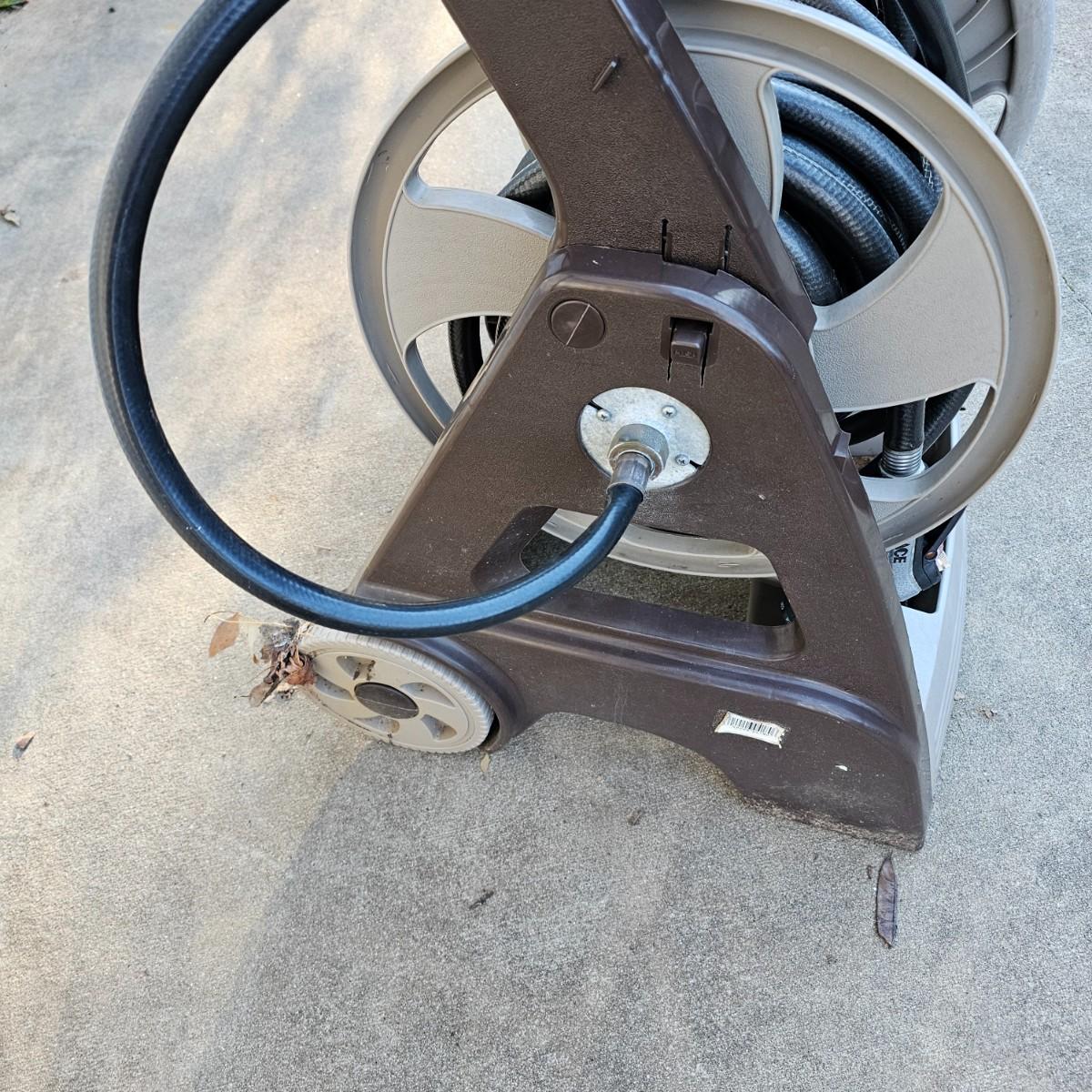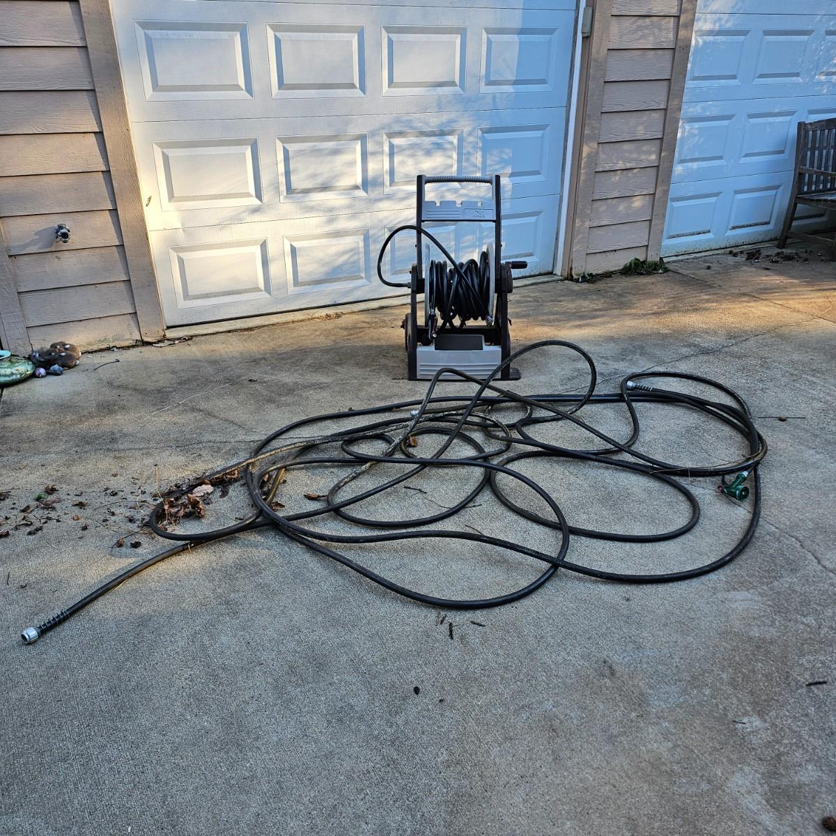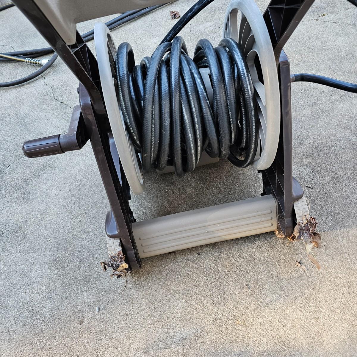 Rolling hose reel cart by Ames. Plastic all around, this item measures 24" x 20" x 34"H. Comes with three hoses and two spray nozzles. See photos for details. Local pickup only.