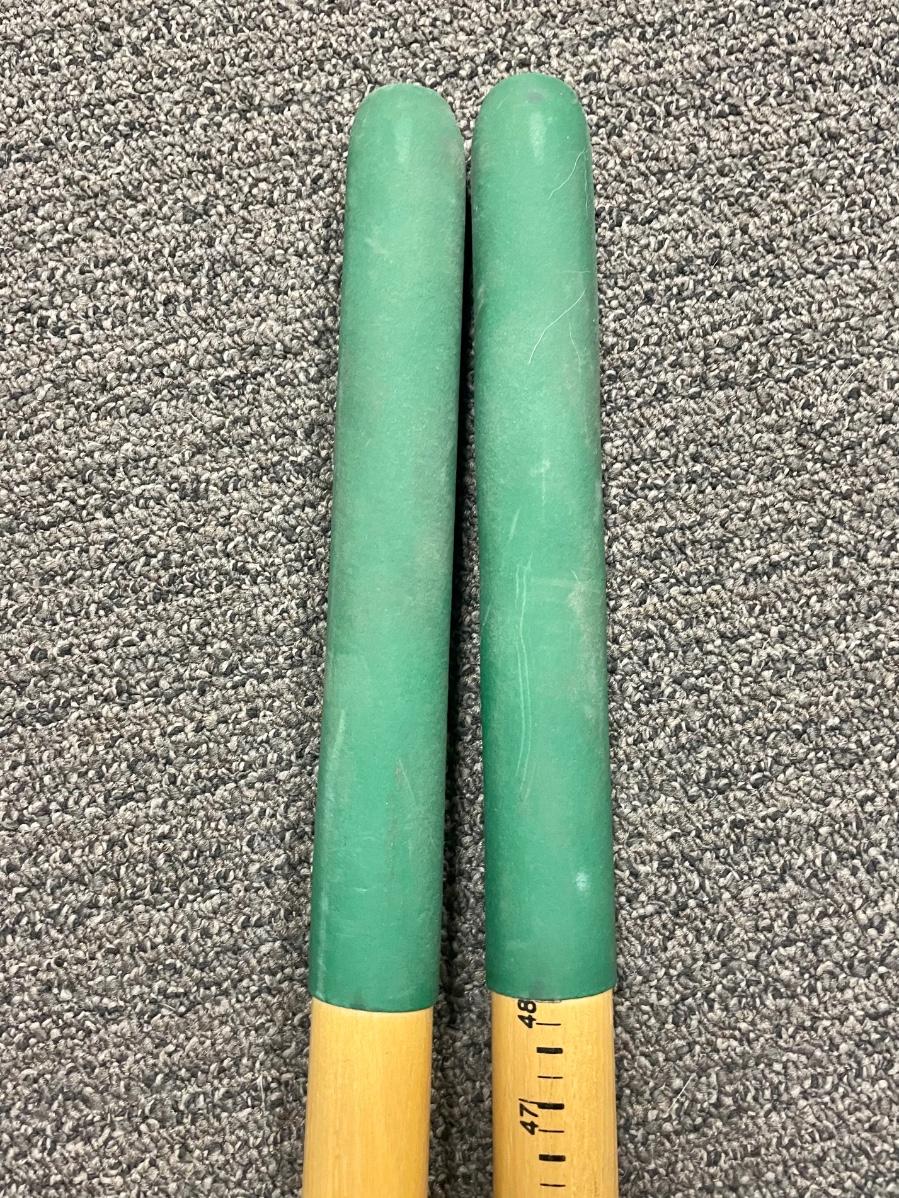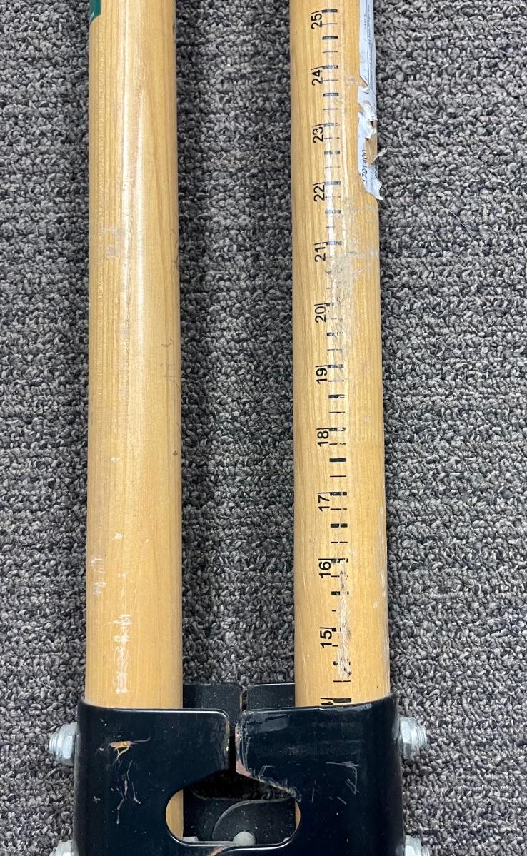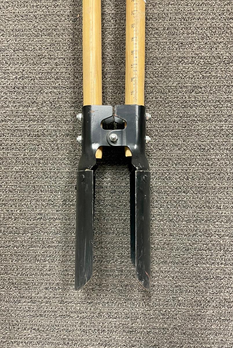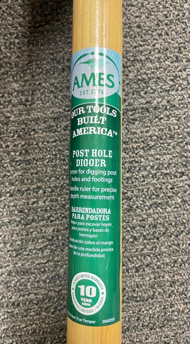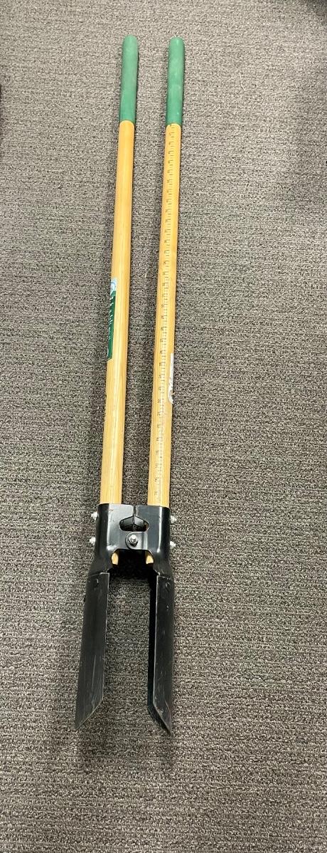 New post hole digger. Wood handles with rubber grips. Handle is marked to show hole depth in inches, maximum digging depth is 48".
