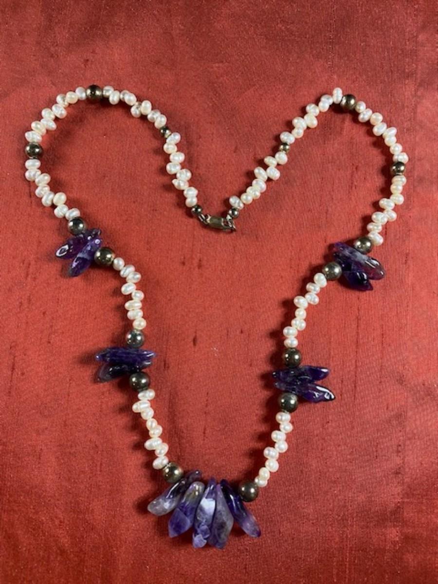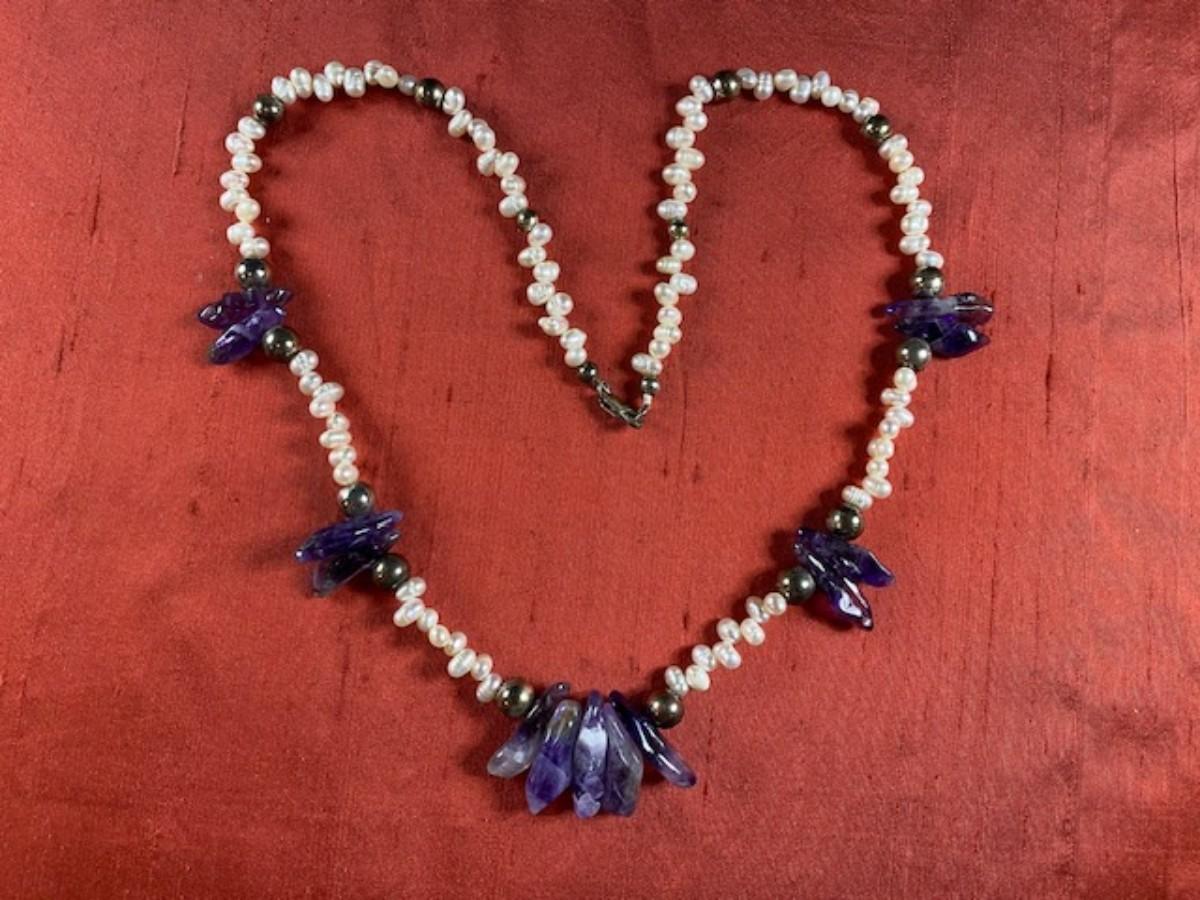 This auction lot is for a Amethyst and Fresh Water Pearl Necklace. This lovely necklace is made up of fresh water pearls, polished amethyst stones and brass beads. It measures about 22-inches long and has a claw clasp. The necklace is very pretty and is in good condition.