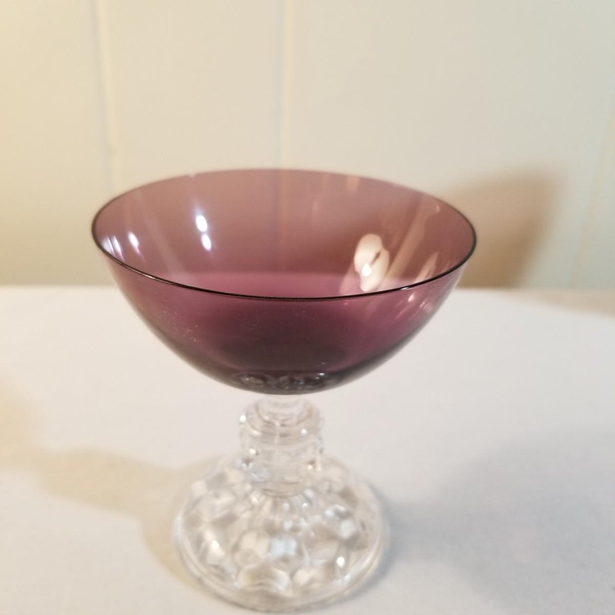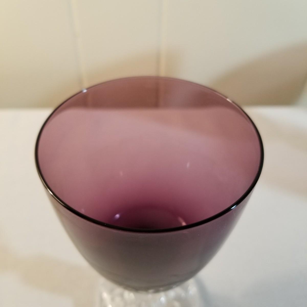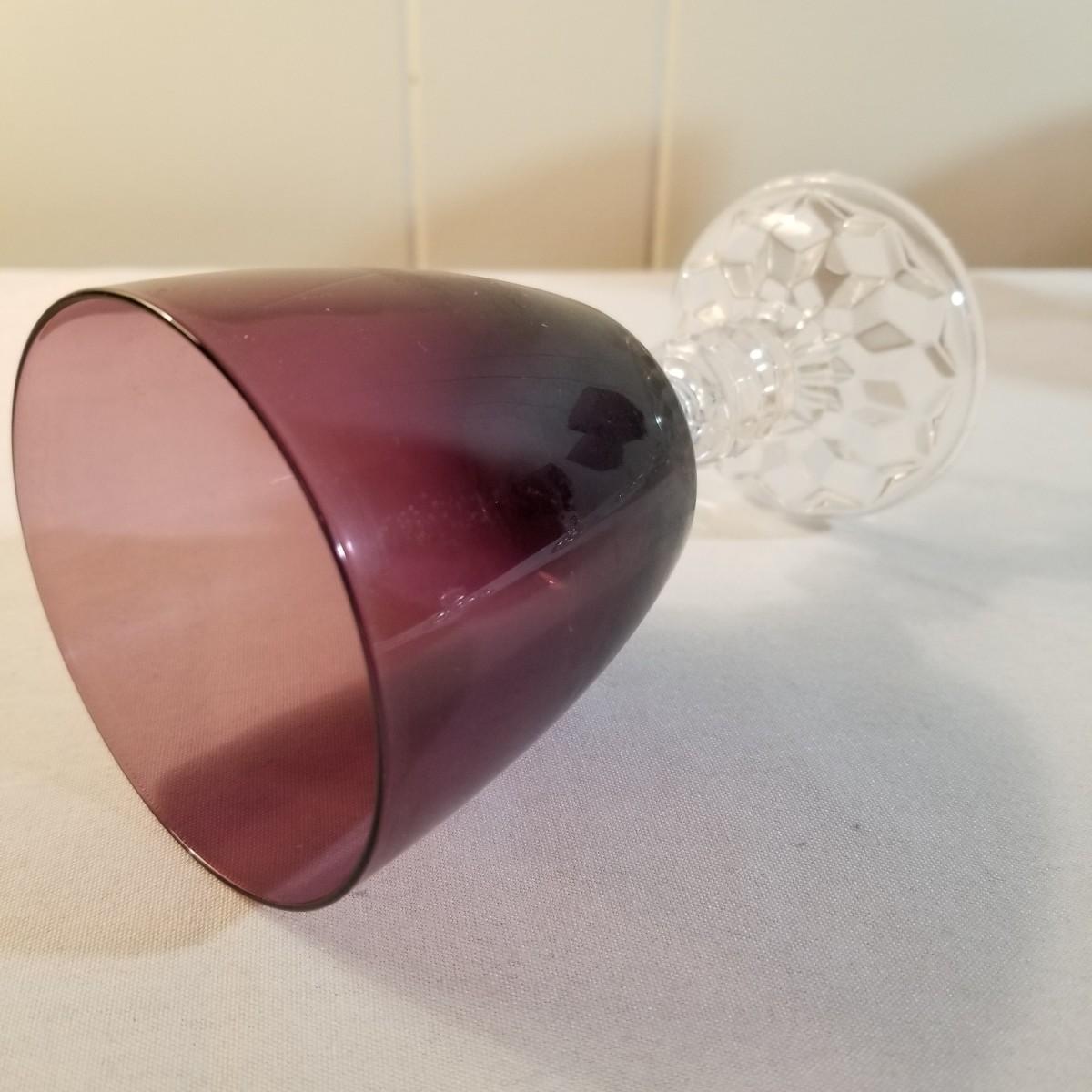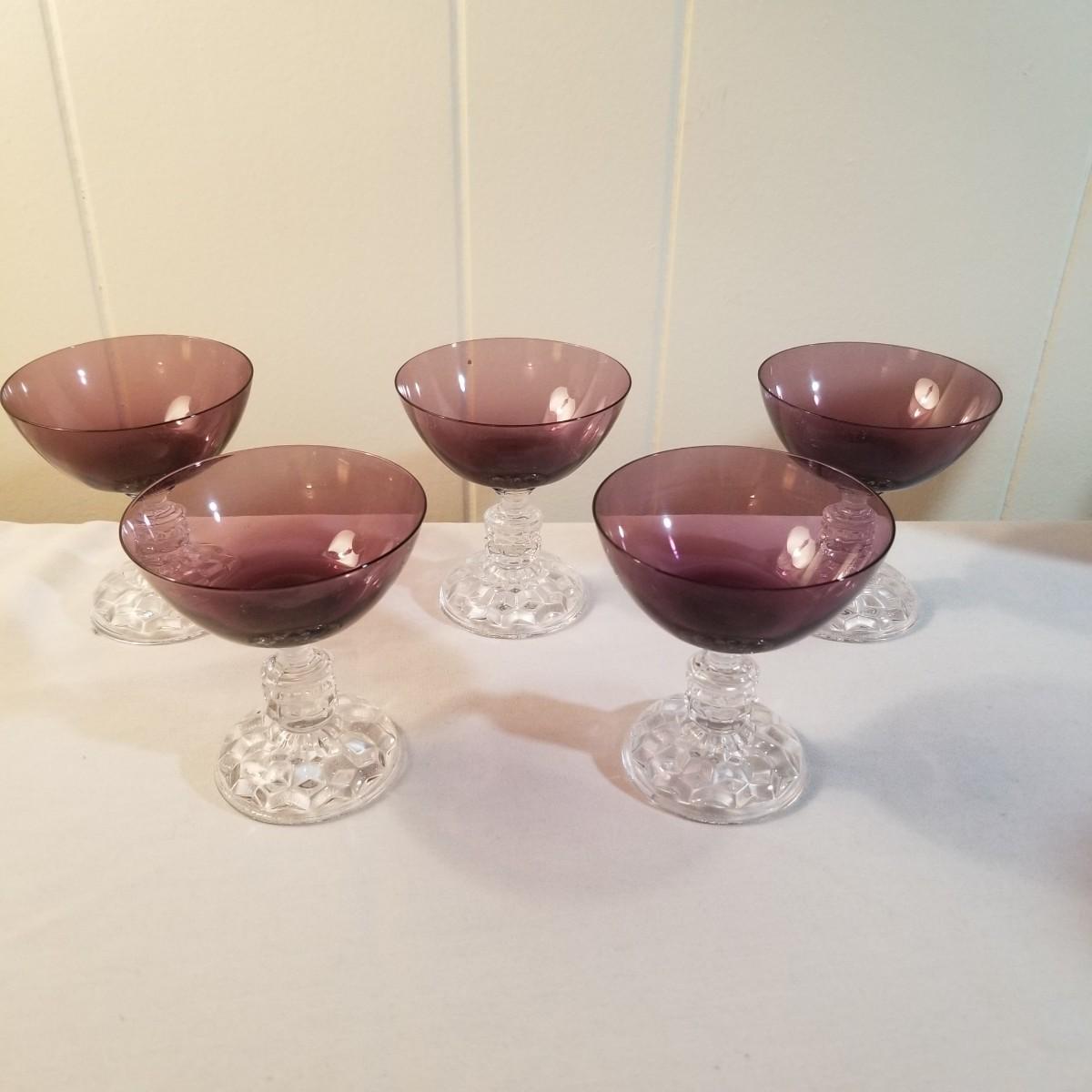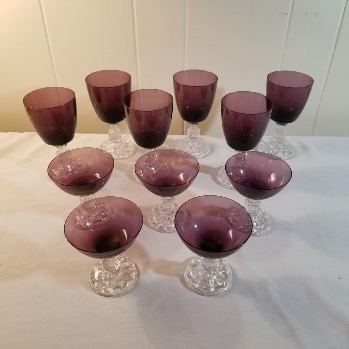 Six wine and five champagne glasses with clear bases and amethyst color tops. Patterned base appears to be glass and tops appear to be crystal. Wine glasses are 6"h and champagne are 4"h. No nicks or chips, items are in excellent condition. See photos for details. Shipping available.