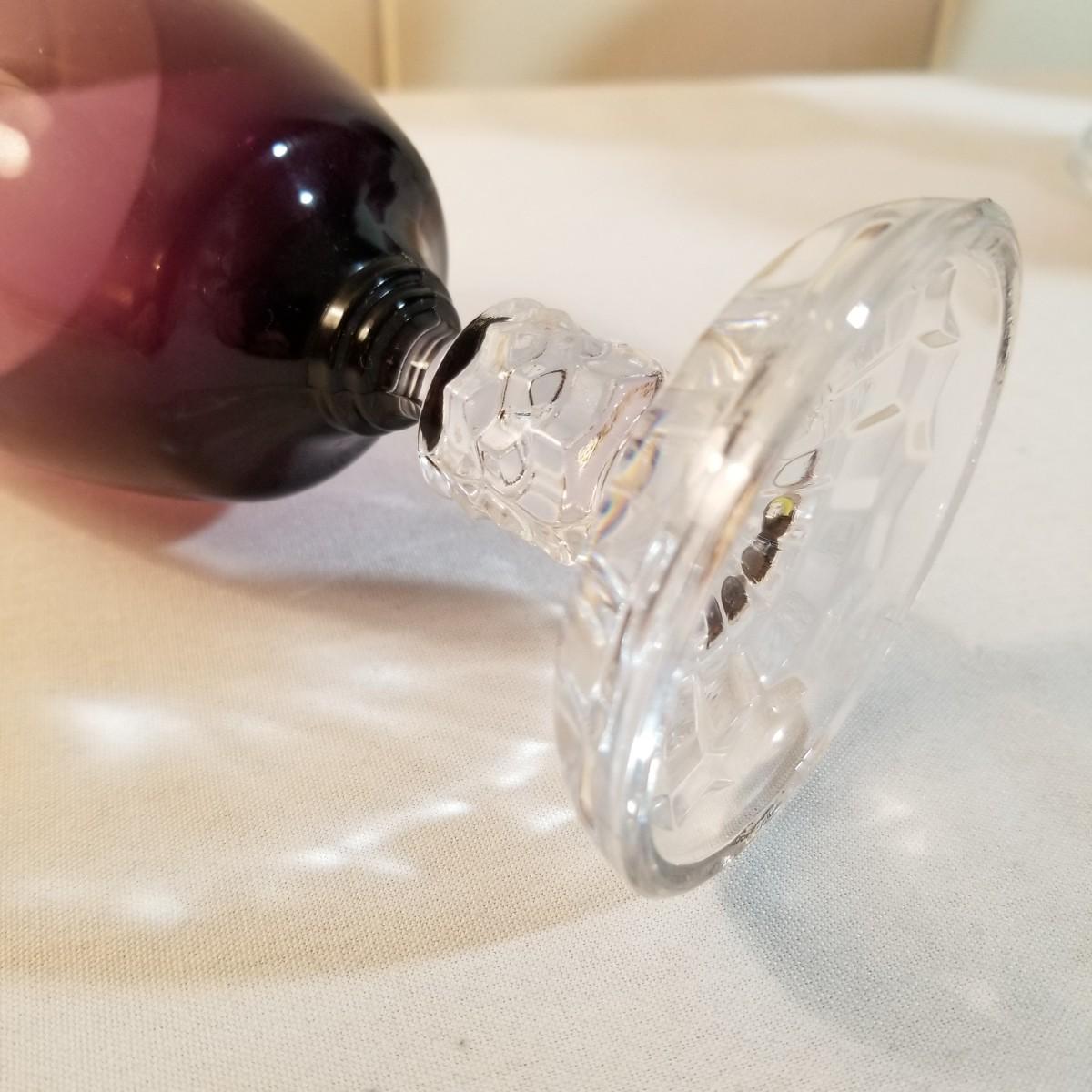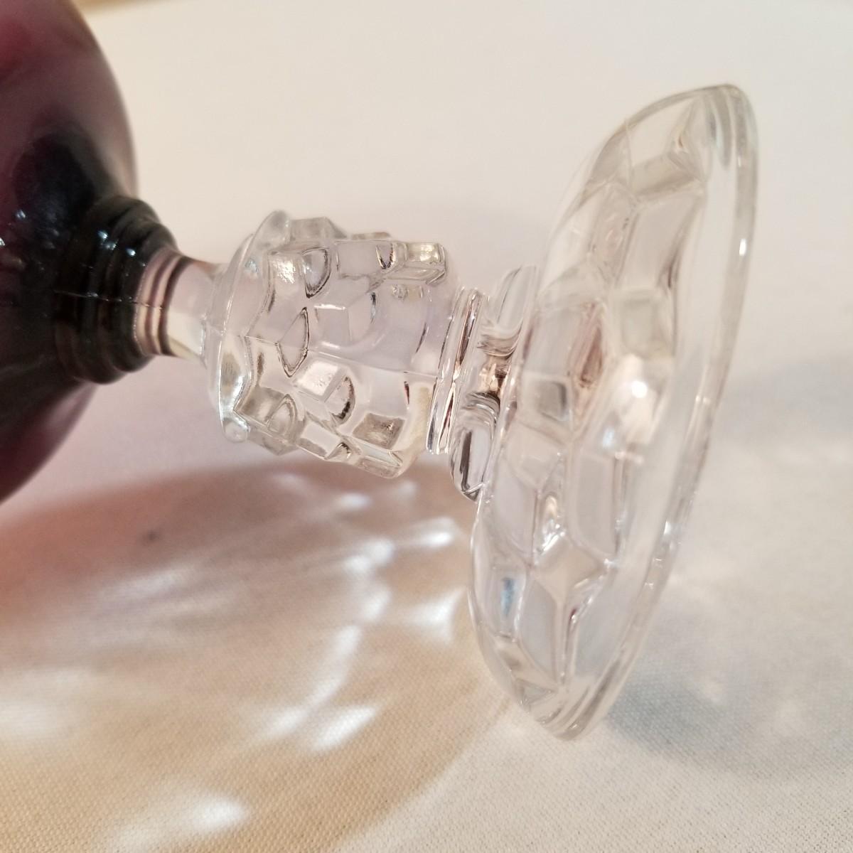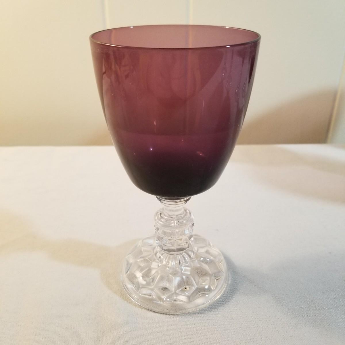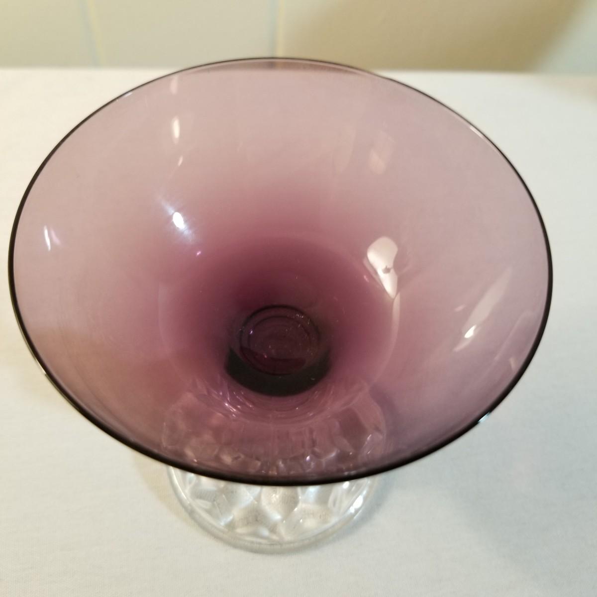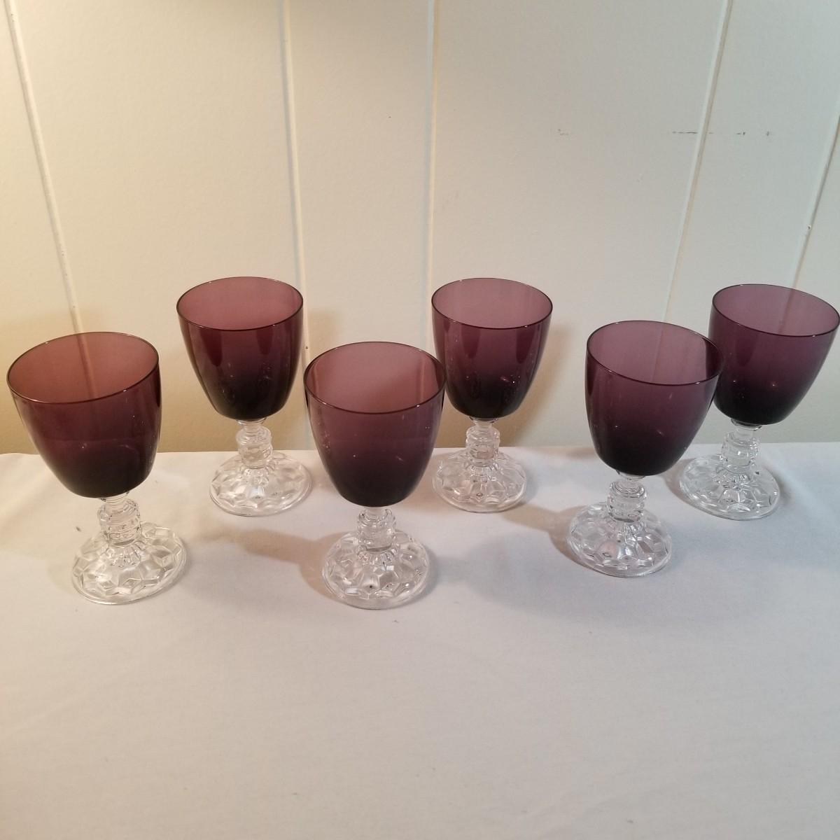 Six wine and five champagne glasses with clear bases and amethyst color tops. Patterned base appears to be glass and tops appear to be crystal. Wine glasses are 6"h and champagne are 4"h. No nicks or chips, items are in excellent condition. See photos for details. Shipping available.