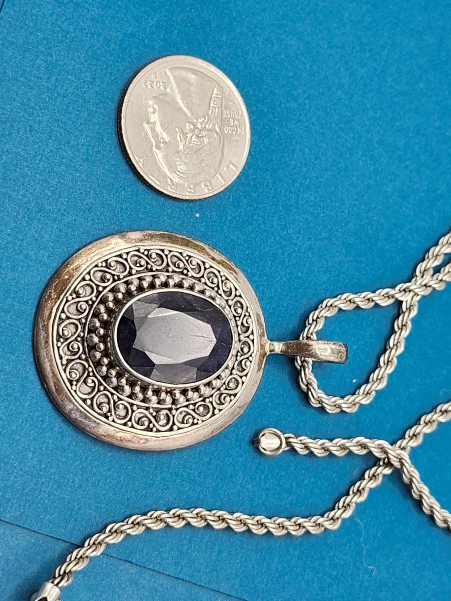 Lovely amethyst set in 925 sterling in an intricate setting. 18 inch chain.