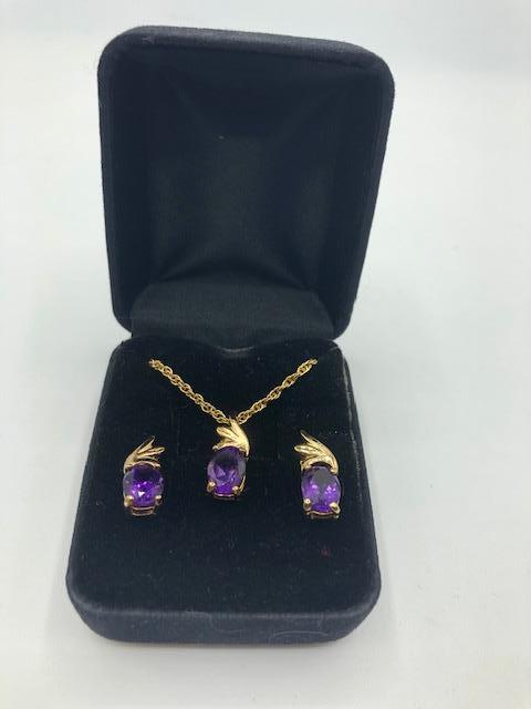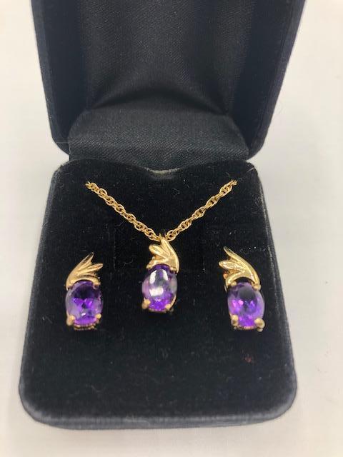 Beautiful Amethyst Jewelry set. Pendant necklace and earrings. Goldtone setting. Comes in black box, believe it is unworn. Earrings are for pierced ears. Pendant & earrings are all 5/8" in length.