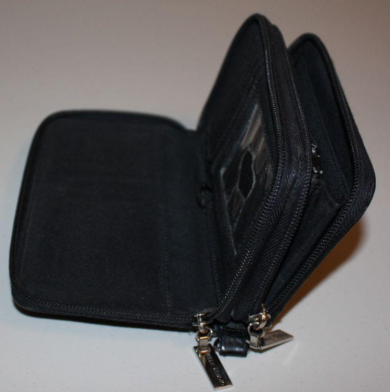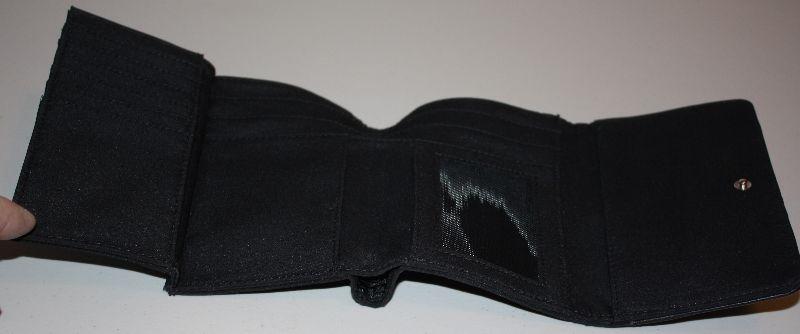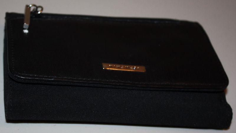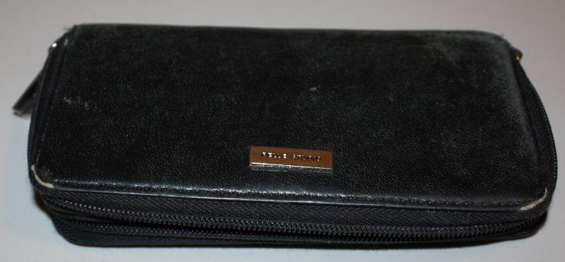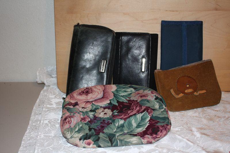 New Amity Canvas wallet, navy blue; Make up bag with flowers; Nine west new black wallet; Pelle Studio by Wilson Leather, black wallet; tan suede coin purse with zipper