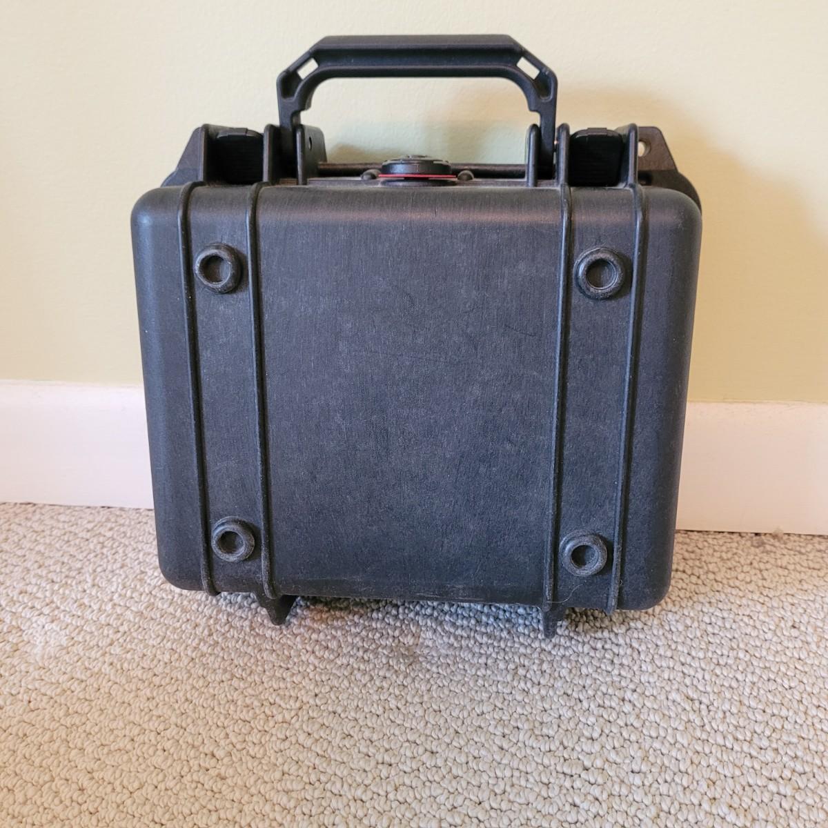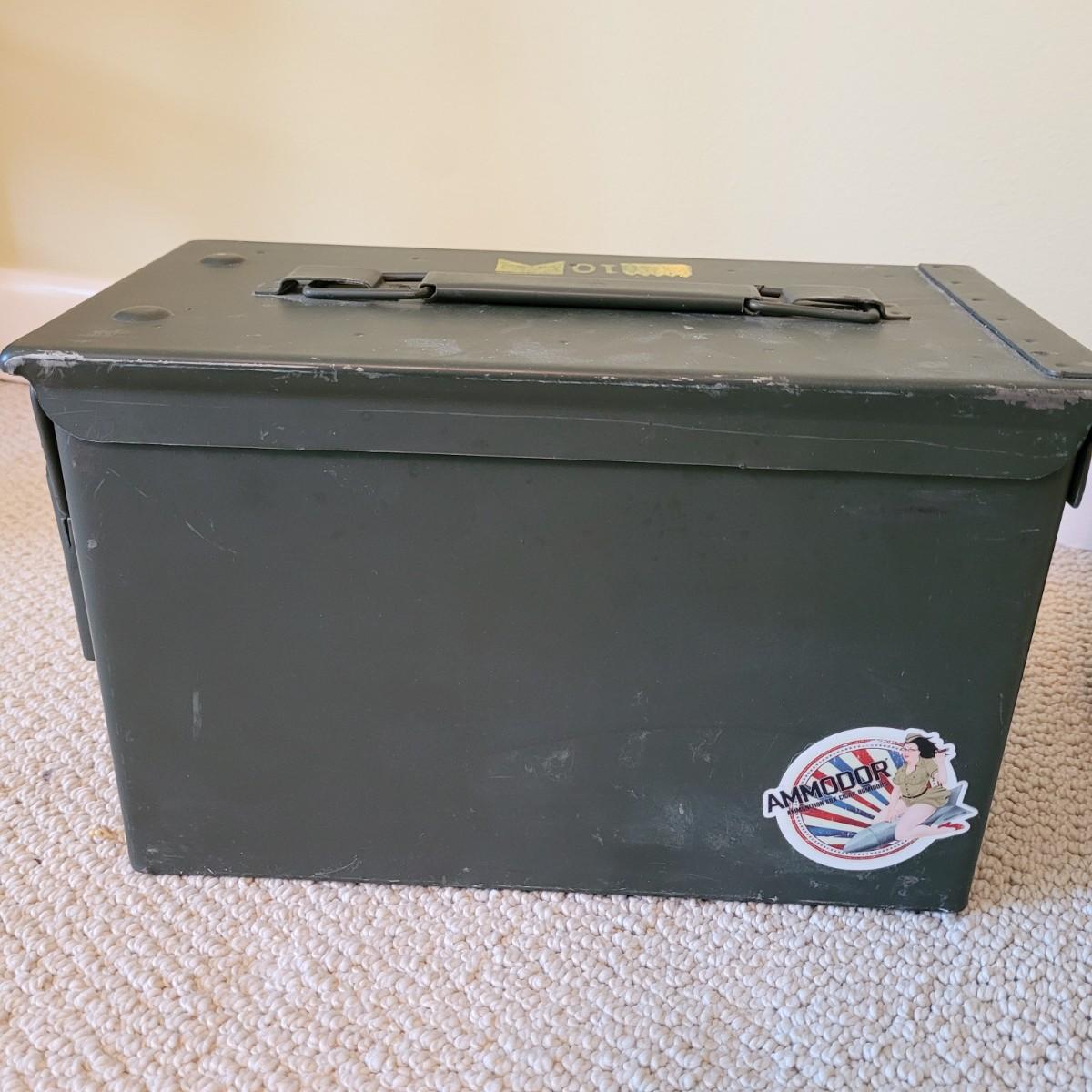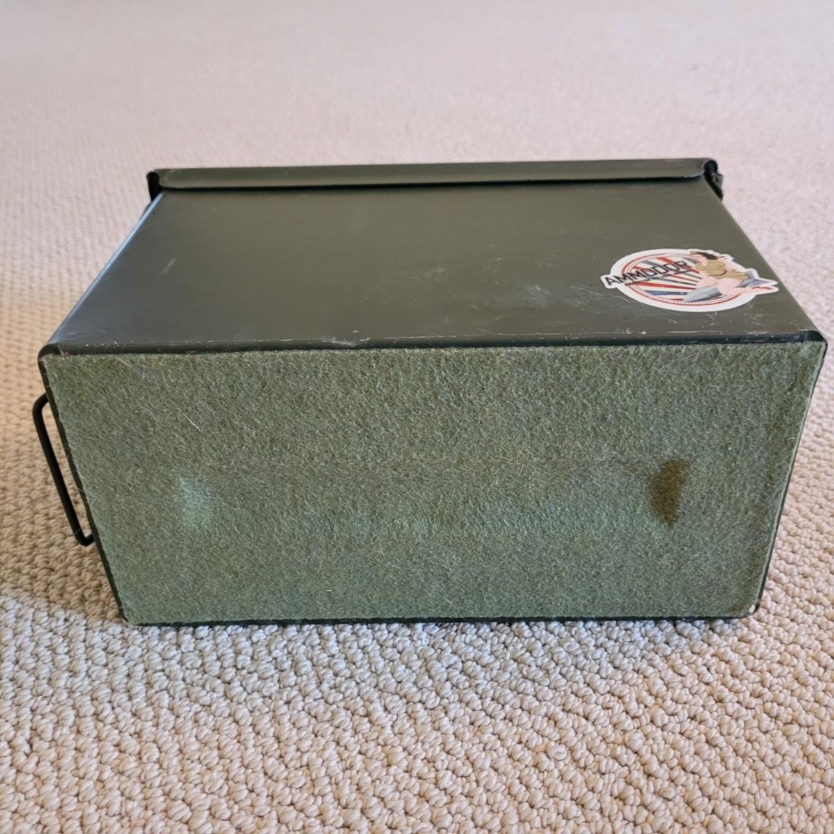 This lot includes an Ammodor ammo box cigar humidor, made from military surplus metal ammunition can, with a wooden interior, and a rugged, waterproof Pelican 1200 hard plastic storage case with foam interior. The Ammodor case measures approximately 12" x 6" x 7", Pelican case 11" x 5" x 10". Shipping available.