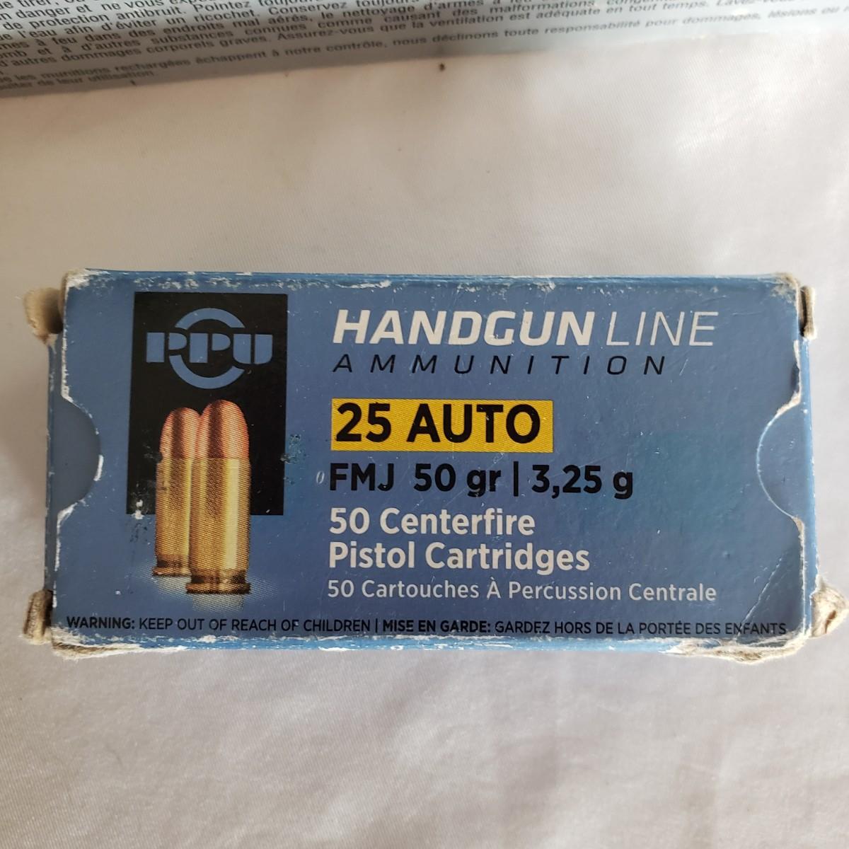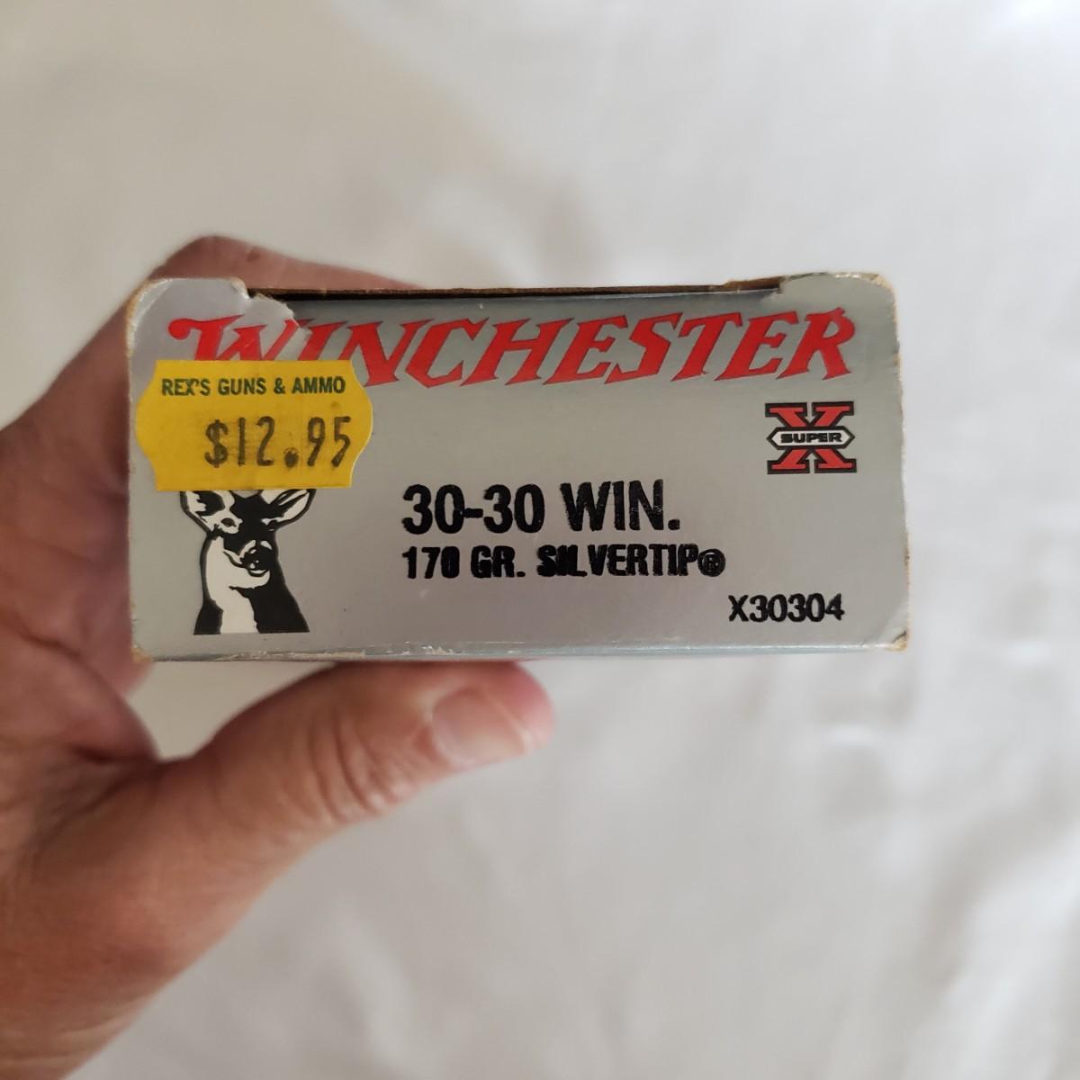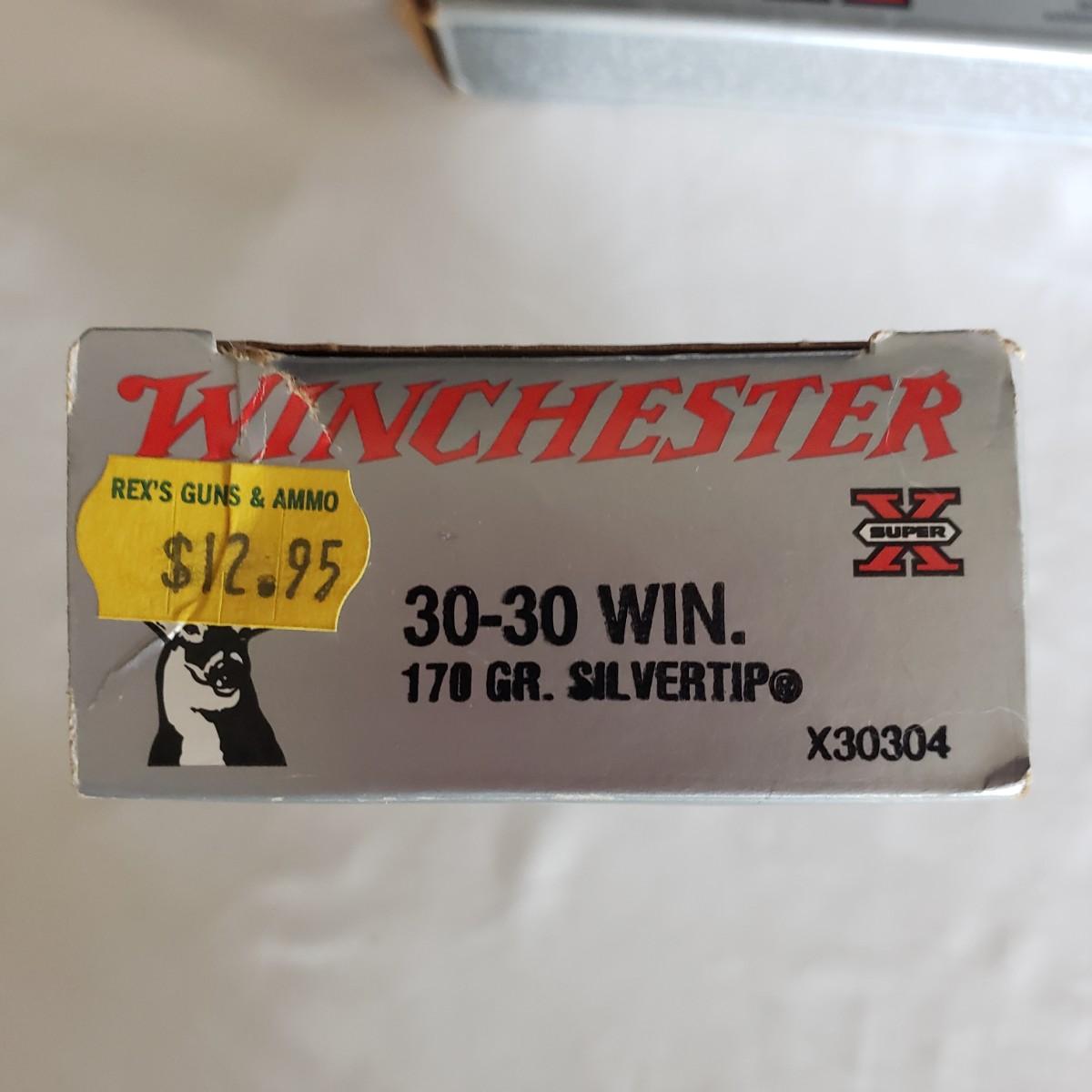 Two boxes of Winchester 30-30 caliber, 170 grain. One partial box of PPU-25 caliber, 50 grain bullets. There is also a bag of random, loose bullets, some are 22 caliber.