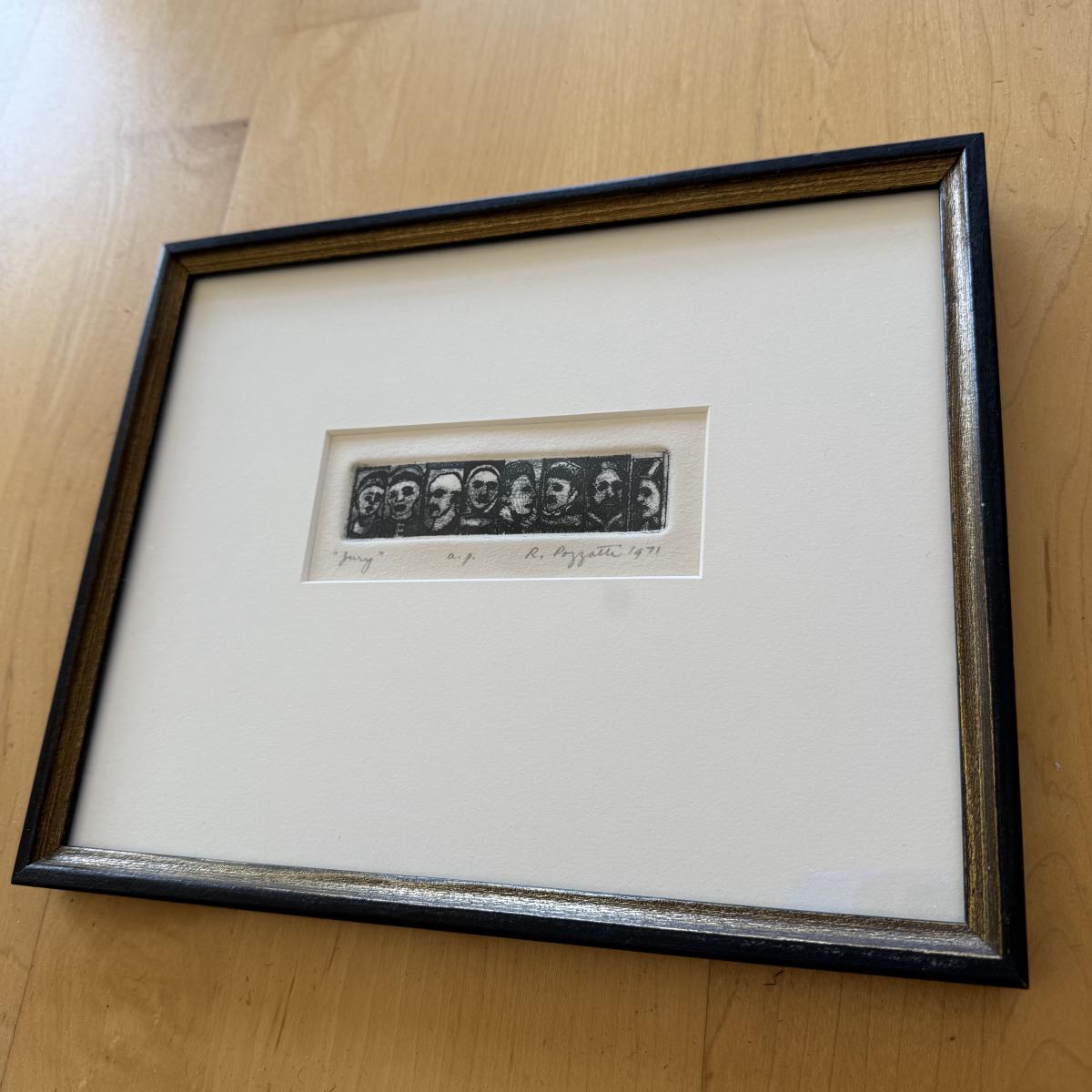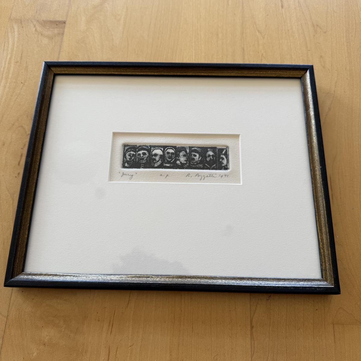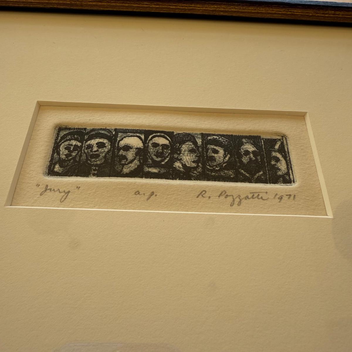 This lot contains two pencil signed and numbered prints, signed "R. Pozzatti", indicating artist Rudy Pozzatti. One of a man's profile sits behind glass in a silver wooden frame that measures 10.5” x 11.5” and has hardware to be hung. This piece is numbered and appears to be pencil signed and dated by the artist. The next item appears to be an artist's proof etching called “Jury” by the same artist. This piece is also appears to be signed and dated by the artist. "Jury" is behind glass in a wooden frame that measures 10.25” x 8.5” and also has hardware to be hung. Shipping available.