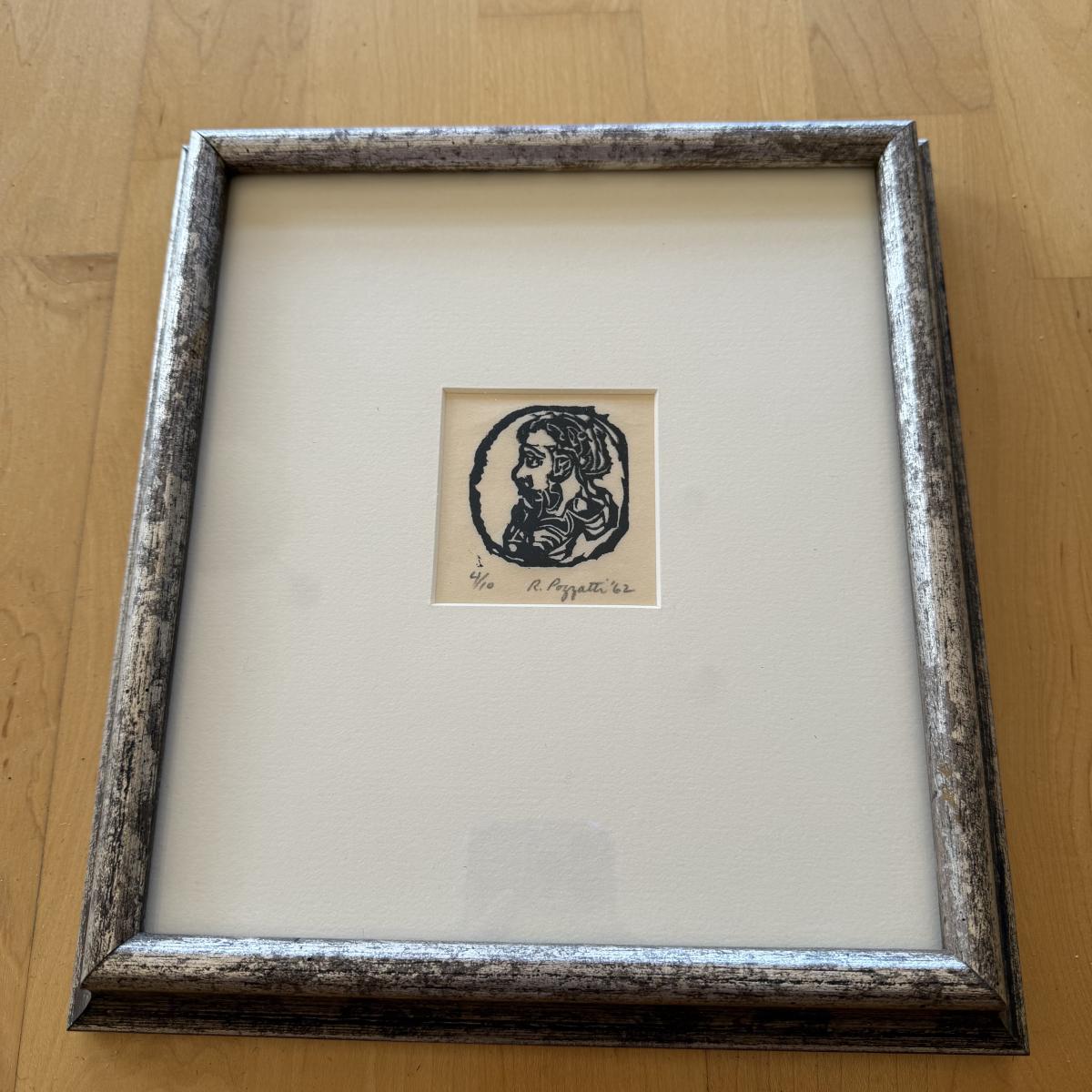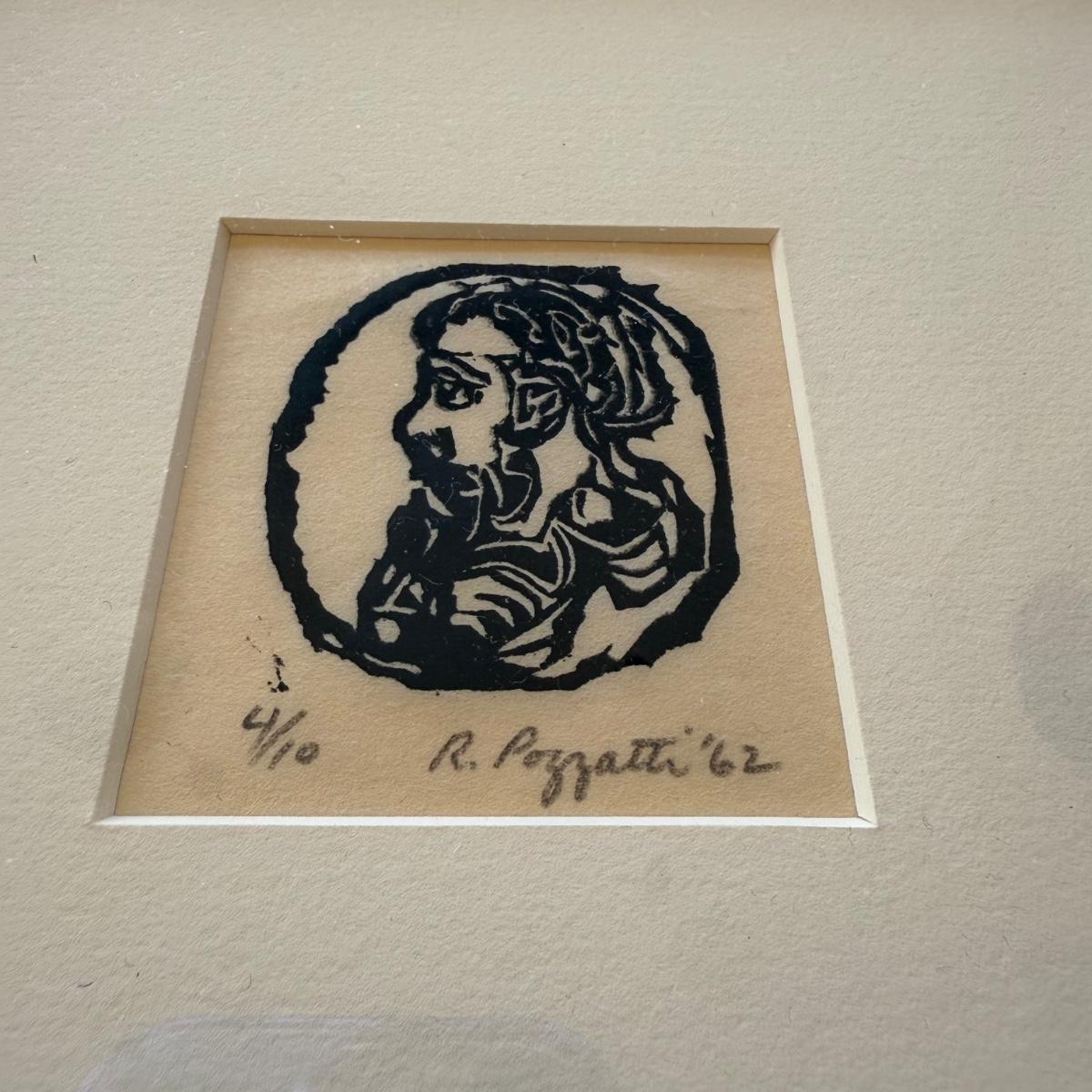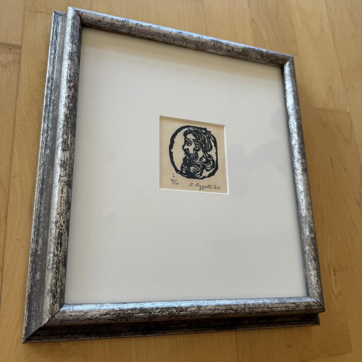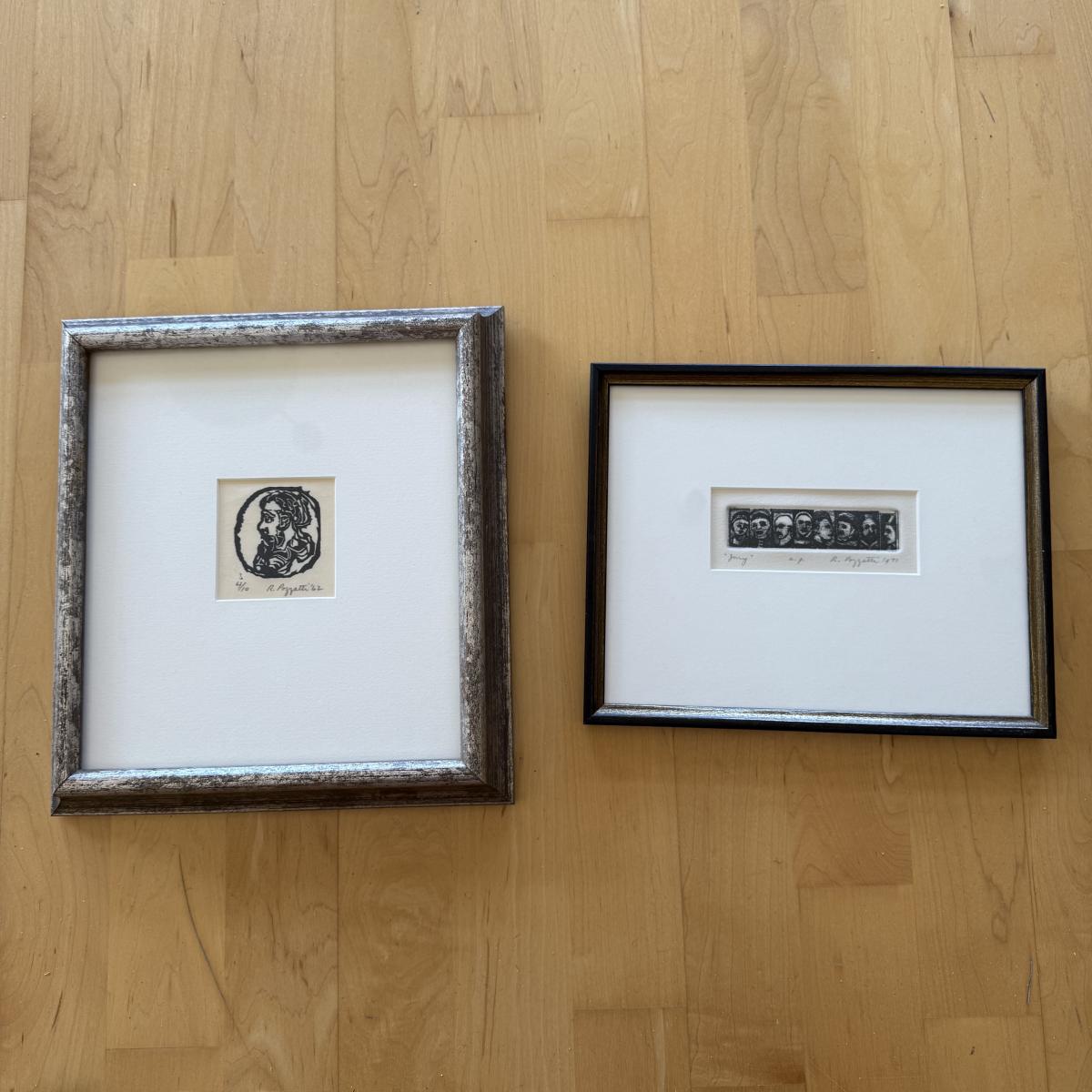 This lot contains two pencil signed and numbered prints, signed "R. Pozzatti", indicating artist Rudy Pozzatti. One of a man's profile sits behind glass in a silver wooden frame that measures 10.5” x 11.5” and has hardware to be hung. This piece is numbered and appears to be pencil signed and dated by the artist. The next item appears to be an artist's proof etching called “Jury” by the same artist. This piece is also appears to be signed and dated by the artist. "Jury" is behind glass in a wooden frame that measures 10.25” x 8.5” and also has hardware to be hung. Shipping available.