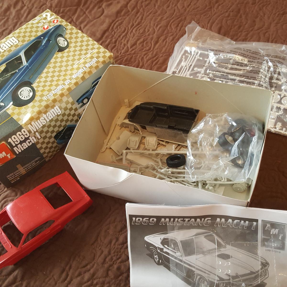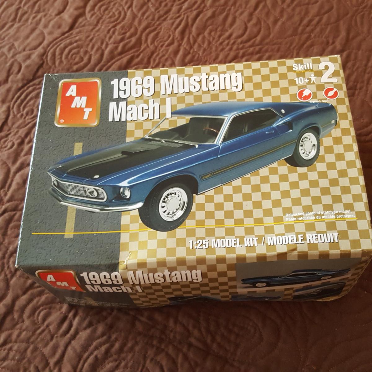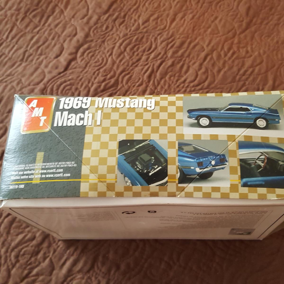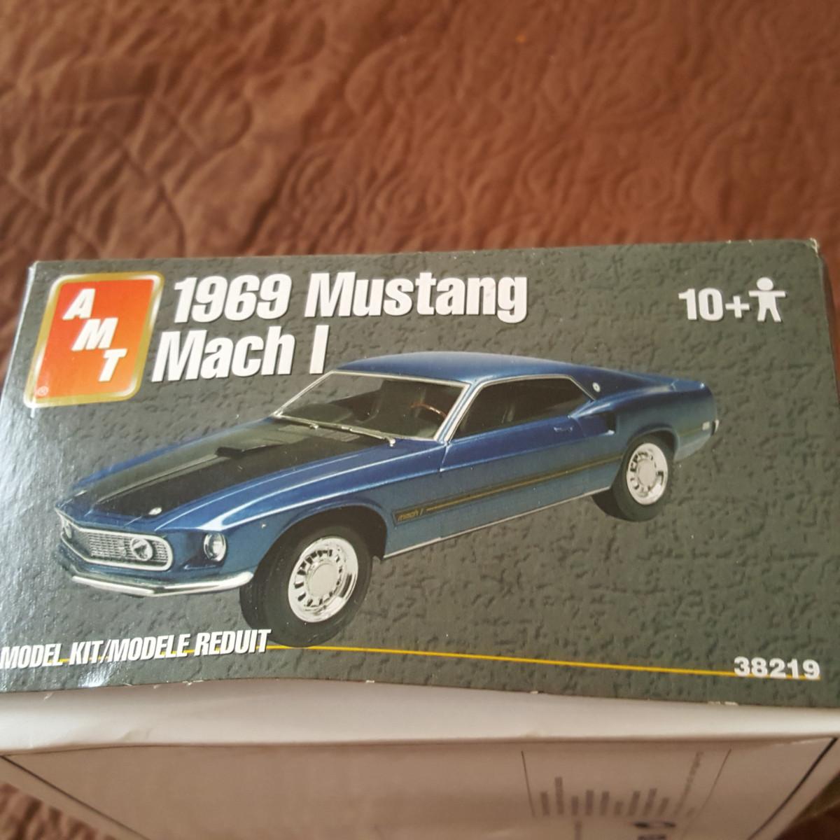 This auction lot is for a AMT 1969 Mustang Mach 1 Model Kit. This kit has a copyright date of 2005. It has been partially constructed with some levels of painting on some parts. Most parts are still attached to the molding stems. We have not verified that all parts are included in the kit. The box was stored in an outdoor shed and has some weathering and watering marks and residue.