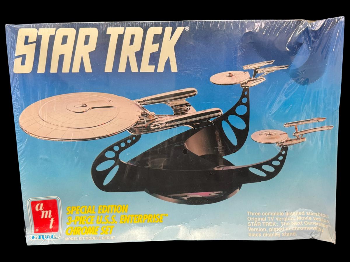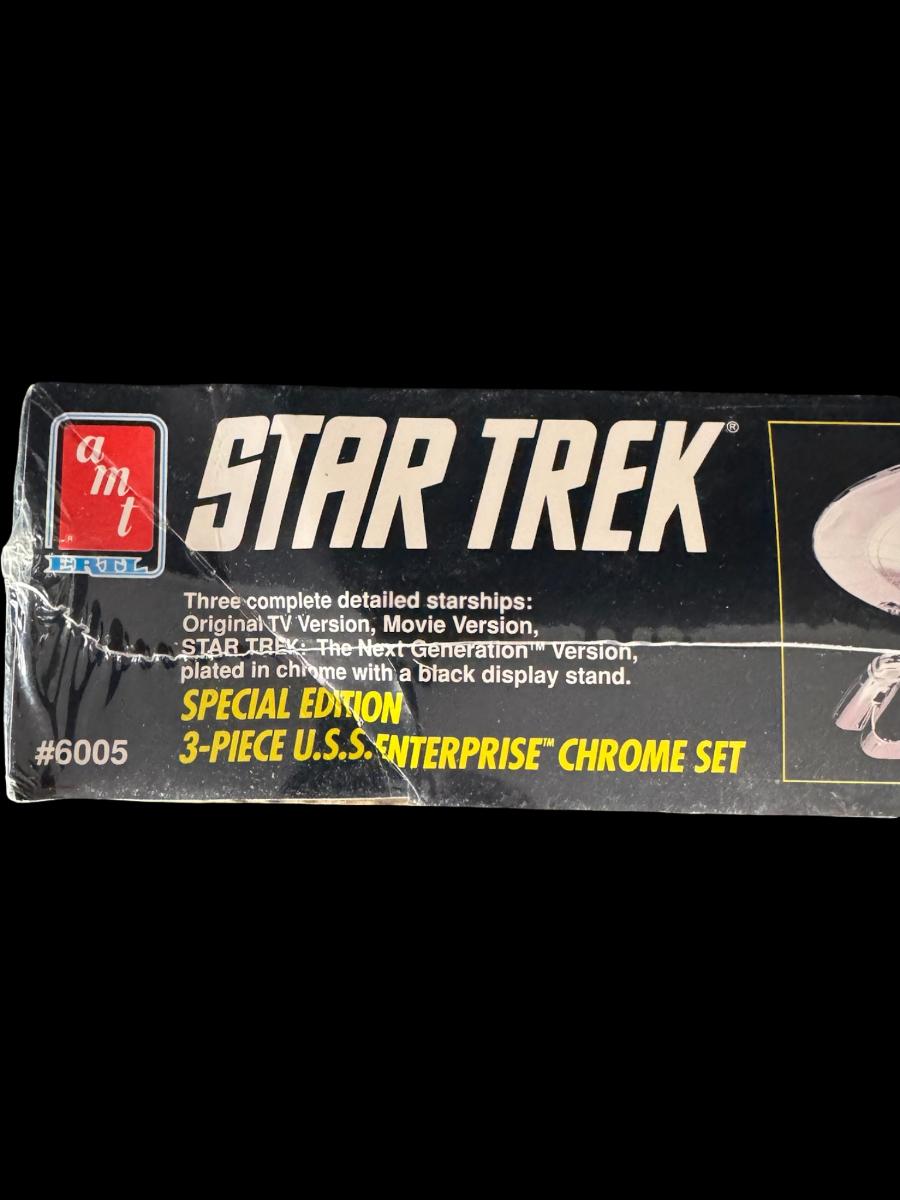 NOS. This is a three-piece chrome set, and includes three complete detailed starships plated in chrome with a black display stand. In the original unopened packaging. The box has storage related wear.