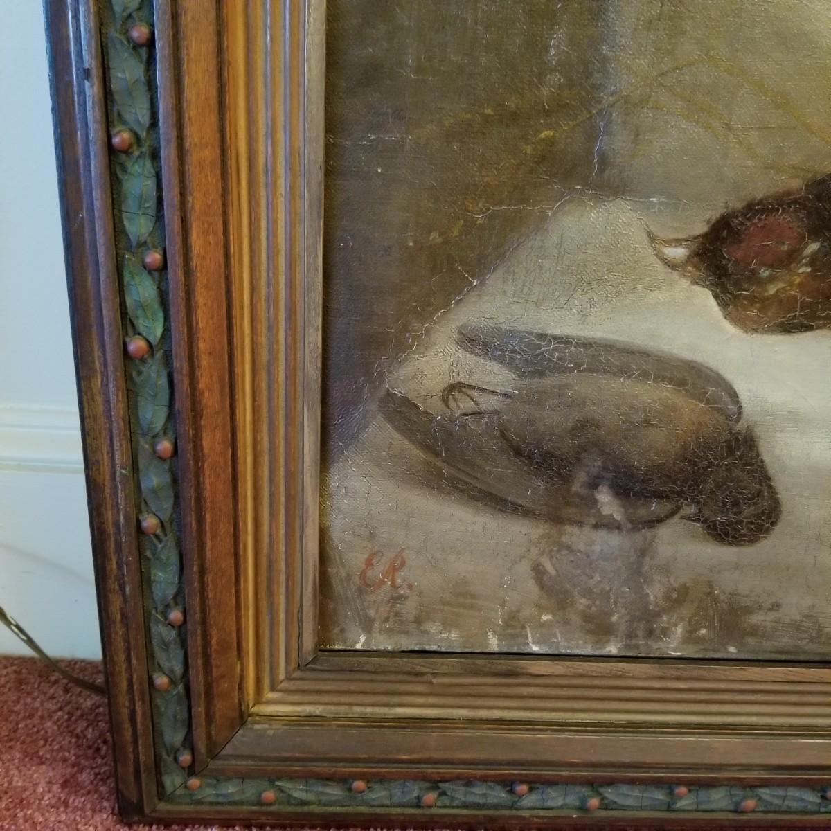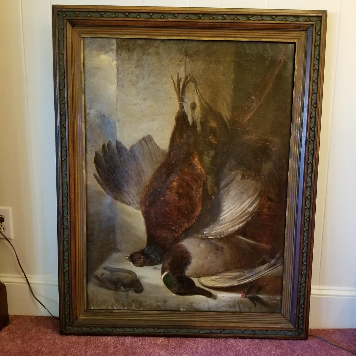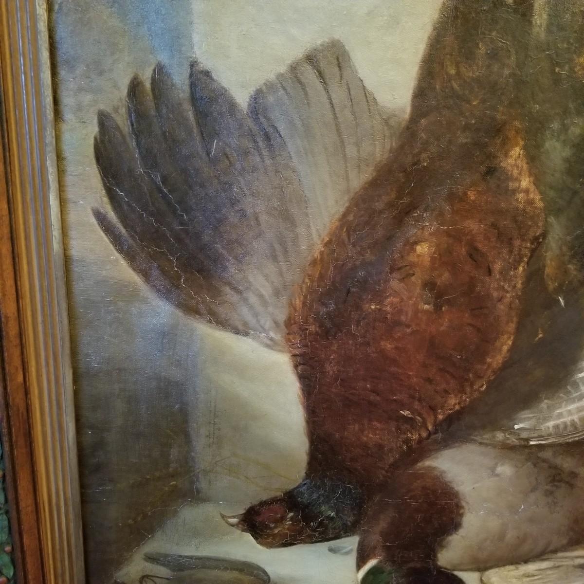 Antique oil painting on canvas of wildfowl game. Signed and dated by English artist Emily Robinson, in wood frame on stretched canvas. Has signature/date on front and also info on back of frame. See photos for specific details. Canvas is cracked in spots and there is also some missing pieces within the frame borders. Piece overall in good condition, consummate to its age . Shipping available. Shipping Art can be costly please call UPS store at 828-252-6930 for quote.