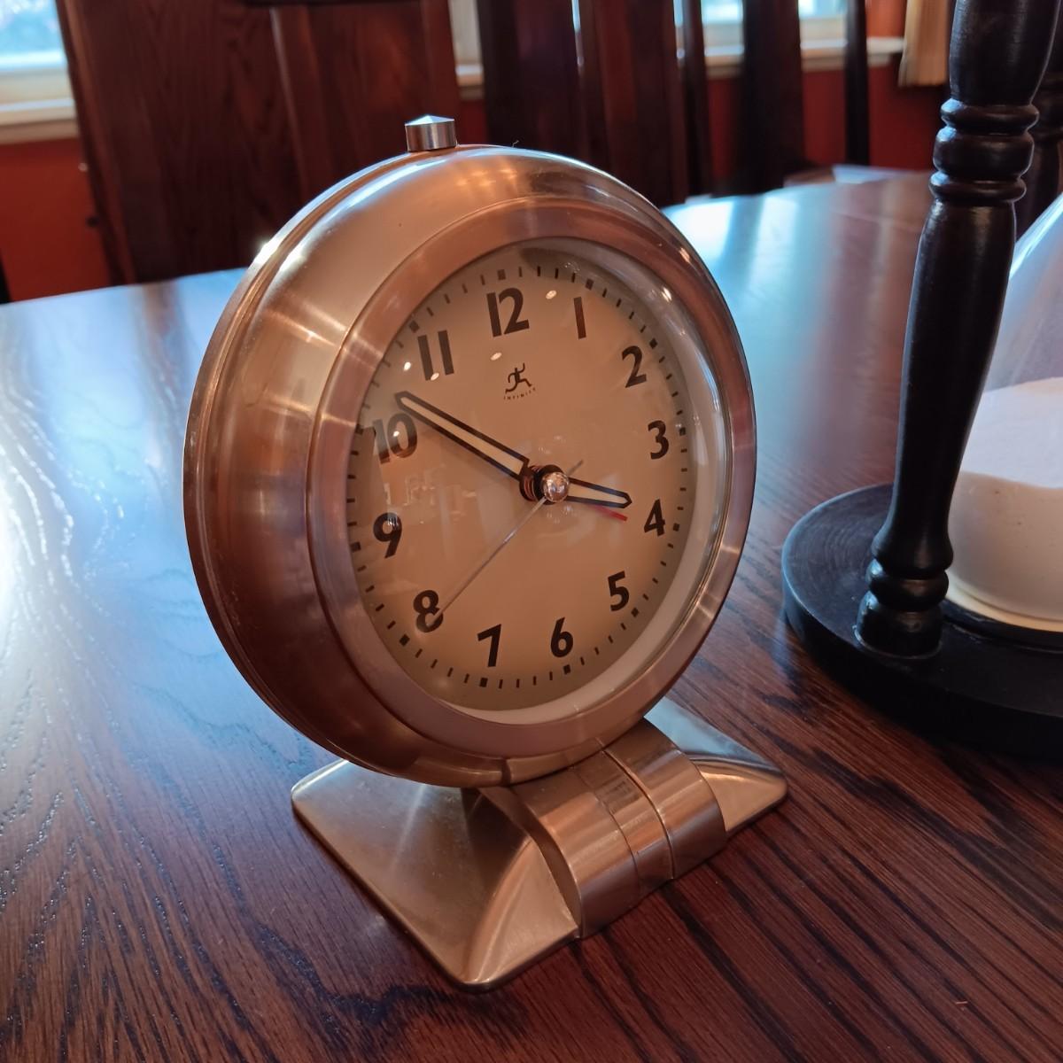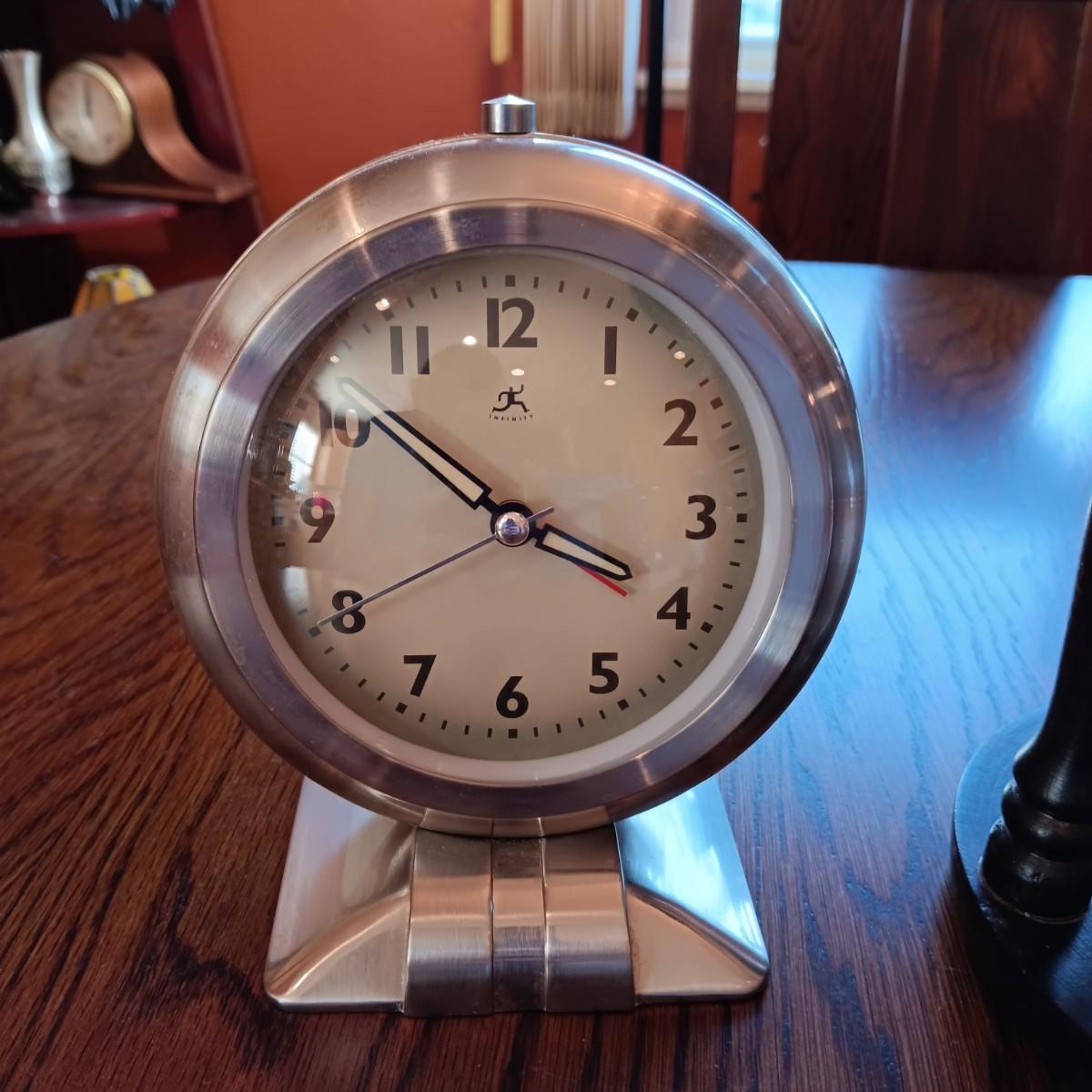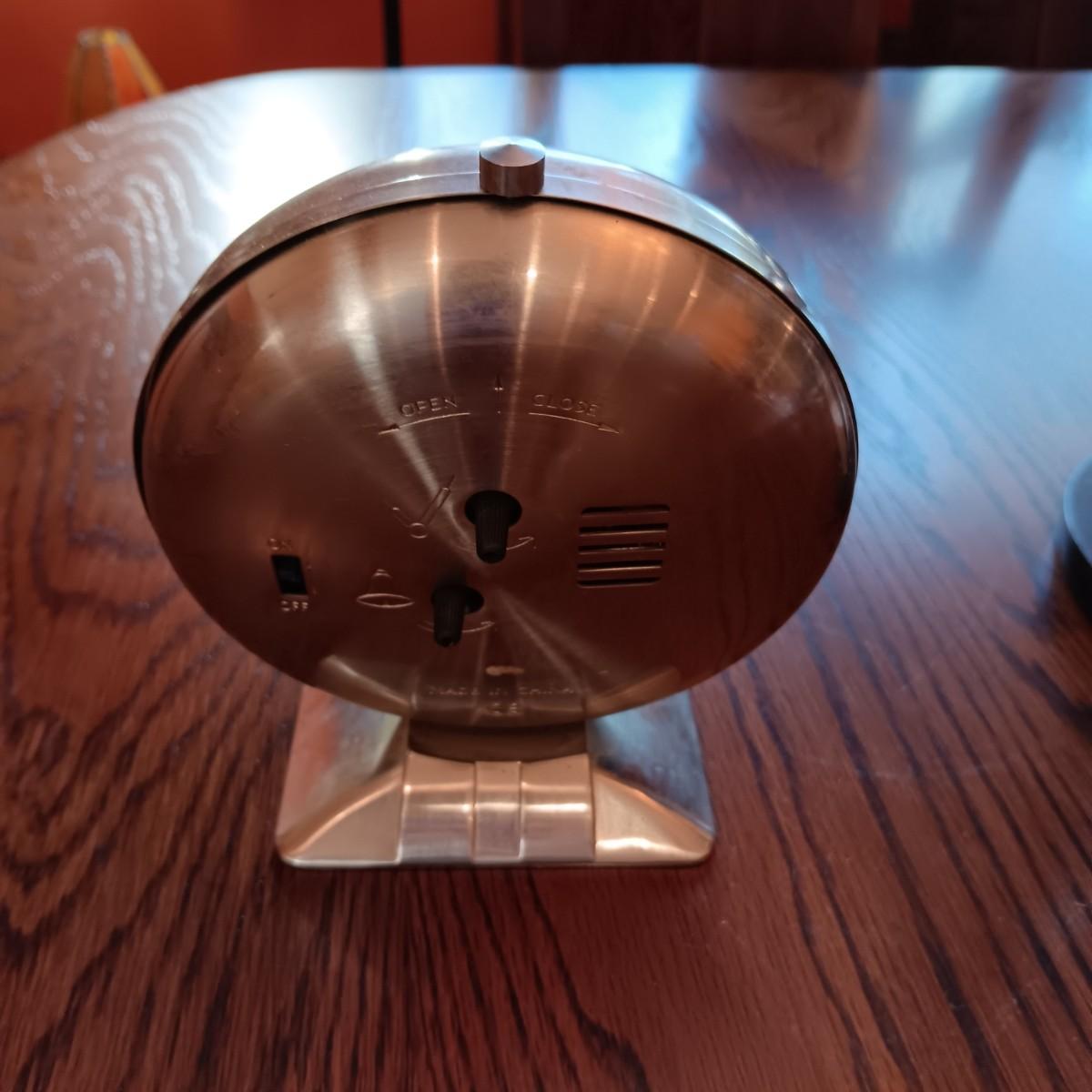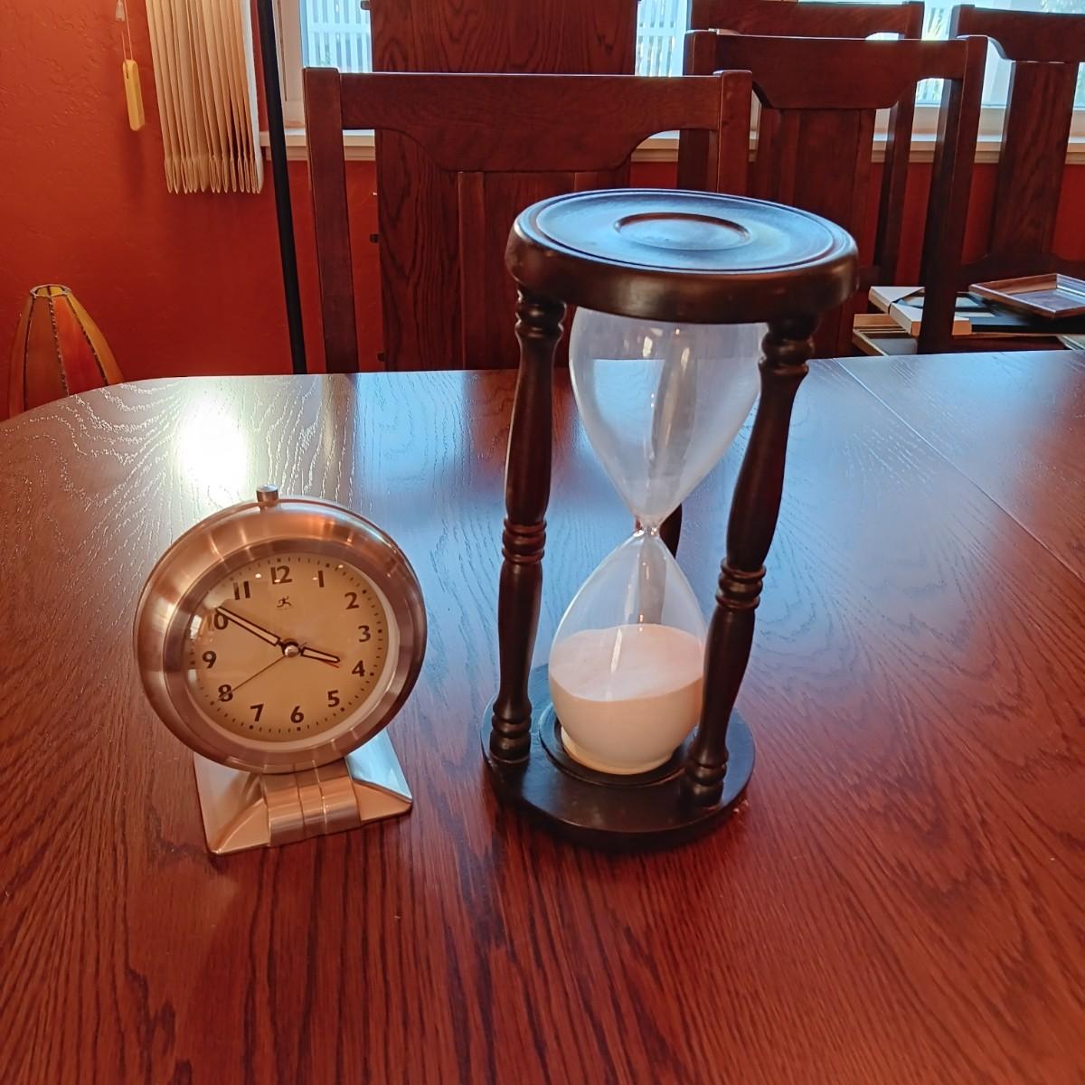 AN ART DECO STYLE ALARM CLOCK AND AN HOUR GLASS