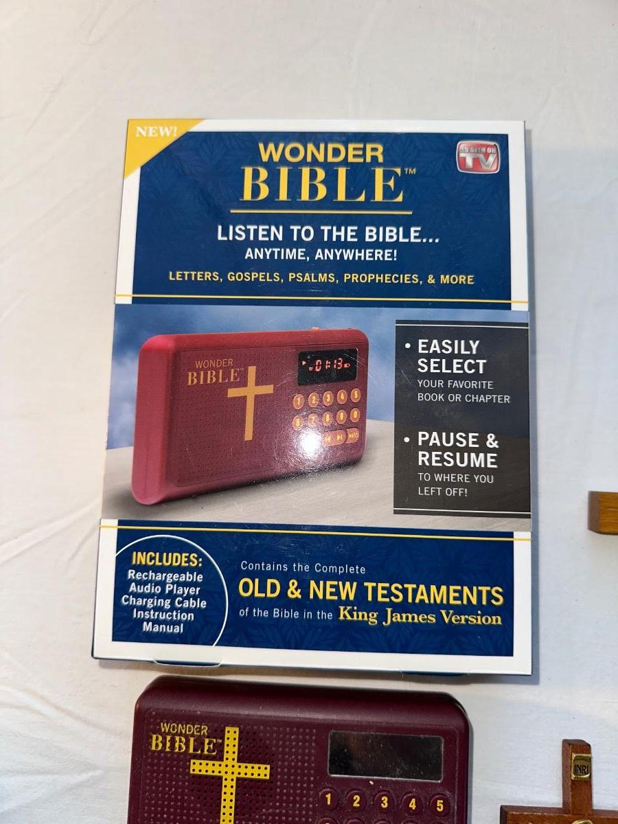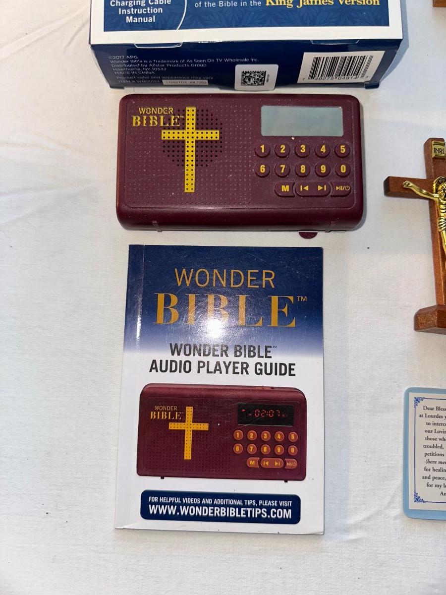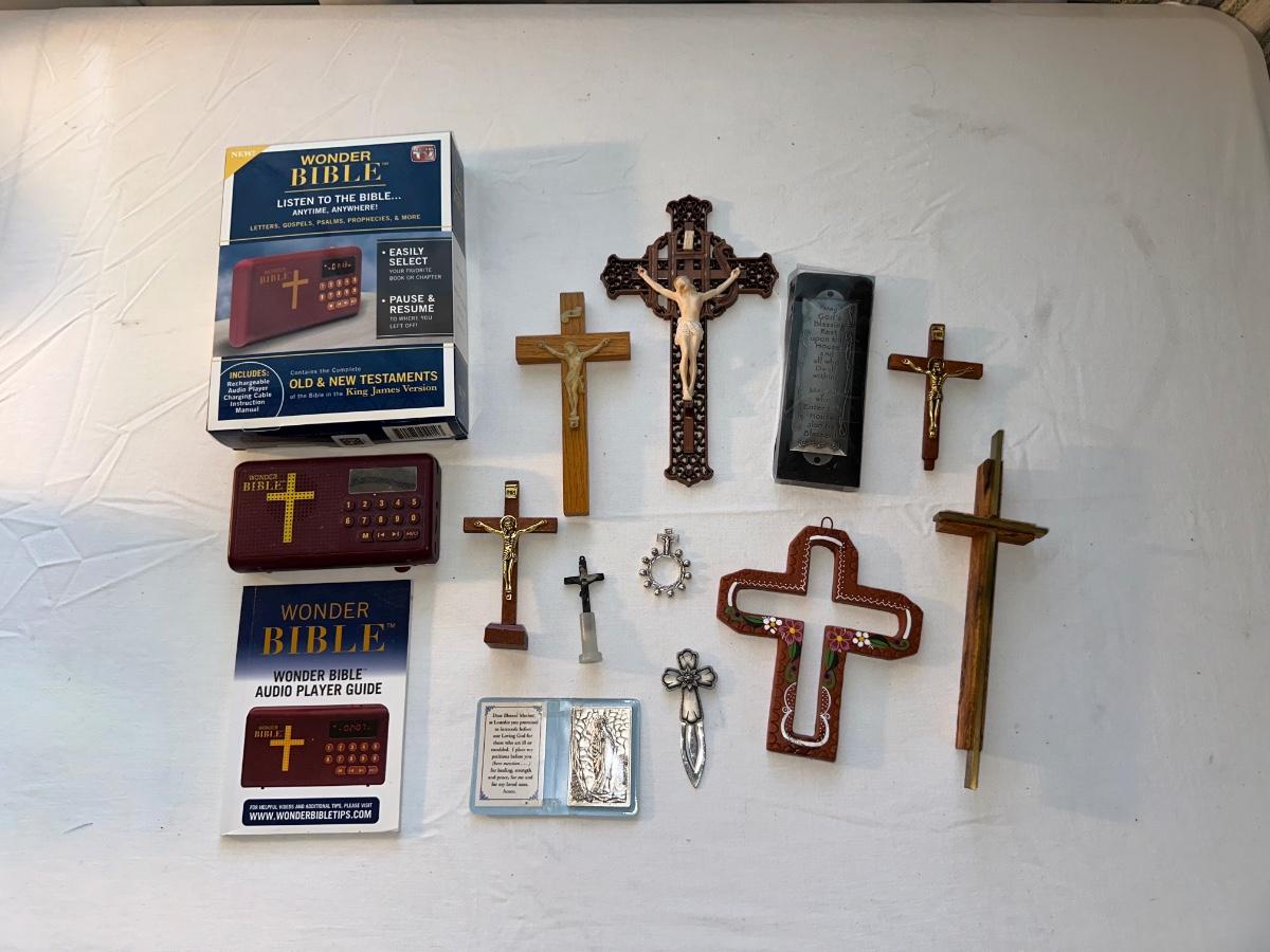 AN ASSORTMENT OF CROSSES AND WONDER BIBLE AUDIO PLAYER