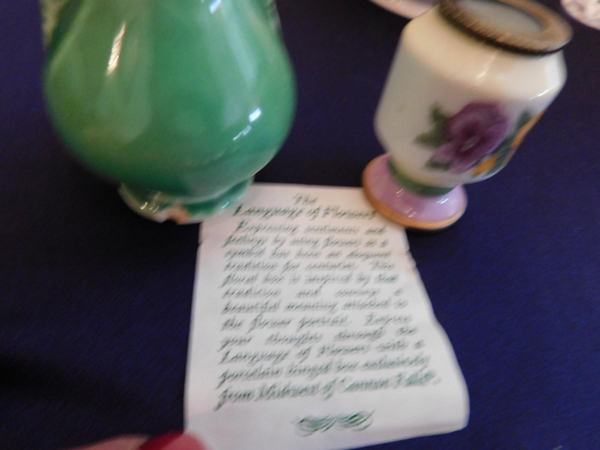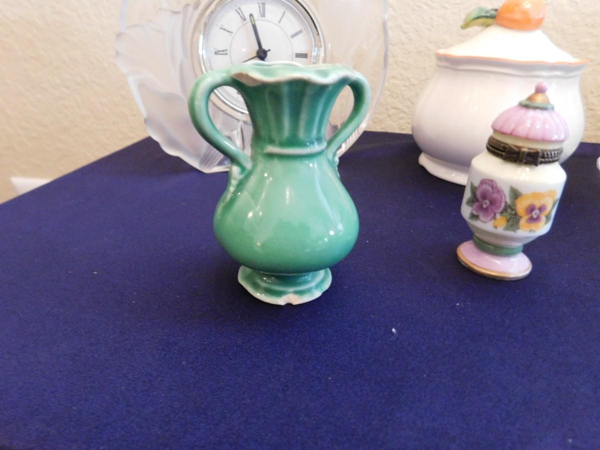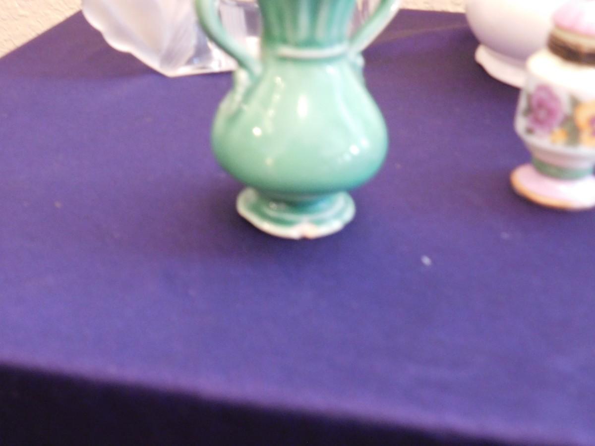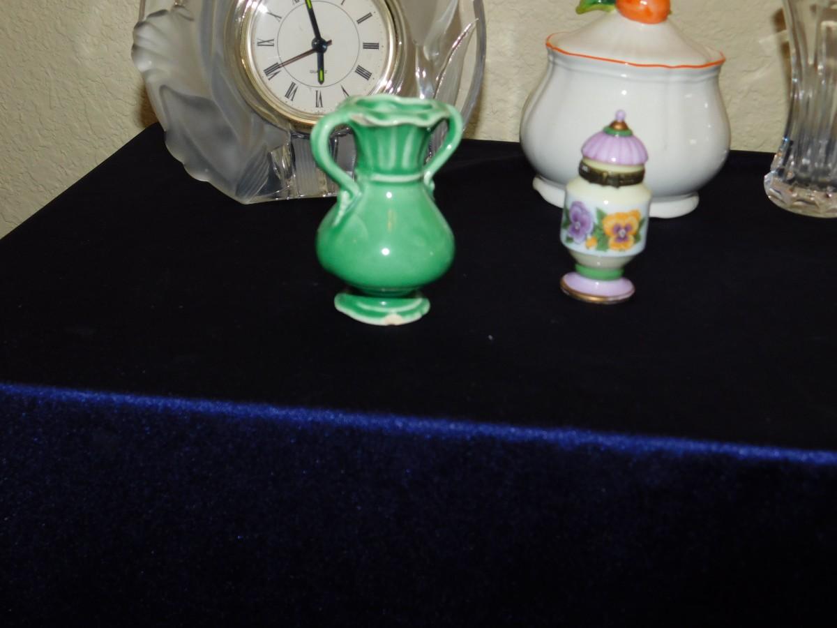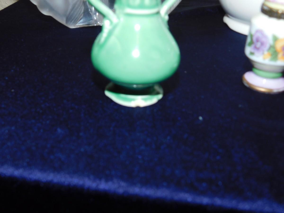 THE SMALL GREEN VASE DOES HAVE SOME CHIPS ON THE BASE BUT IT IS SUPER OLD. SO DO TO ITS AGE, IT MIGHT HAVE A STORY TO TELL