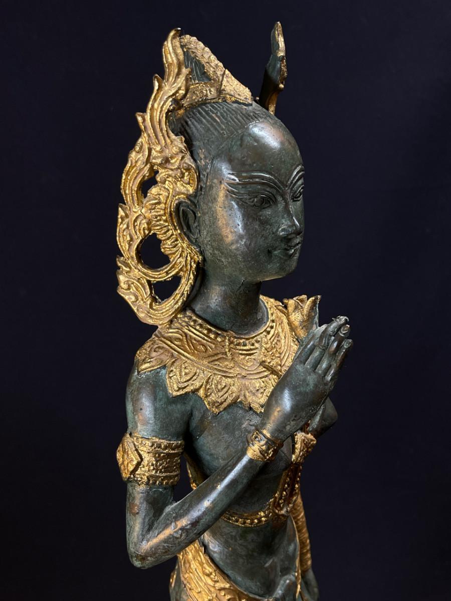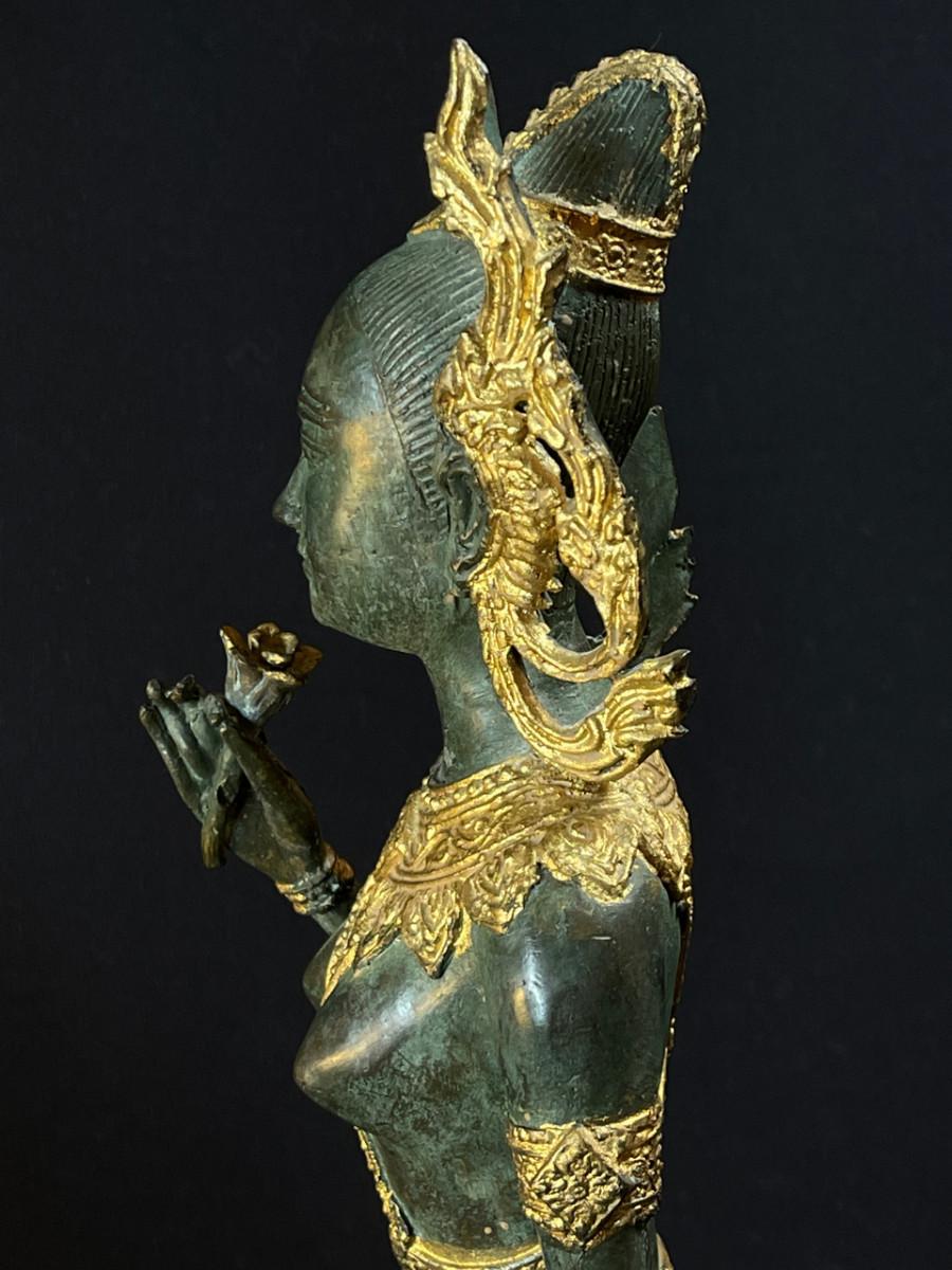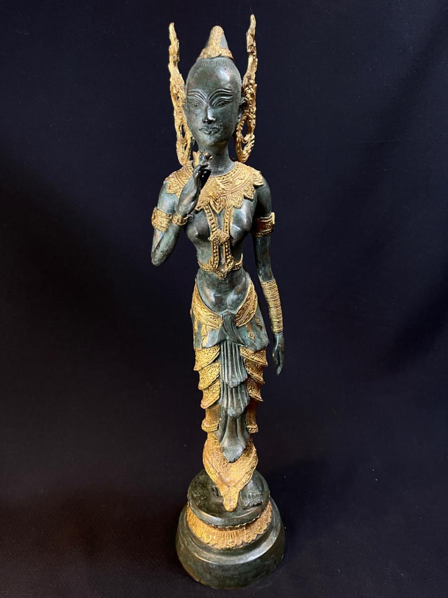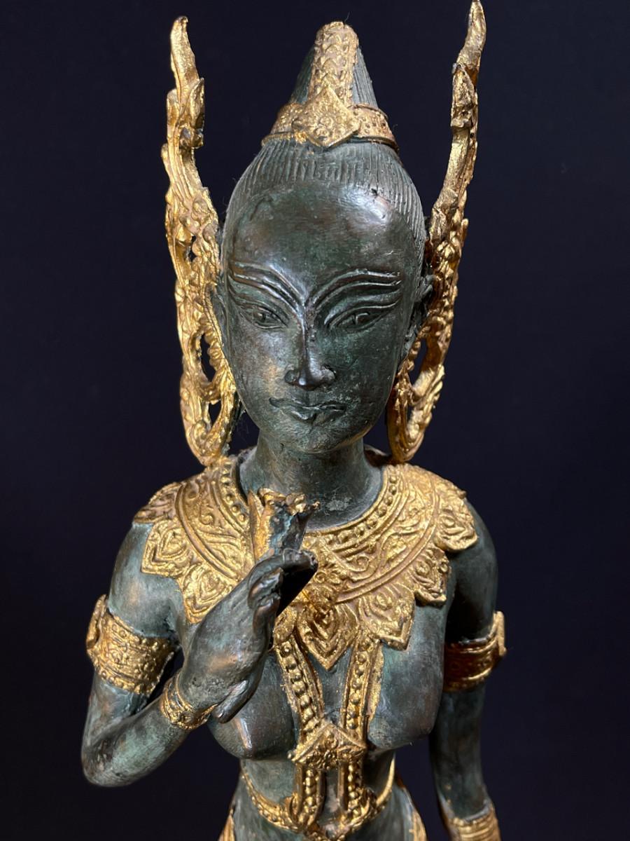 The subject item is a modern interpretation of a Cambodian, Khmer-Style Apsara Figure, finished with a green-toned patina with washed gilding to the costume details.