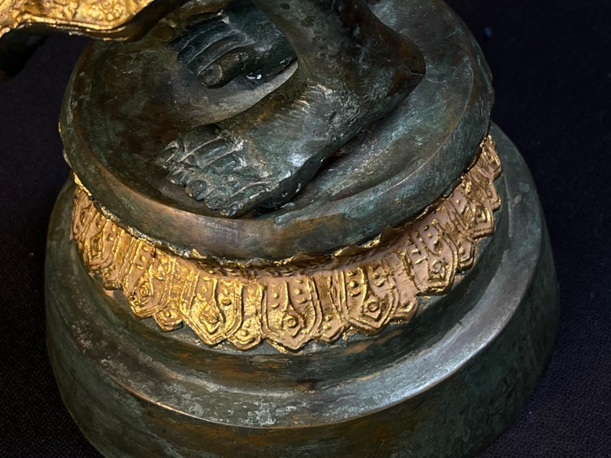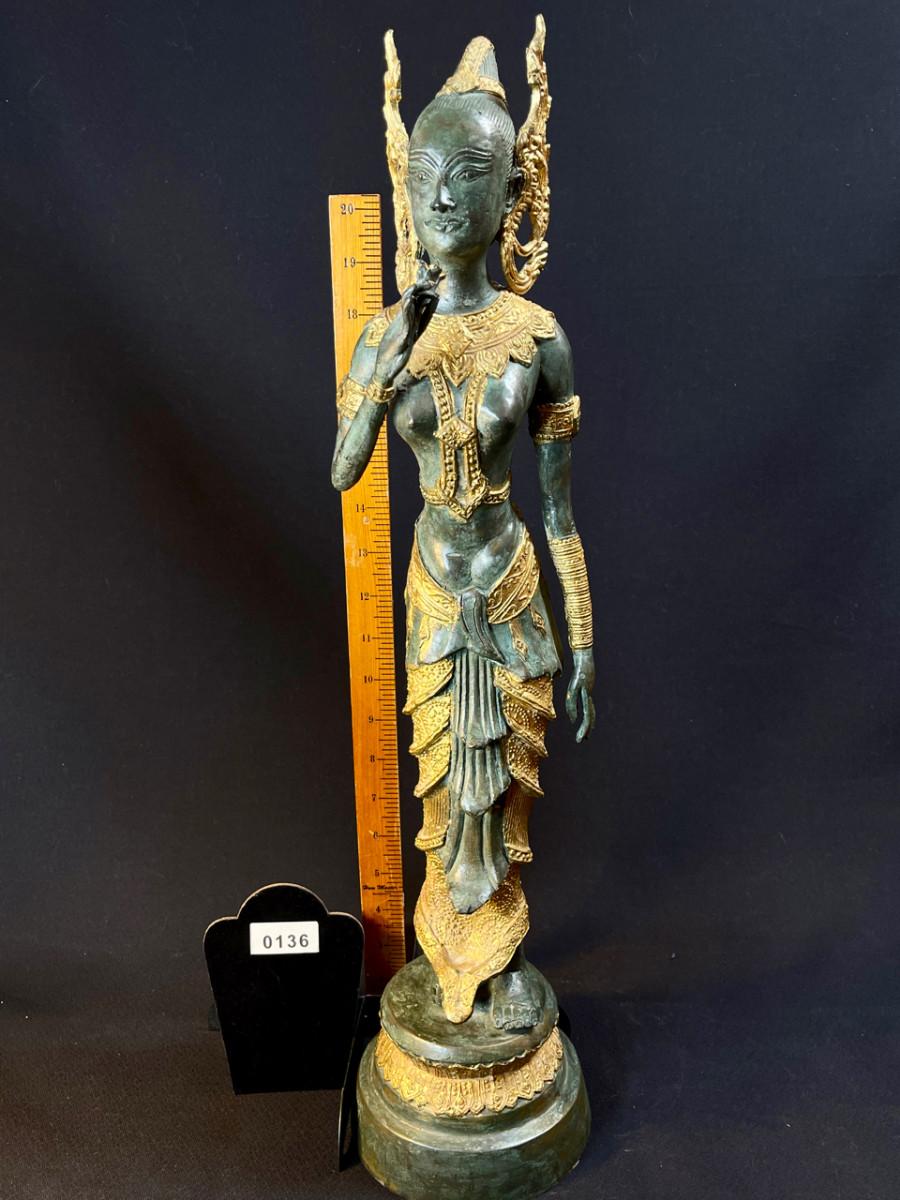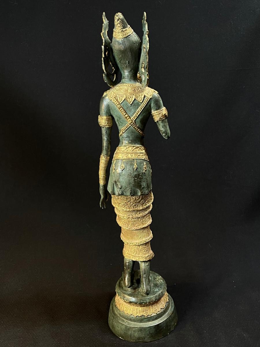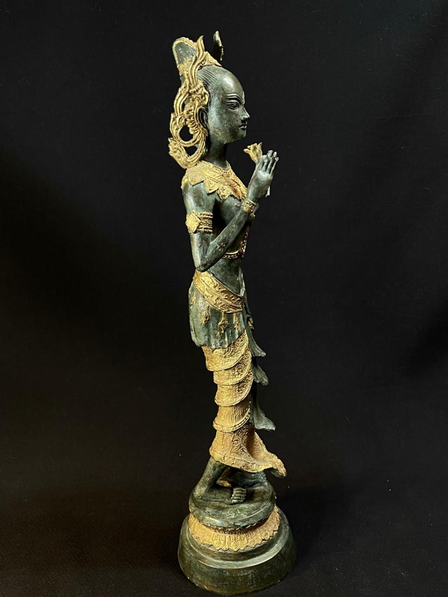 The subject item is a modern interpretation of a Cambodian, Khmer-Style Apsara Figure, finished with a green-toned patina with washed gilding to the costume details.