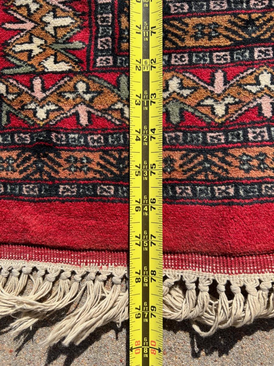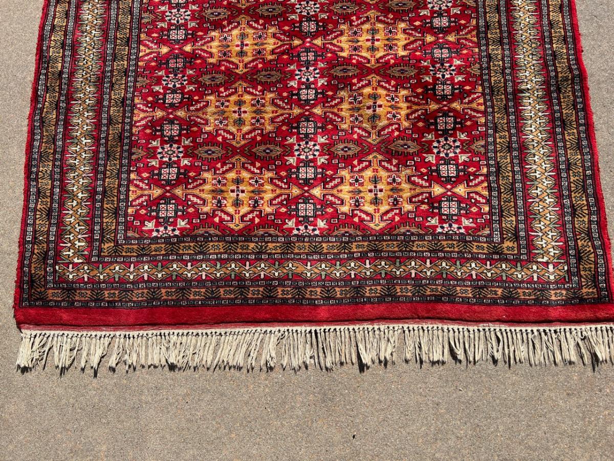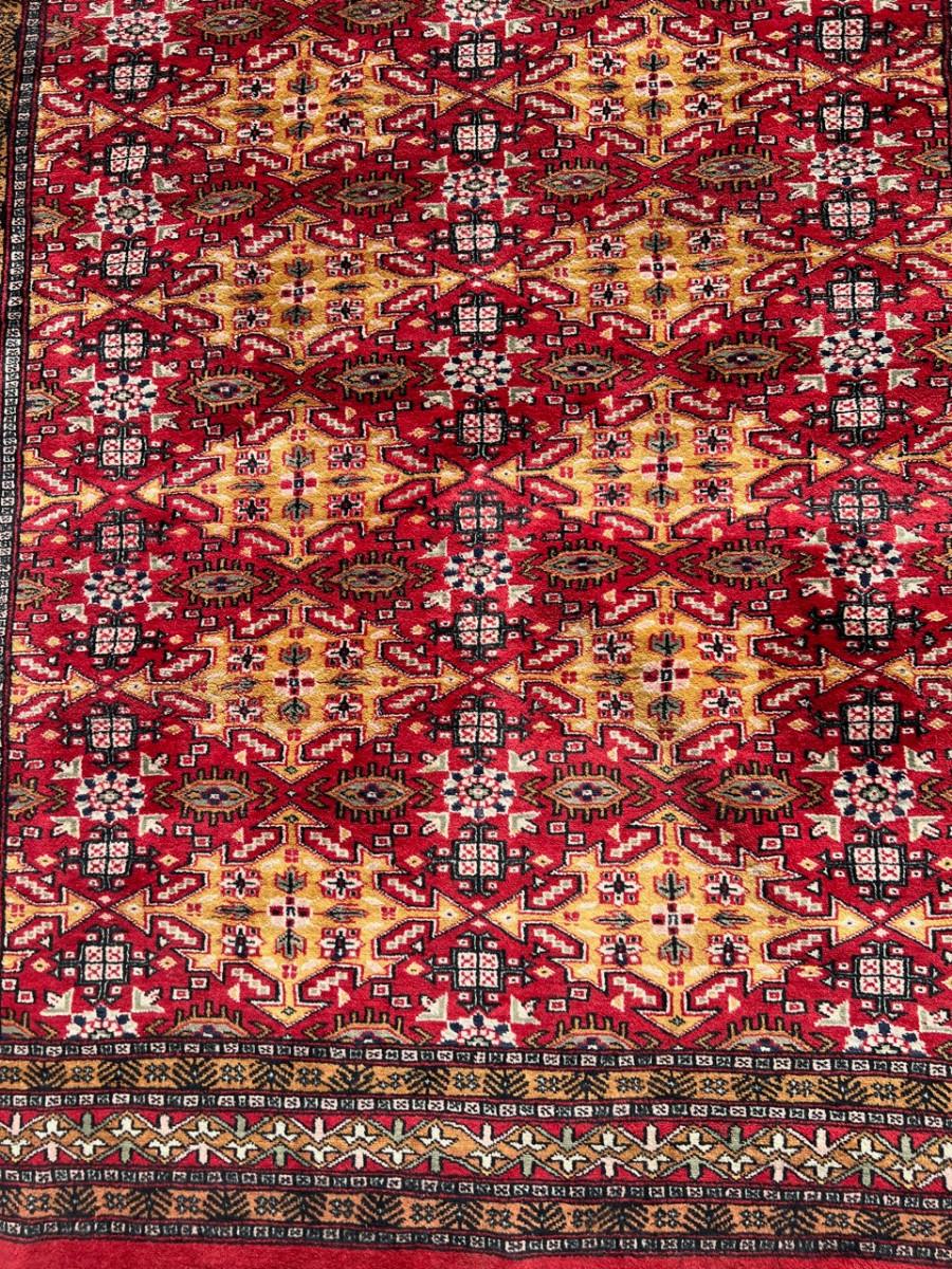 DESCRIPTION: This finely woven rug will own wherever you choose to lay it. The bright, saturated red field is boldly patterned with a repeated series of ochre and gold guls separated with small, white over red foliate passages, displayed jewel-like in the central field. Multiple border framing makes this elaborate rug a life time investment-heirloom quality rug.
