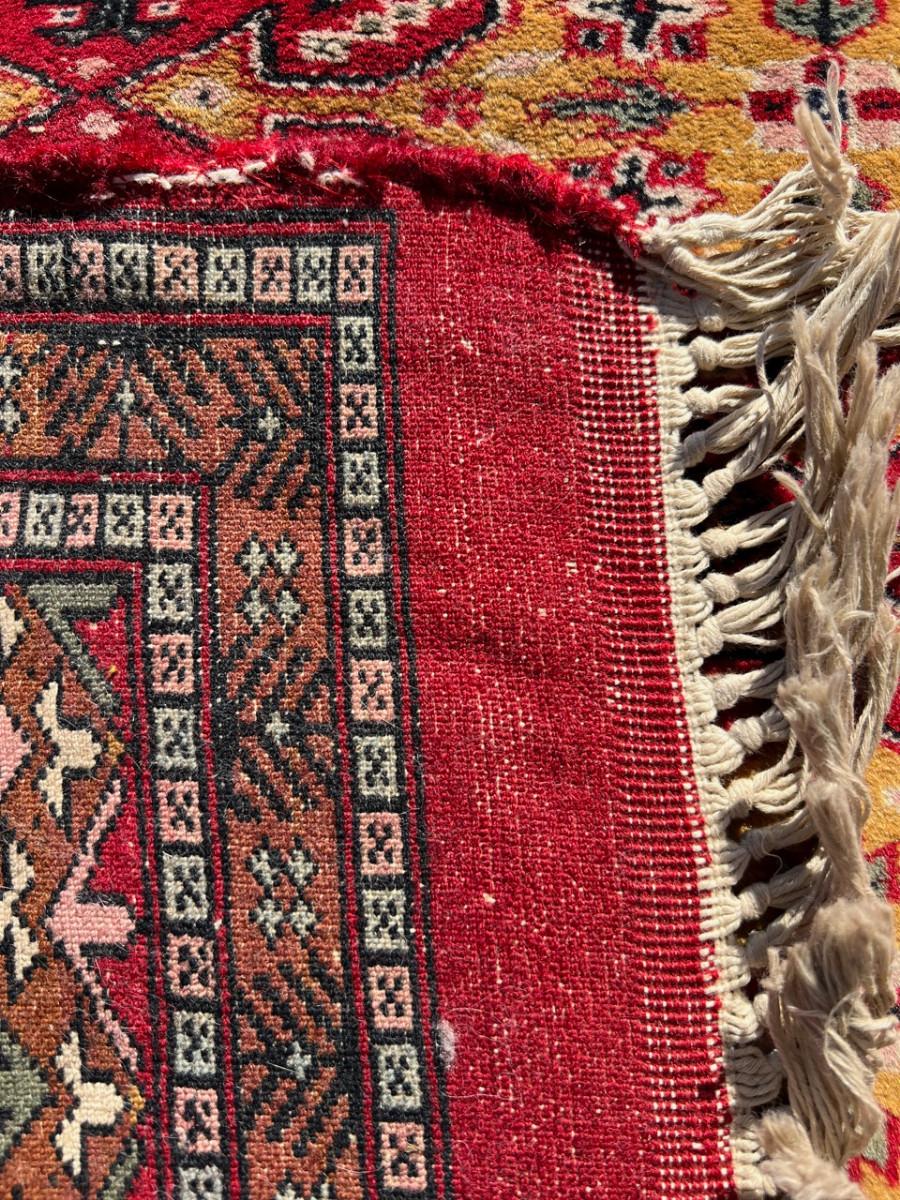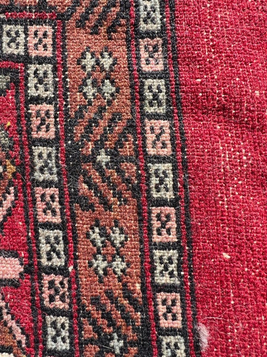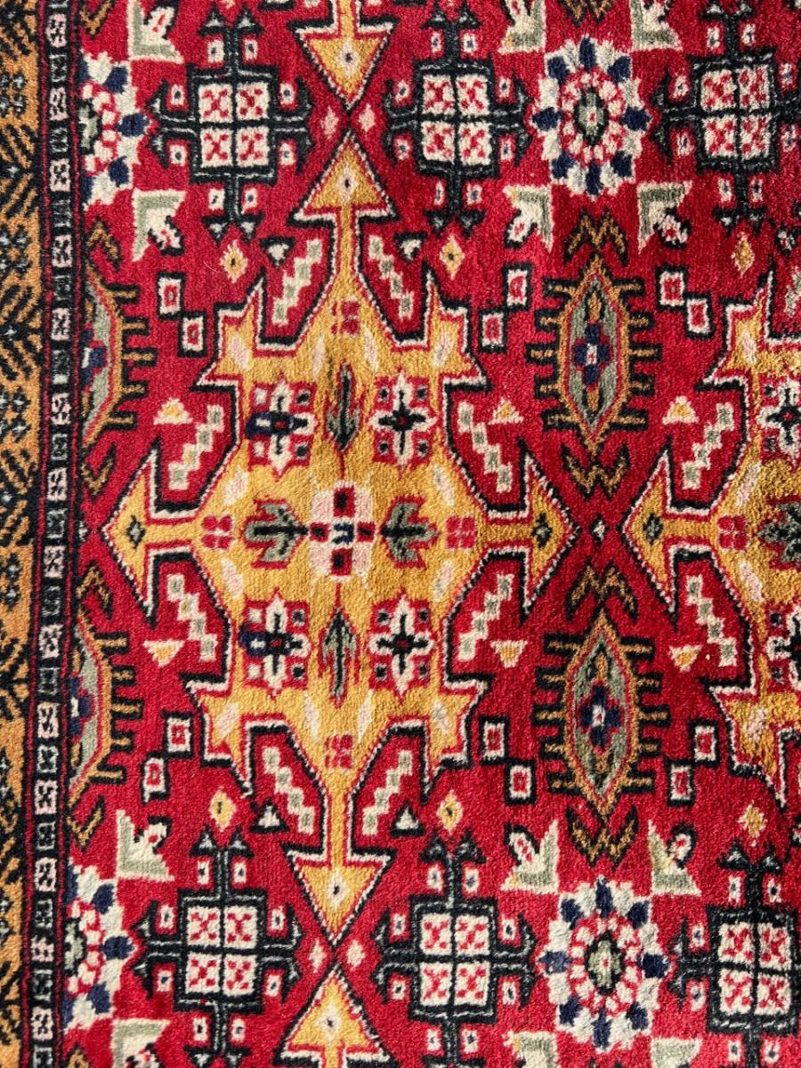 DESCRIPTION: This finely woven rug will own wherever you choose to lay it. The bright, saturated red field is boldly patterned with a repeated series of ochre and gold guls separated with small, white over red foliate passages, displayed jewel-like in the central field. Multiple border framing makes this elaborate rug a life time investment-heirloom quality rug.