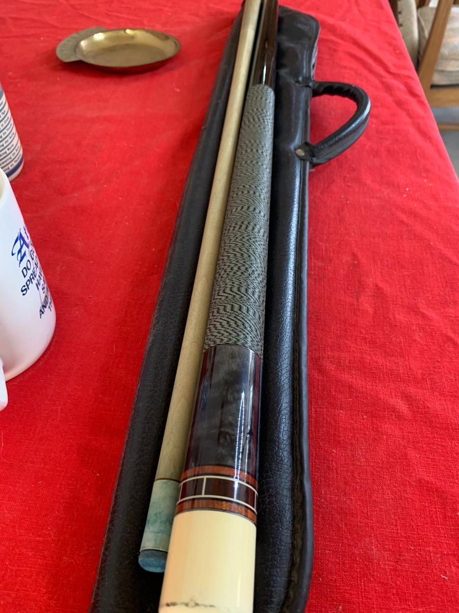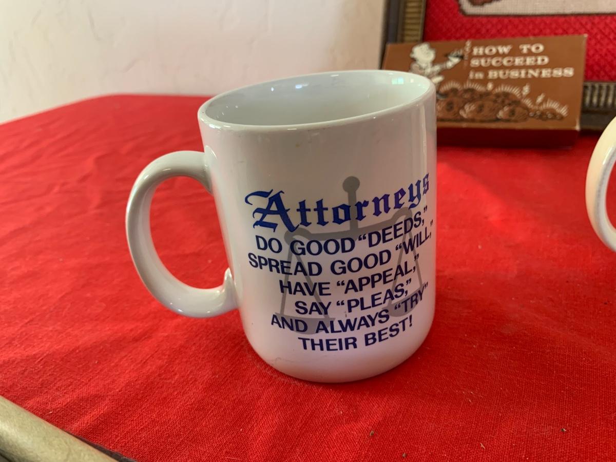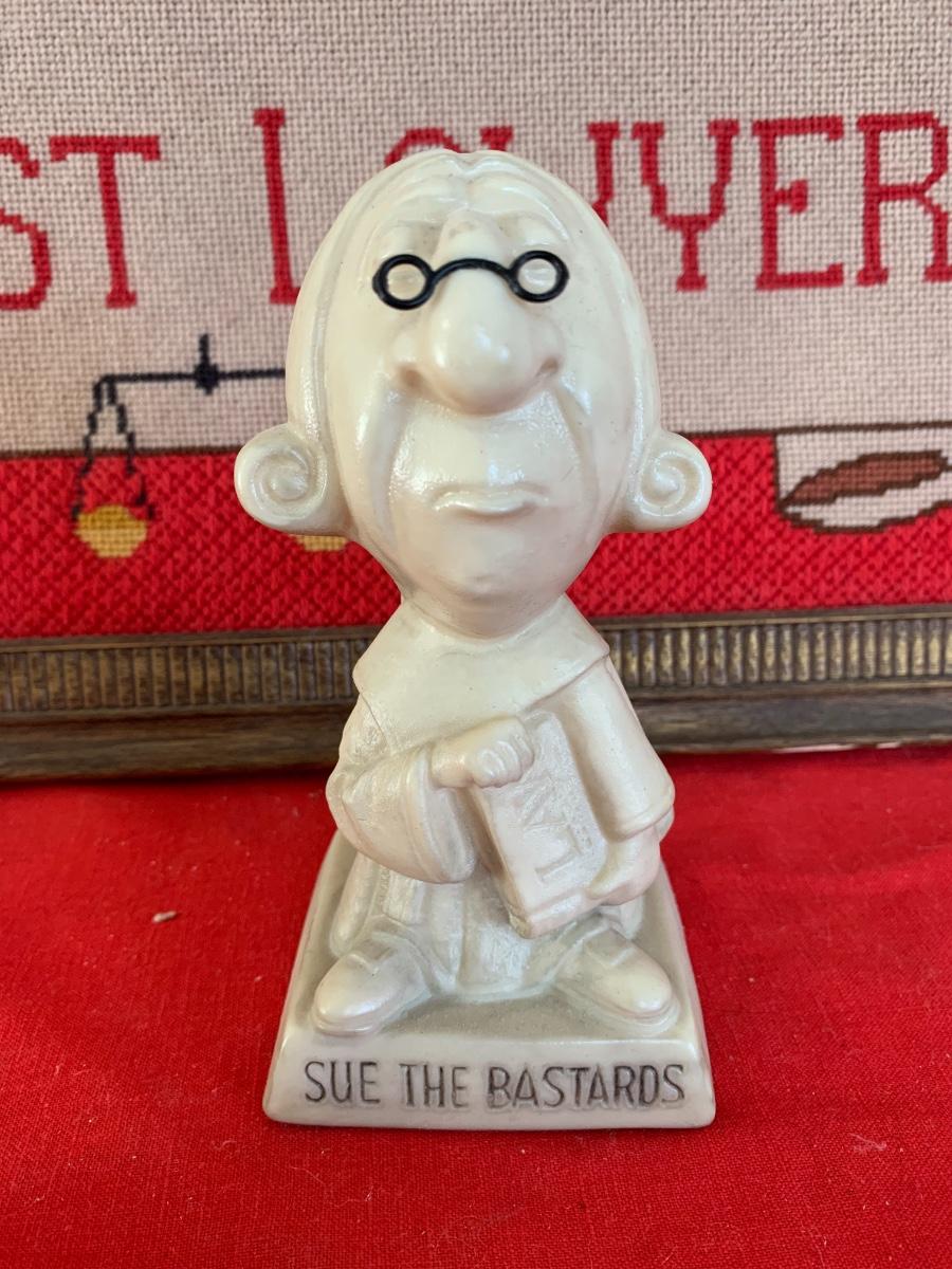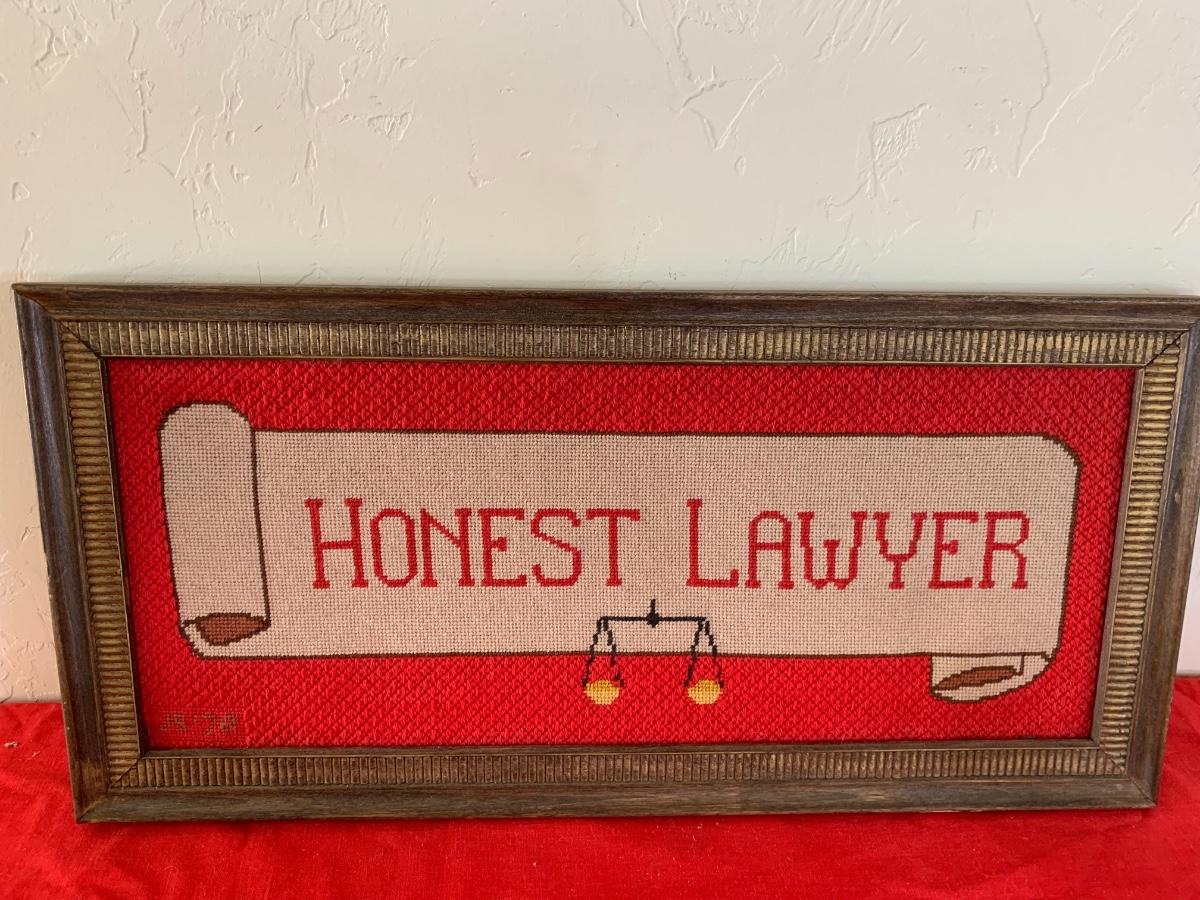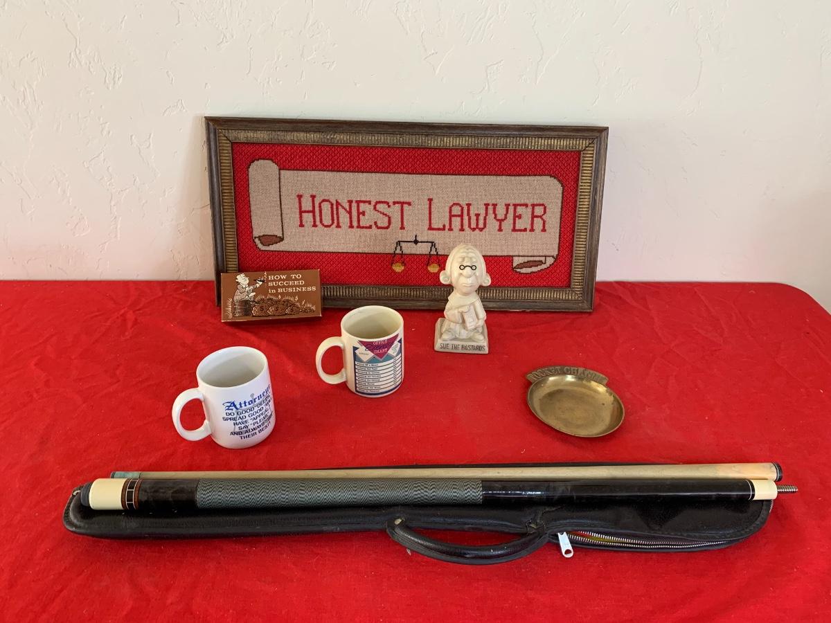 Needle Point Honest Lawyer’s Framed 2ft x 1 ft. Lawyers mugs. “Sue the Bastard” statue. Pool Cue with leather/yellow velvet casing. Brass Pocket Change catcher.
