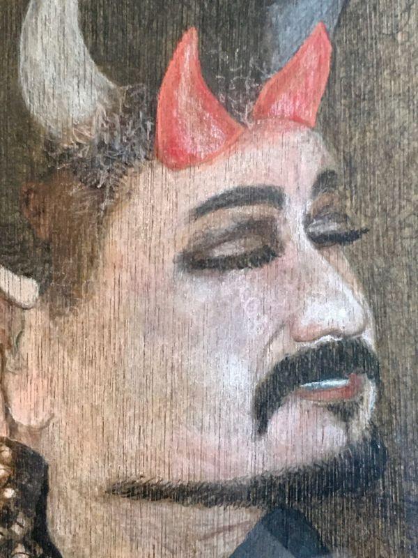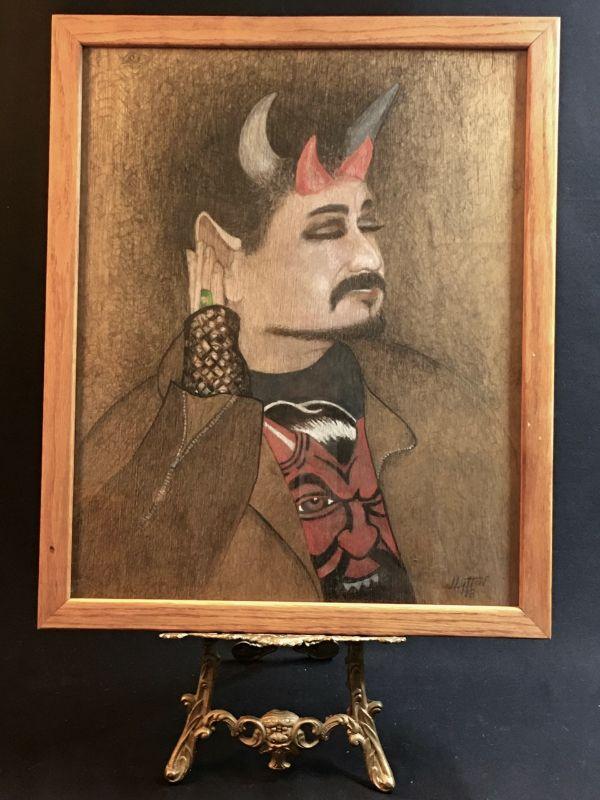 Description: The portrait is a chest length depiction of local celebrity hair stylist "Todd" dressed for Halloween as the ole devil himself, replete with horns, goatee, pointy ears, and a devil t-shirt. Love the posing poser with that devilish grin. Trick and treat yourself with this great piece.
