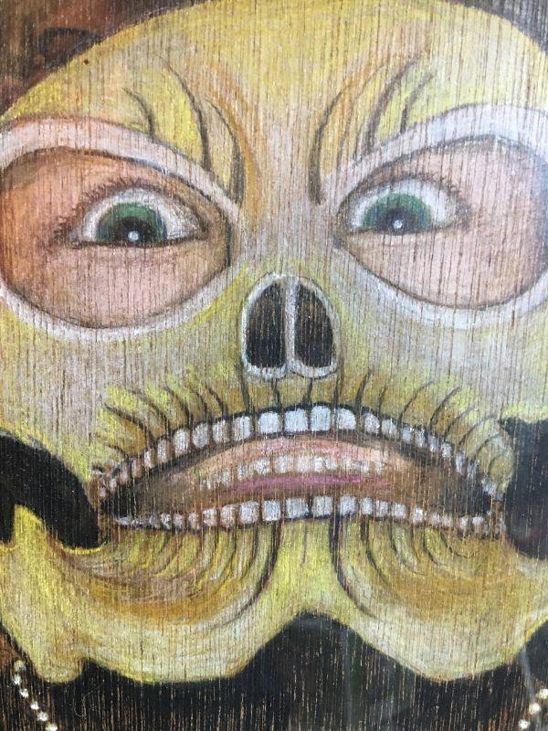 Description: The subject item is a chest length portrait of someone “unknown” the artist, costumed for Halloween and hiding behind an appropriately gruesome skull mask and hooded cape. A large round medallion hands around the neck of the blue-eyed demon.