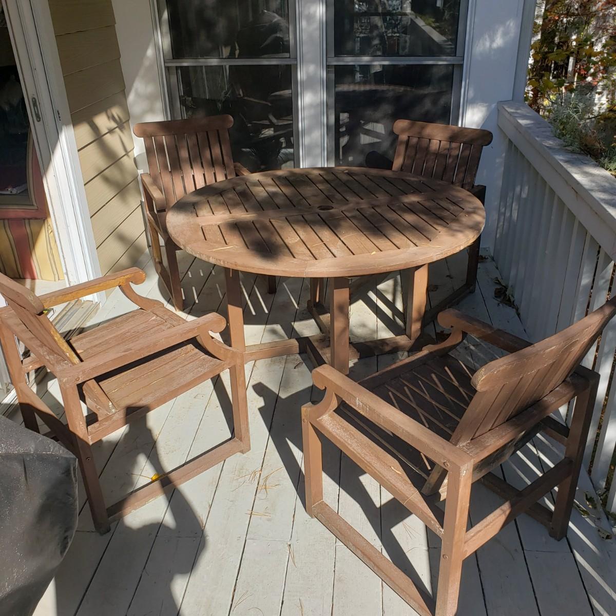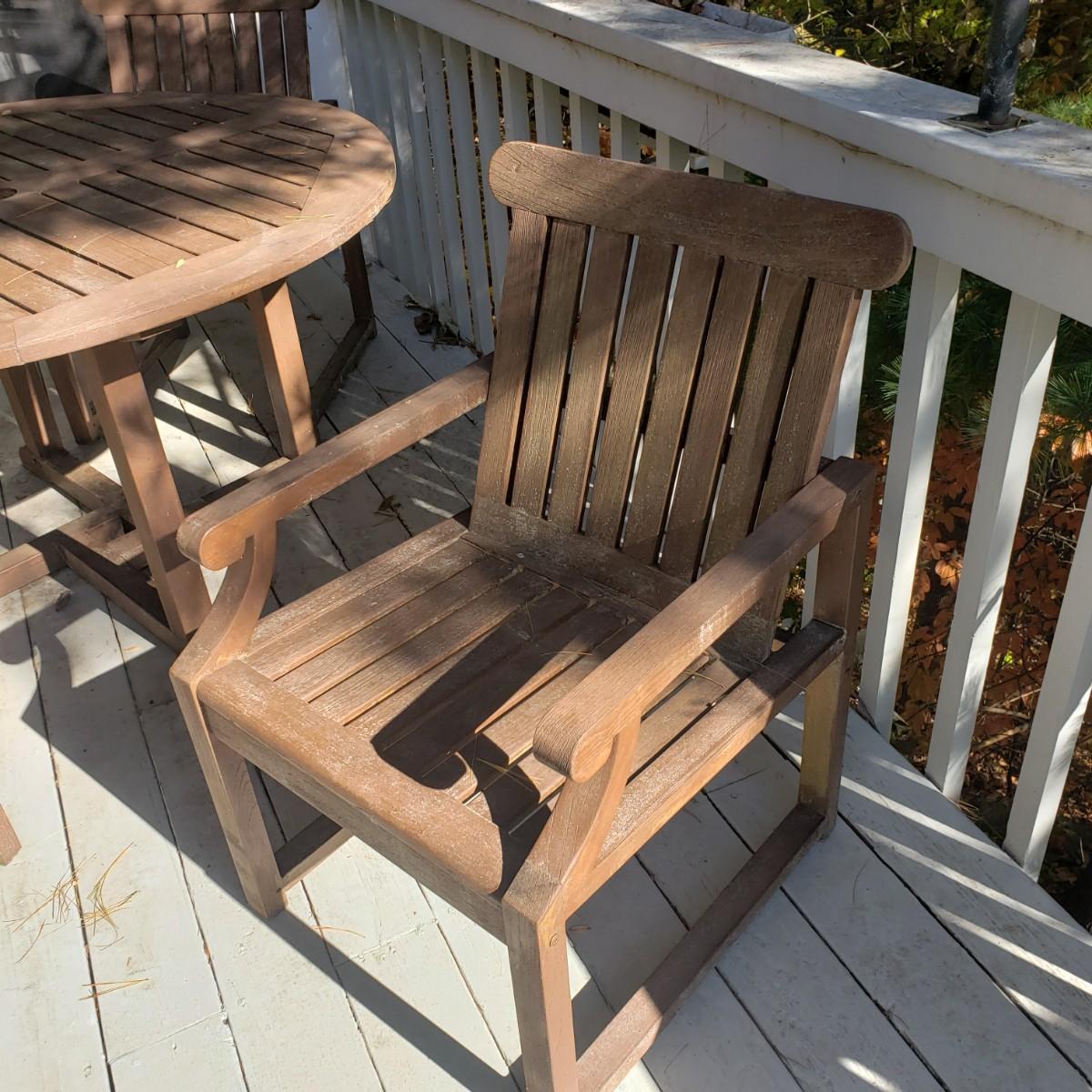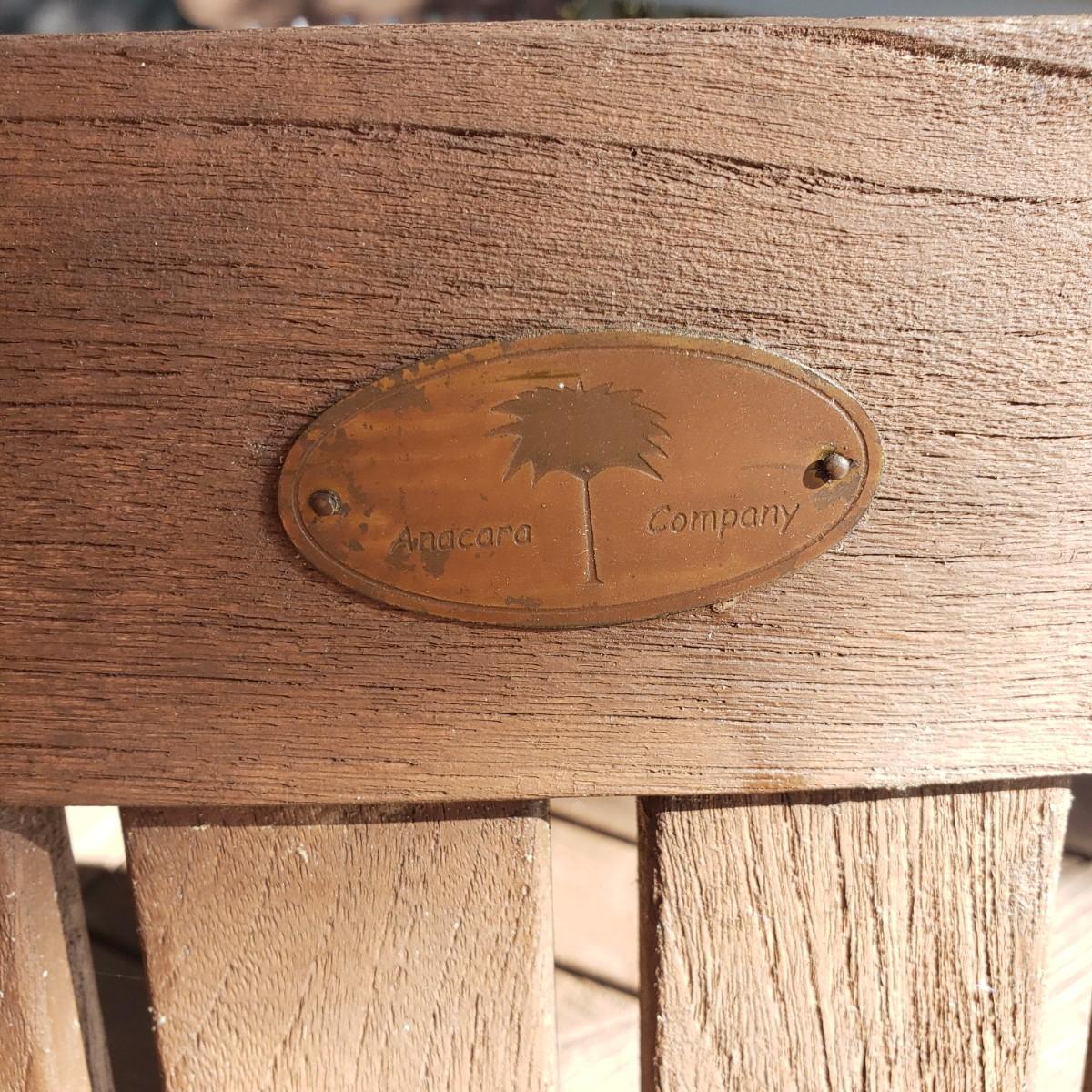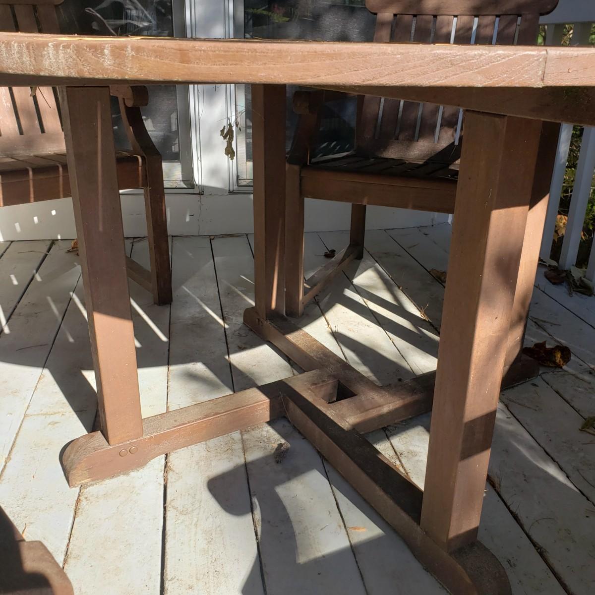 This outdoor table and chairs is by Anacara Company. The table measures 51"D x 29"H. The chairs each measure approximately 23" x 23" x 24"H, with a seat height of 17". It appears that the wood is Teak and has been stained/painted, see picture with two tones of wood. The set is sturdy.