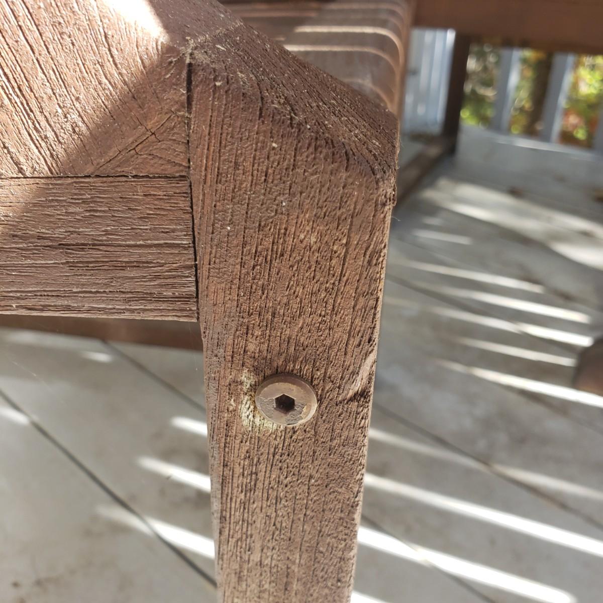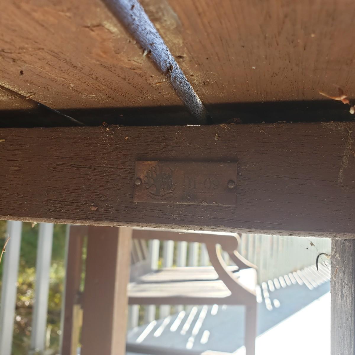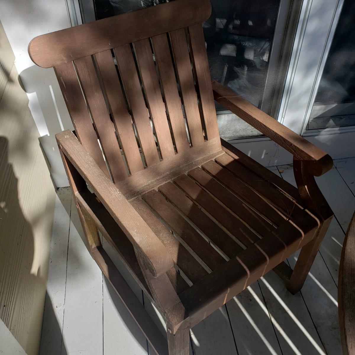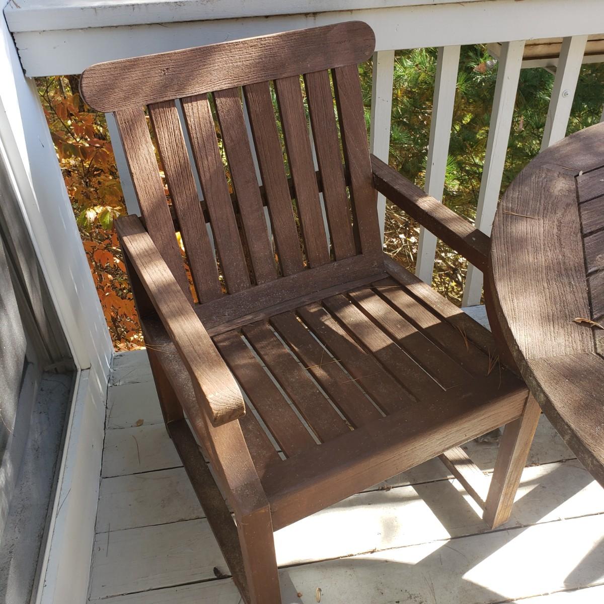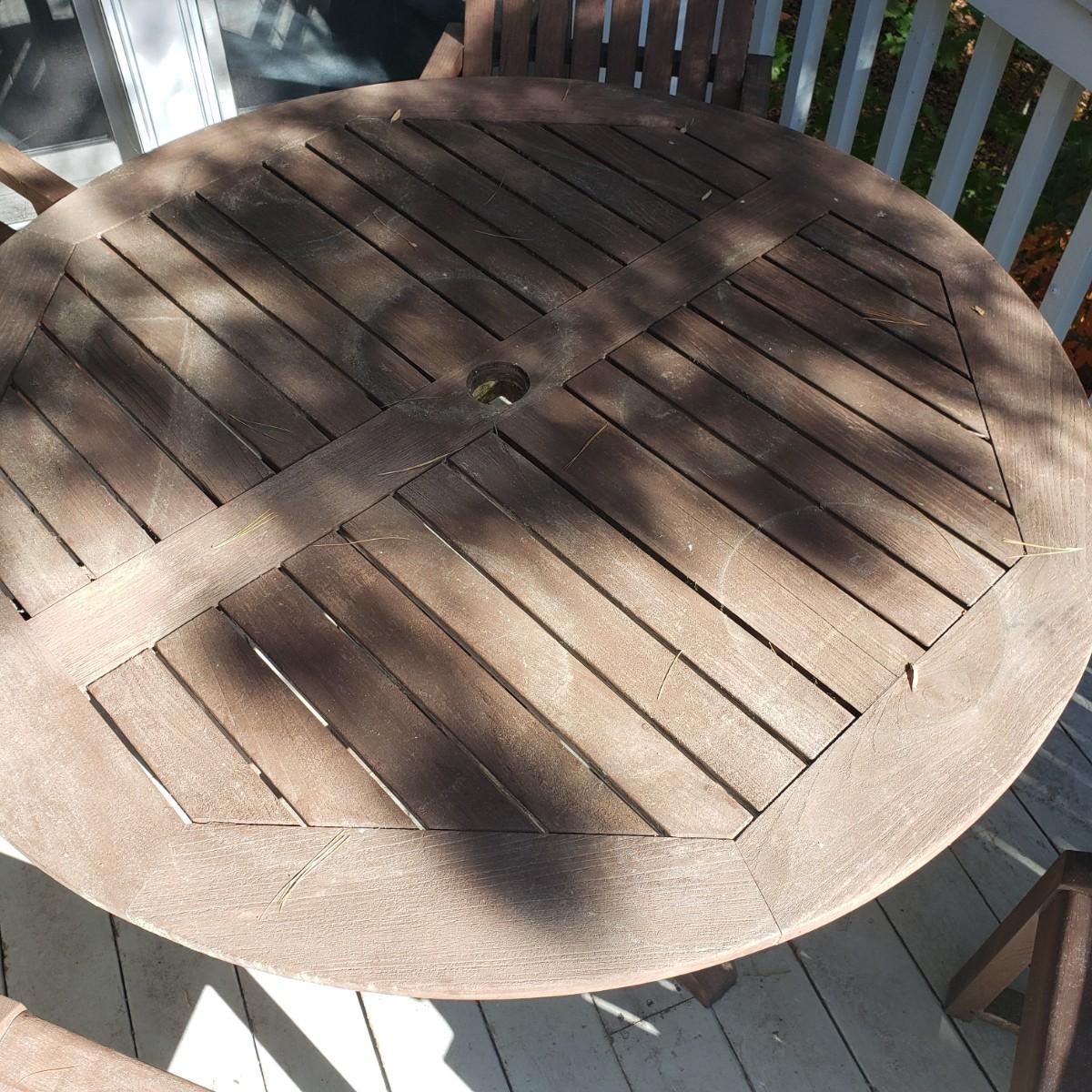 This outdoor table and chairs is by Anacara Company. The table measures 51"D x 29"H. The chairs each measure approximately 23" x 23" x 24"H, with a seat height of 17". It appears that the wood is Teak and has been stained/painted, see picture with two tones of wood. The set is sturdy.