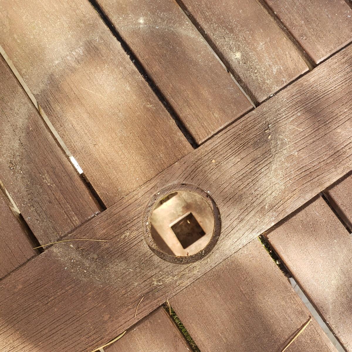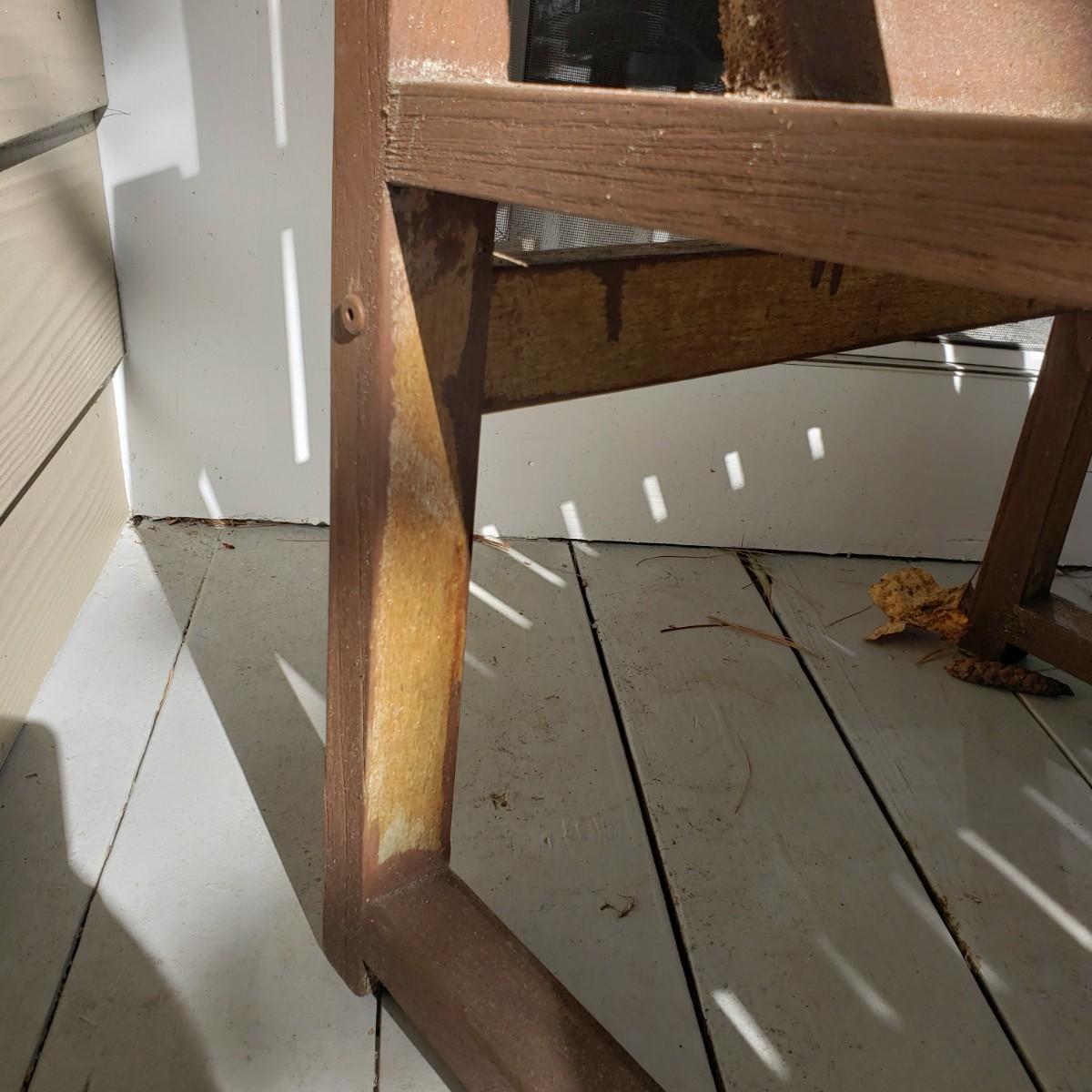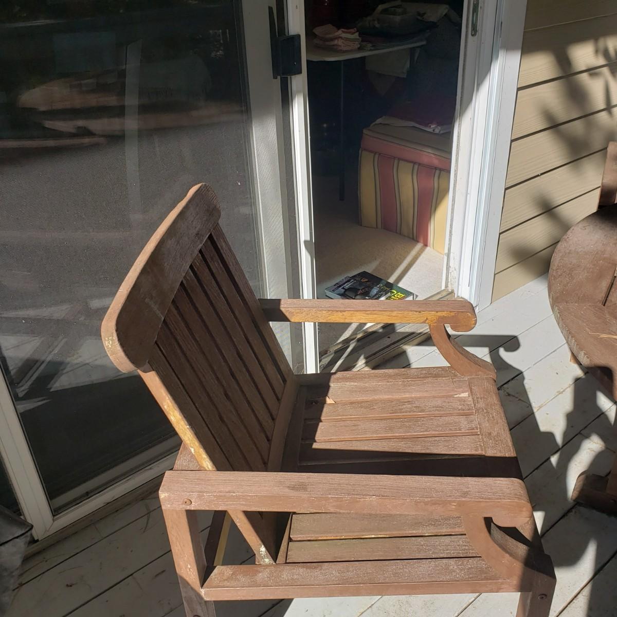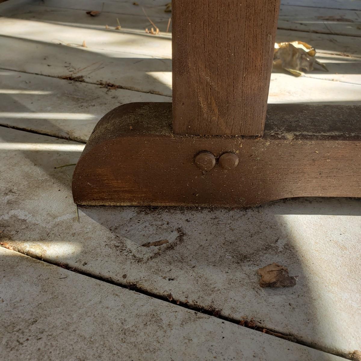 This outdoor table and chairs is by Anacara Company. The table measures 51"D x 29"H. The chairs each measure approximately 23" x 23" x 24"H, with a seat height of 17". It appears that the wood is Teak and has been stained/painted, see picture with two tones of wood. The set is sturdy.