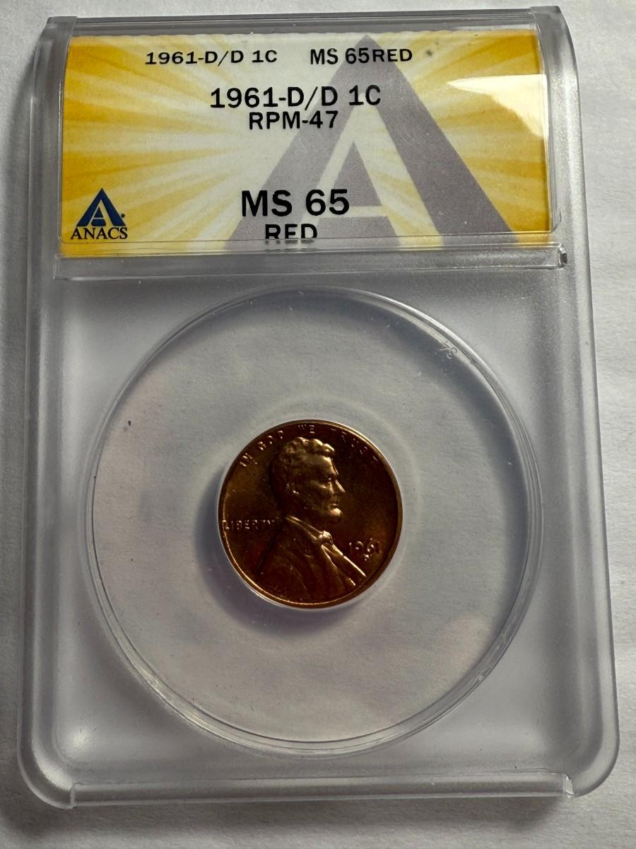 ANACS CERTIFIED 1961-D/D RPM-47 MS65 RED LINCOLN CENT AS PICTURED. $5 DOMESTIC SHIPPING.