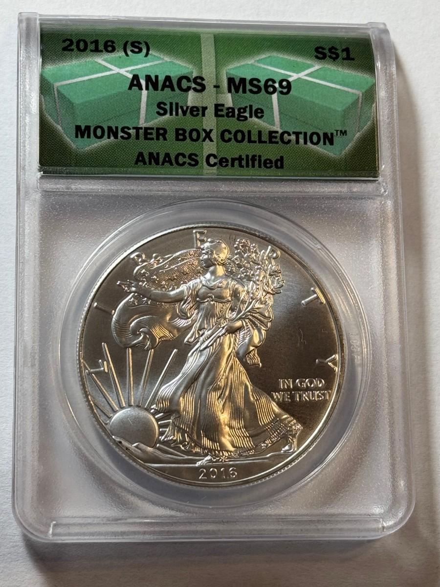 ANACS CERTIFIED 2016-(S) MS69 SILVER EAGLE DOLLAR 1-OUNCE .999 COIN AS PICTURED. $5 DOMESTIC SHIPPING.
