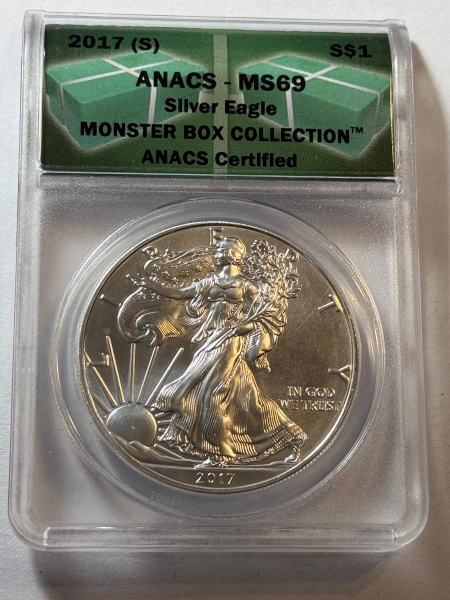 ANACS CERTIFIED 2017-(S) MS69 SILVER EAGLE DOLLAR 1-OUNCE .999 COIN AS PICTURED. $5 DOMESTIC SHIPPING.