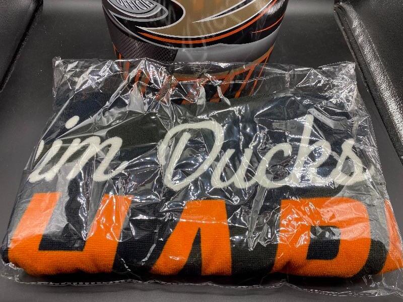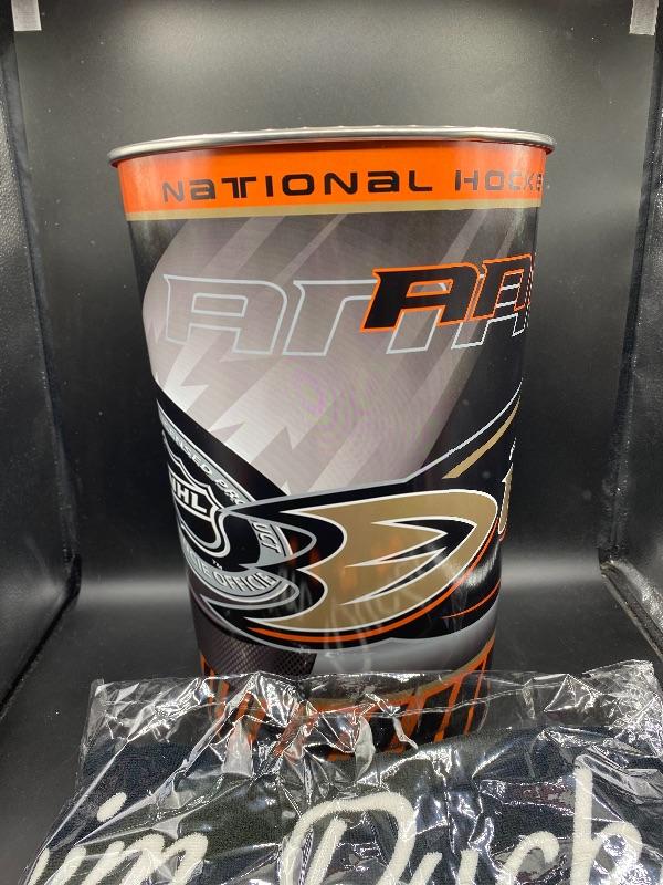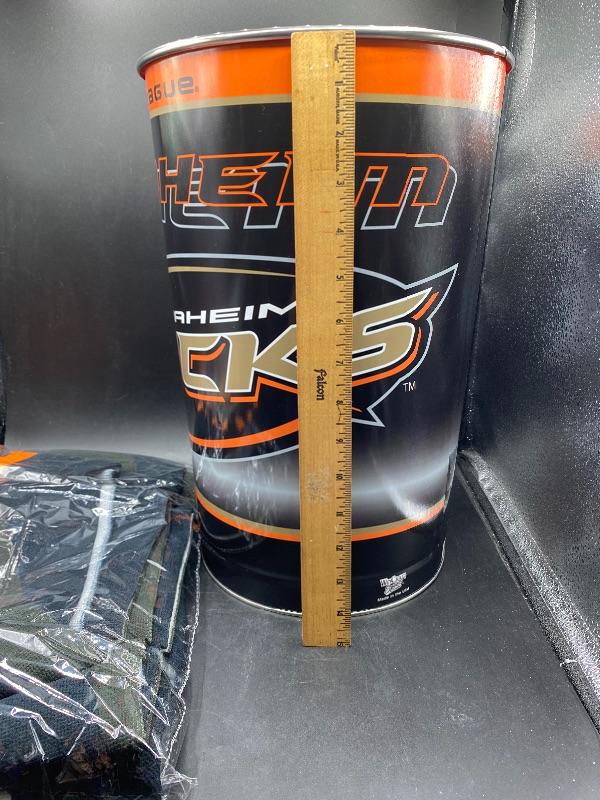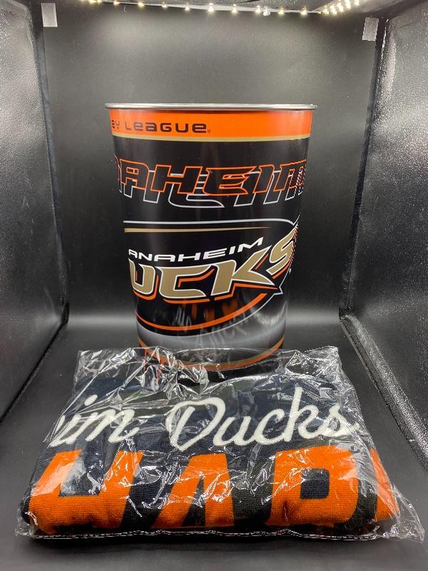 Anaheim Ducks NHL Hockey metal 15" trash can and logo towel. Trash can is officially licensed, unused. Towel looks about beach towel size, it is unused in sealed plastic.