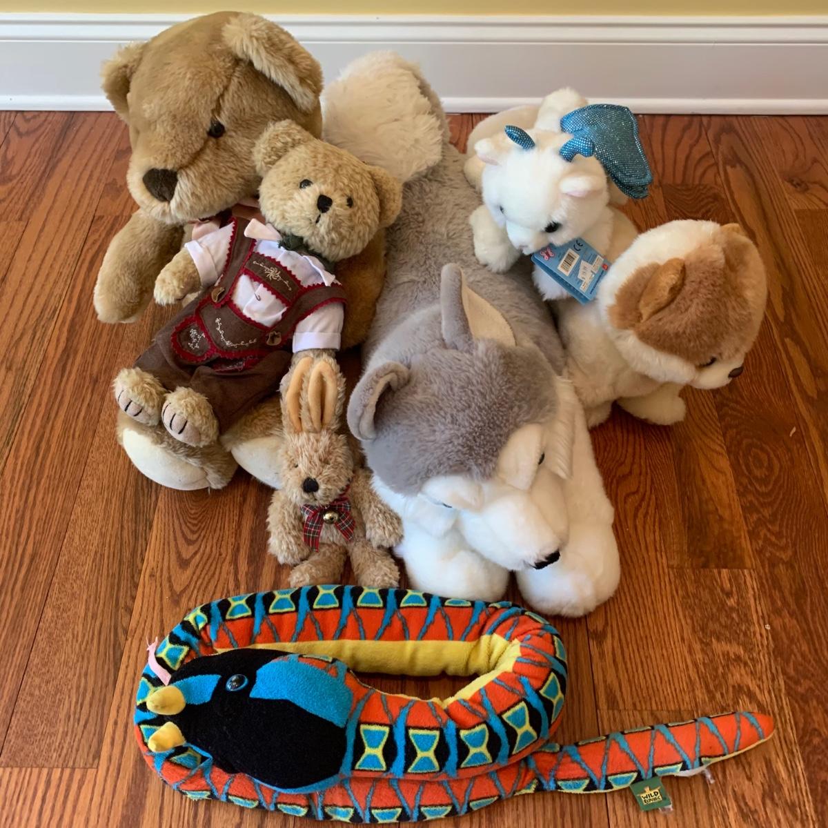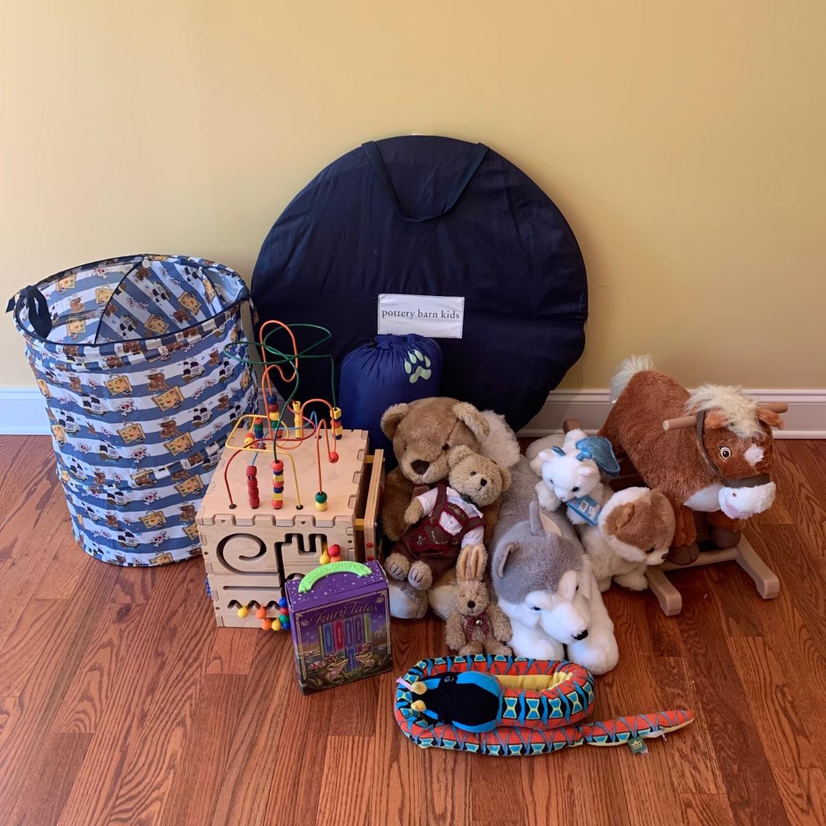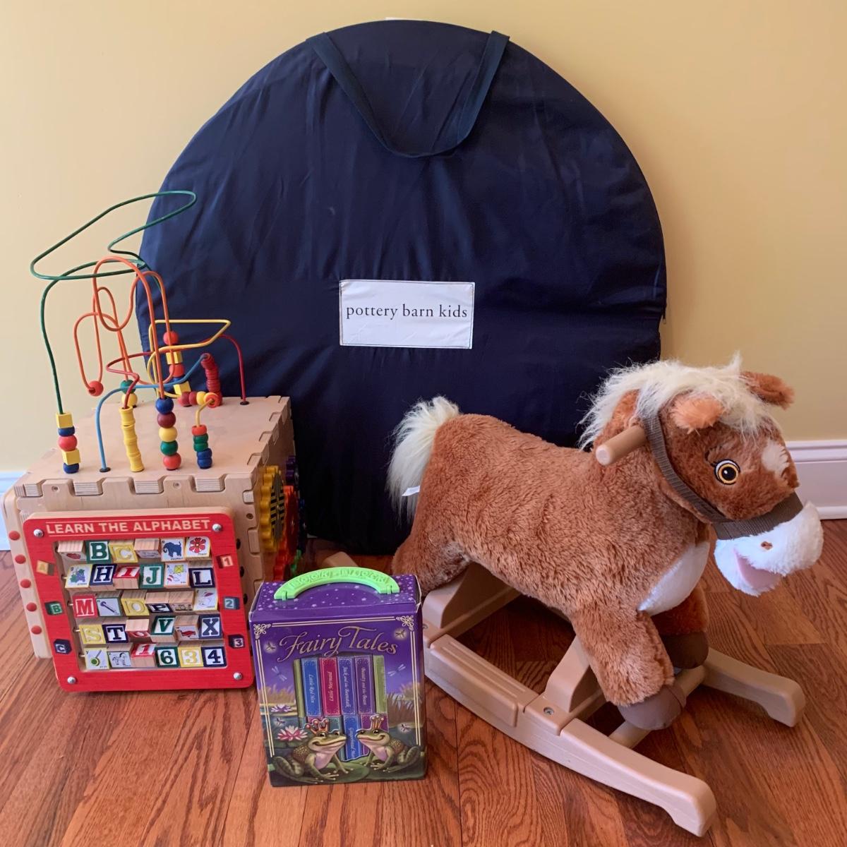 Lot includes large Pottery Barn Kid’s tent, Anatex Play Cube, stuffed rocking horse, variety of stuffed animals, collection of Fairy Tale story books, pirate themed collapsible toy bin, and kids Coleman sleeping bag. Tent measures, 87” x 49” x 41”H. Please see photos for details. Local pickup only.