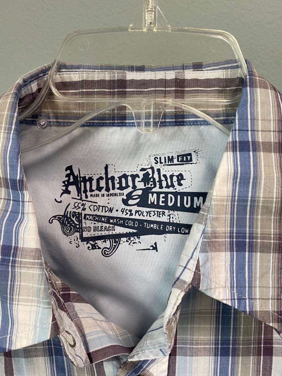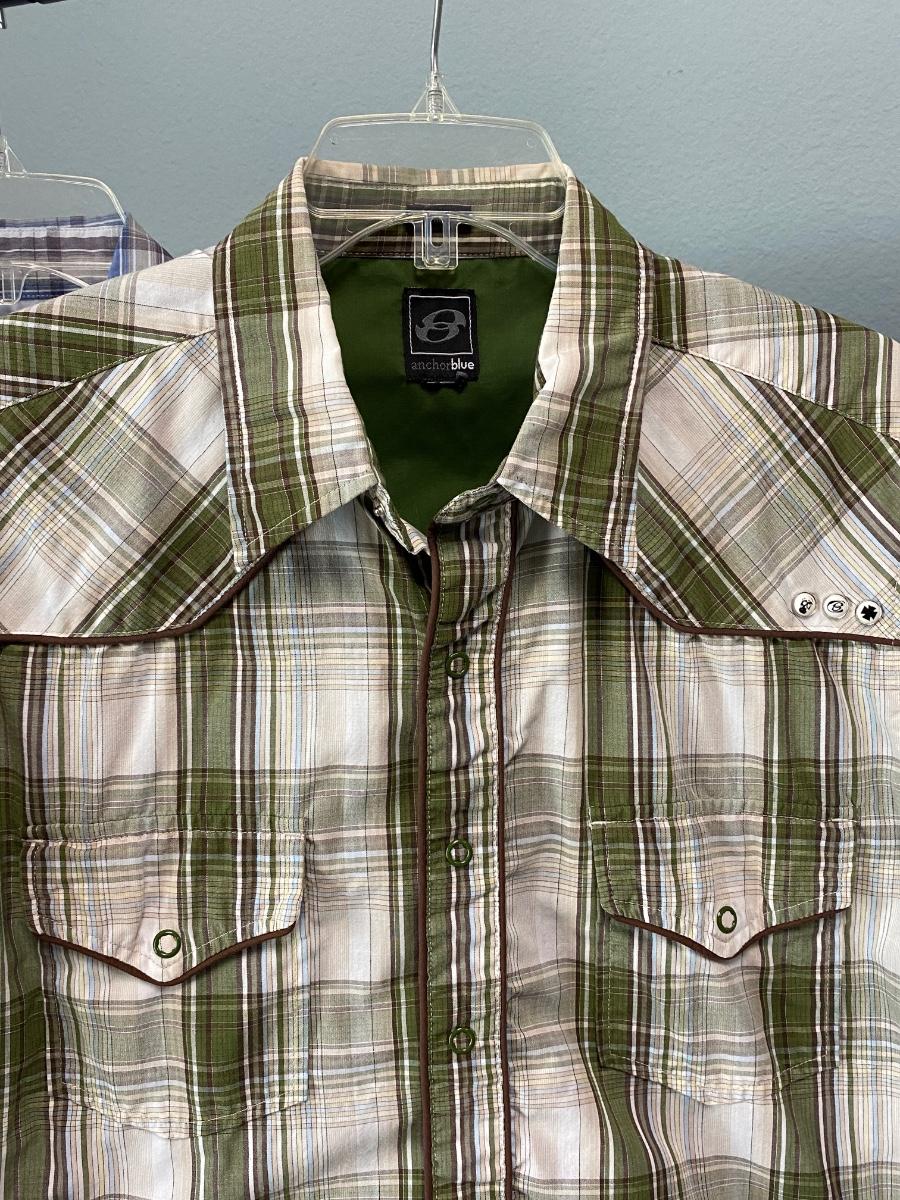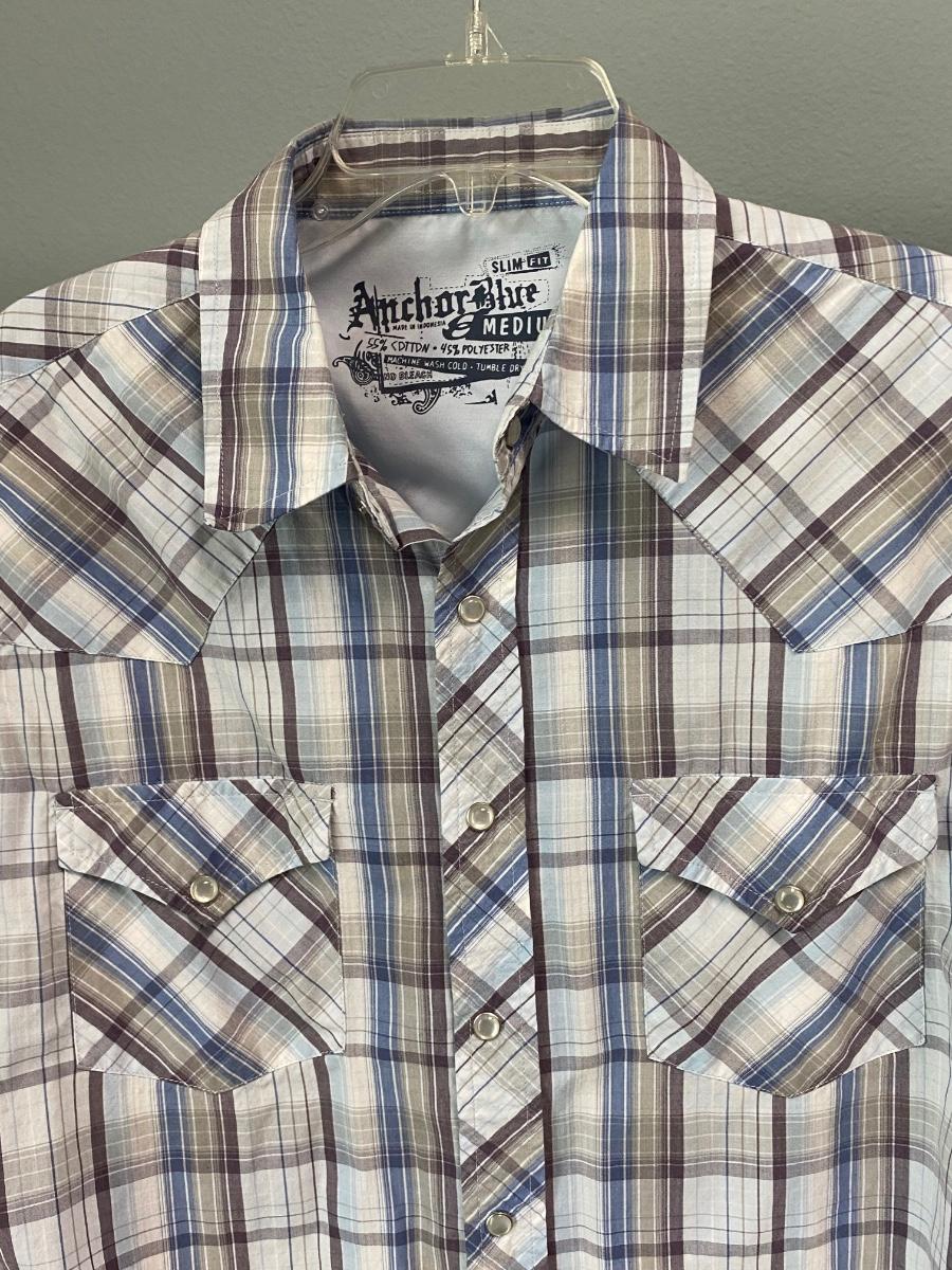Pair of Anchor Blue short sleeve men's shirts. Western wear style, snaps instead of buttons up the front. Great plaid patterns. Good condition. Slim fit, size medium.