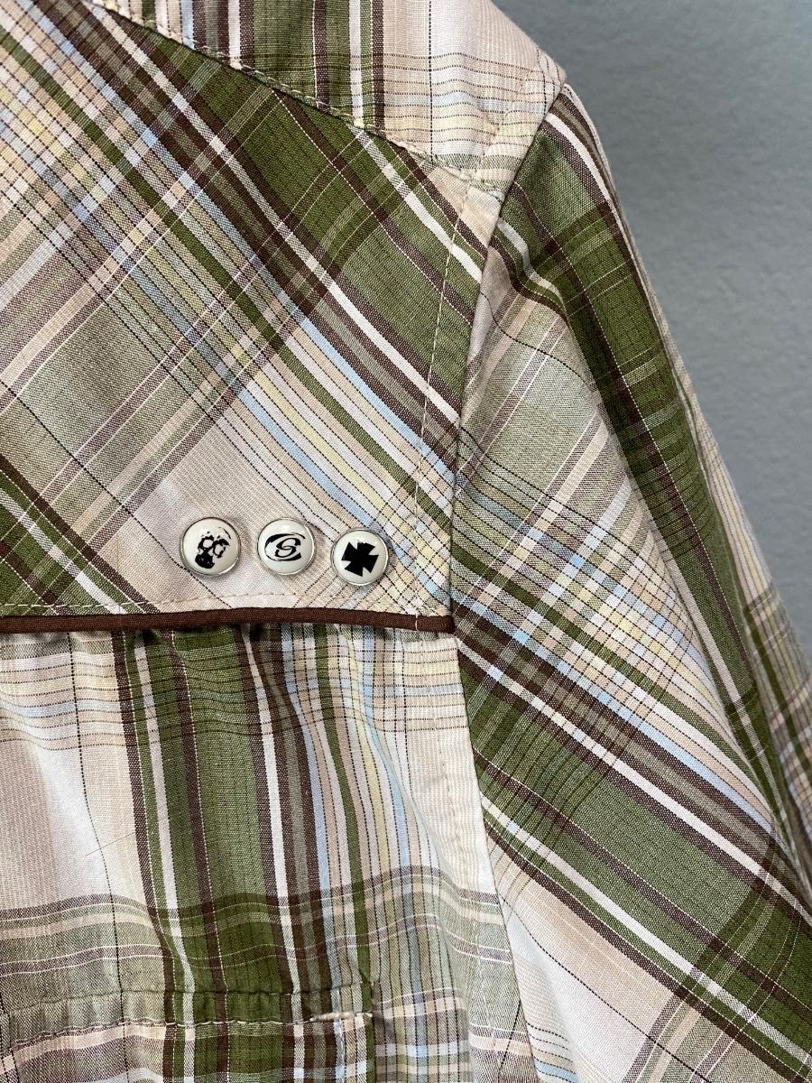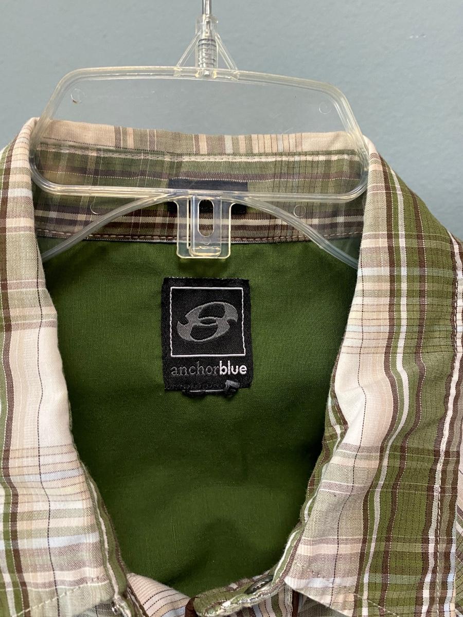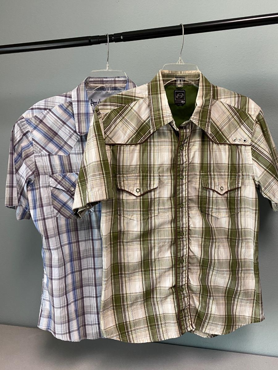 Pair of Anchor Blue short sleeve men's shirts. Western wear style, snaps instead of buttons up the front. Great plaid patterns. Good condition. Slim fit, size medium.