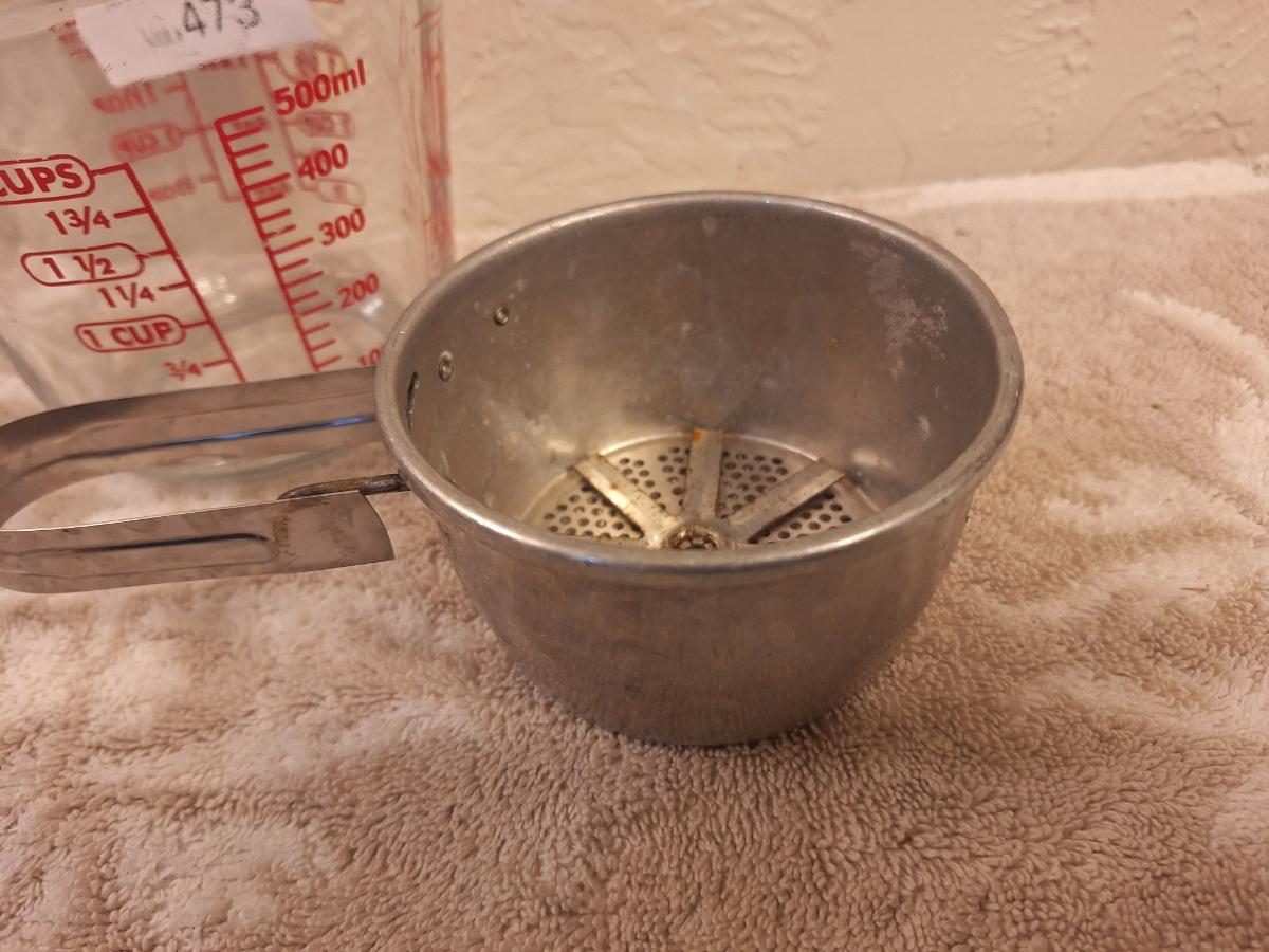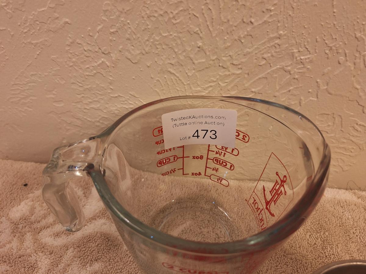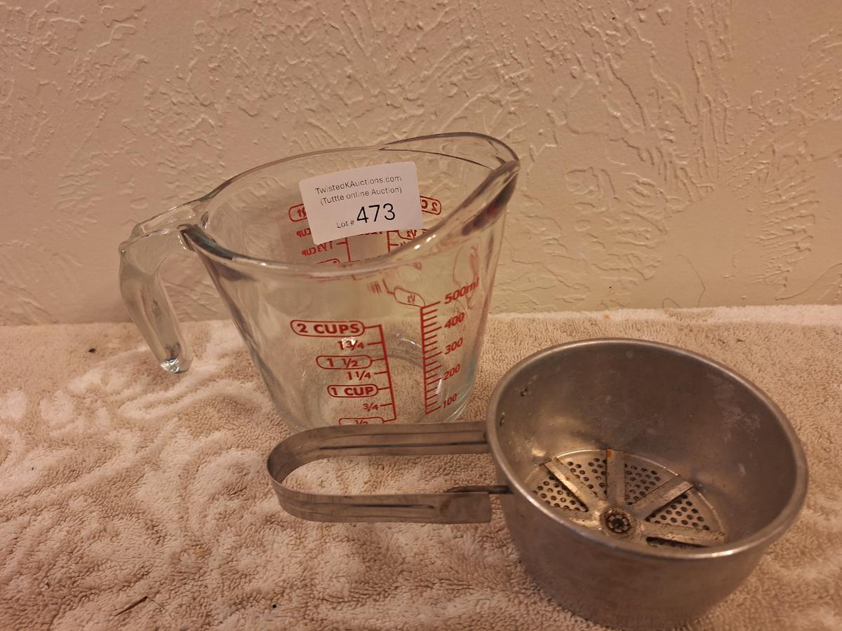 Anchor Hocking 2-cup (16-ounce) glass measuring cup and a metal flour sifter.