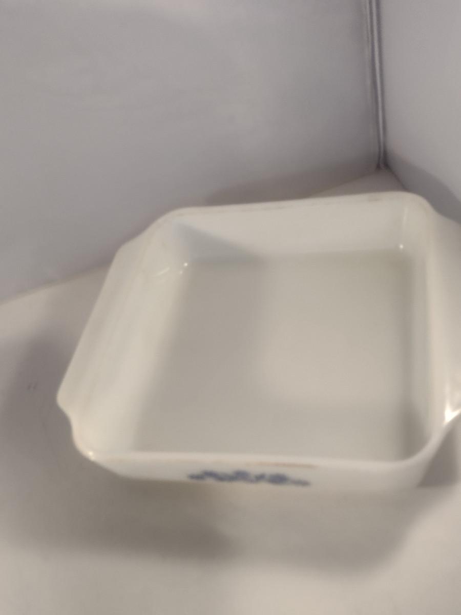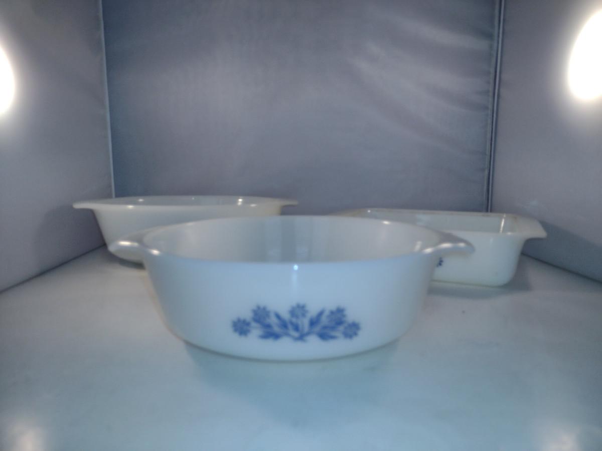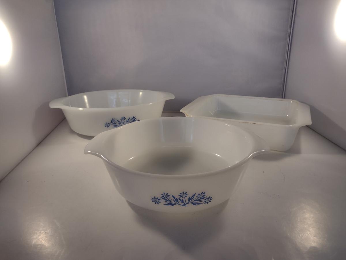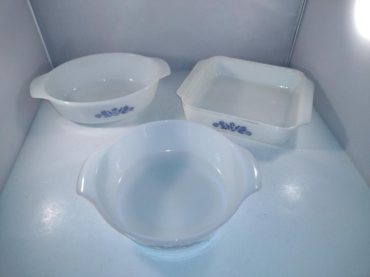 Anchor Hocking Blue Cornflower White Glass Casserole Dishes. 1 1/2 quart round, 1 1/2 quart oval, 1 1/2 quart square.
