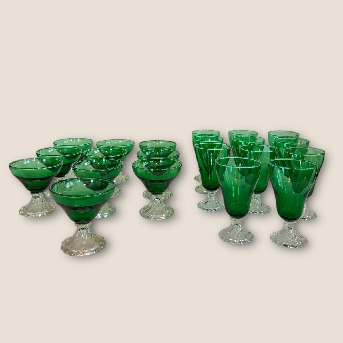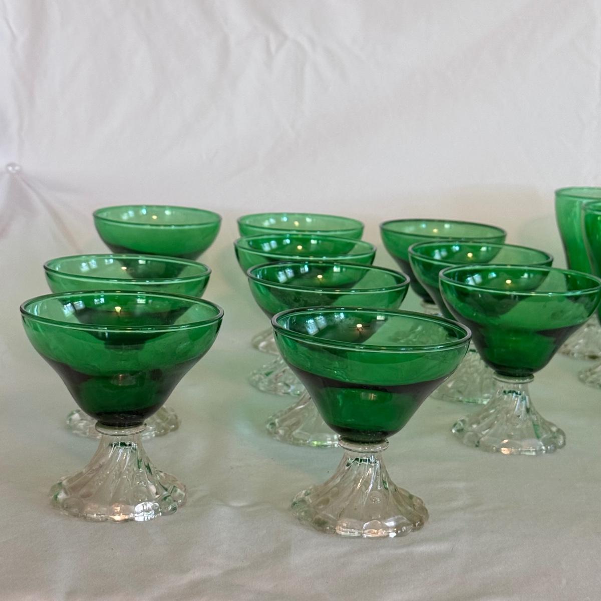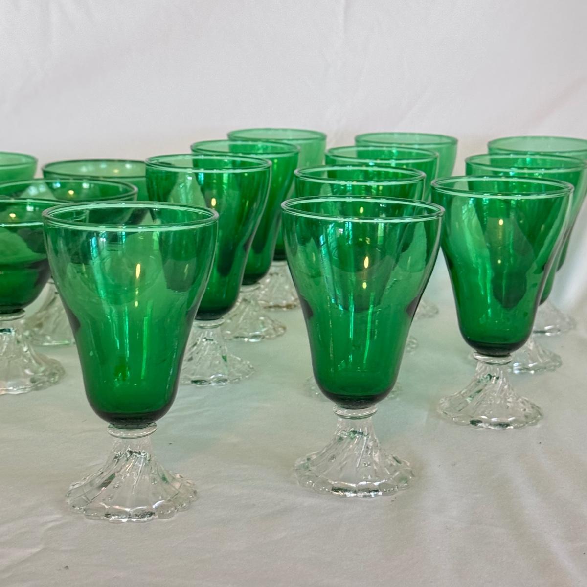 This lot includes ten burple-green 6oz liquor cocktail glasses and eleven 8oz water glasses. They appear to be from the Anchor Hocking Inspiration line. The glasses are green and feature a clear stem with a bubbled base. The cocktail glasses measure approximately 4"D x 4”H. Shipping available.