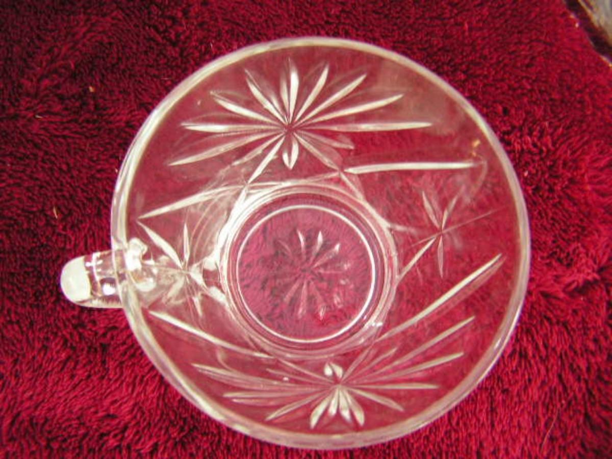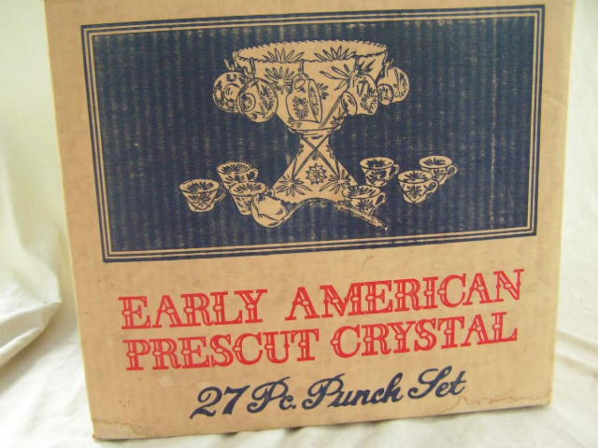 More items like this elsewhere in this sale. Anchor Hocking Early American “Star of David” pattern c.1960s prescut crystal punch bowl set includes 12 matching cups w/pedestal 2 piece punch bowl, cup hangers & ladle. All in original box. Mint condition bowl and cups. 13" tall assembled, 14" diameter top.