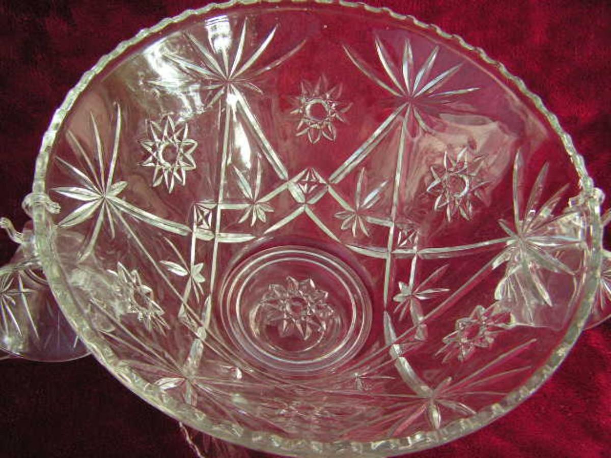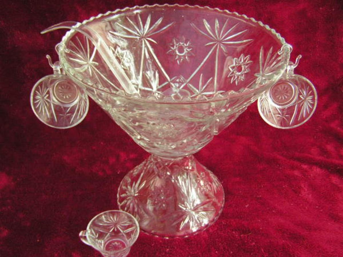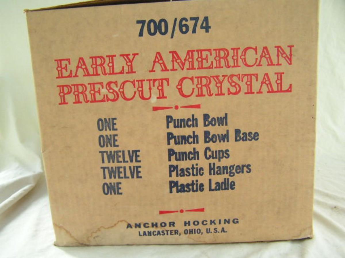 Anchor Hocking Early American “Star of David” pattern c.1960s prescut crystal punch bowl set includes 12 matching cups w/pedestal 2 piece punch bowl, cup hangers & ladle. All in original box. Mint condition bowl and cups. 13" tall assembled, 14" diameter top.