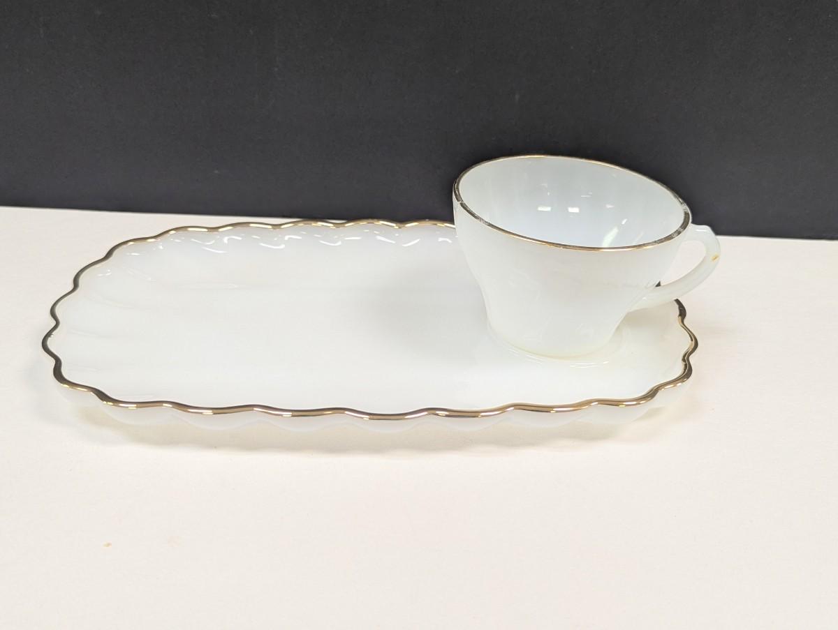 Anchor Hocking Classic Milk Glass Tea Cup With Snack Plate Gold Trimmed