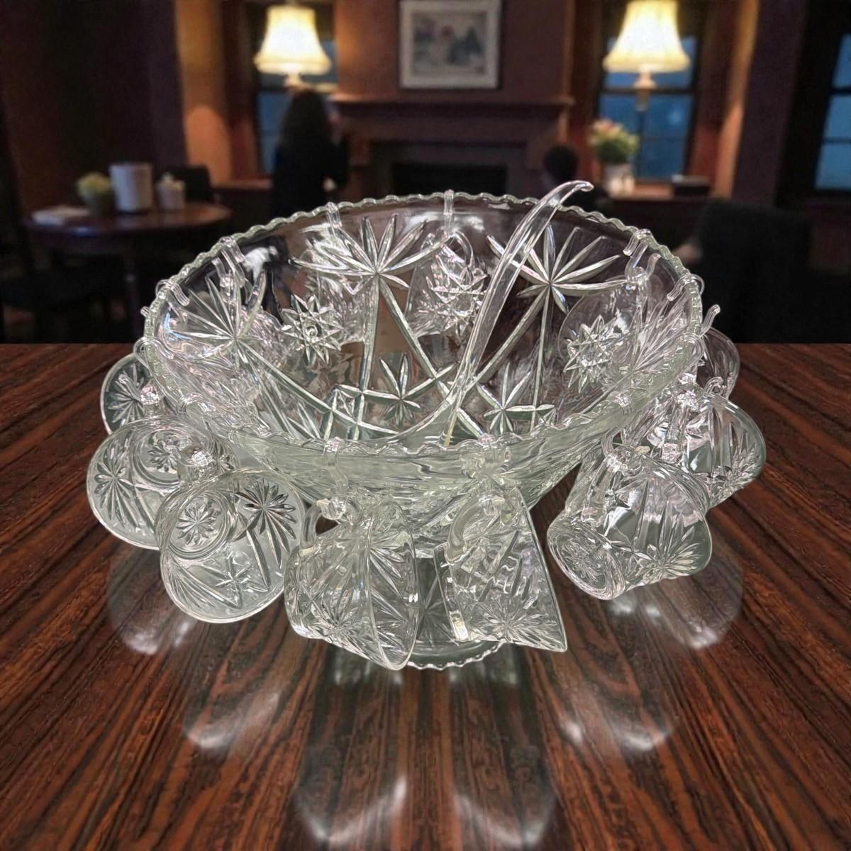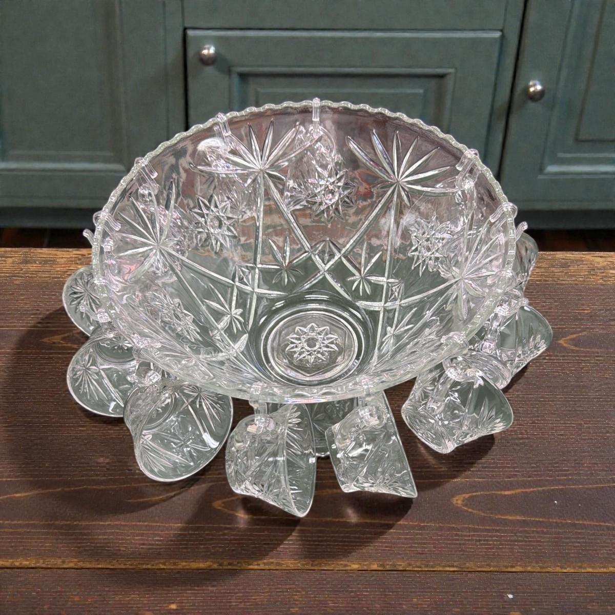 Anchor Hocking Early American Precut Star of David Punch Bowl, Pedestal, Cups, Hook and Ladle