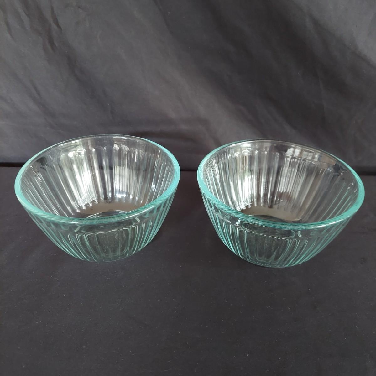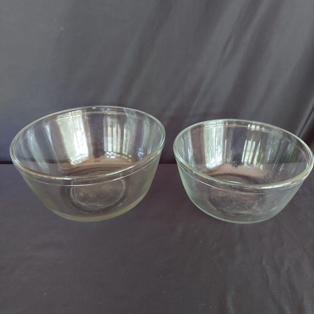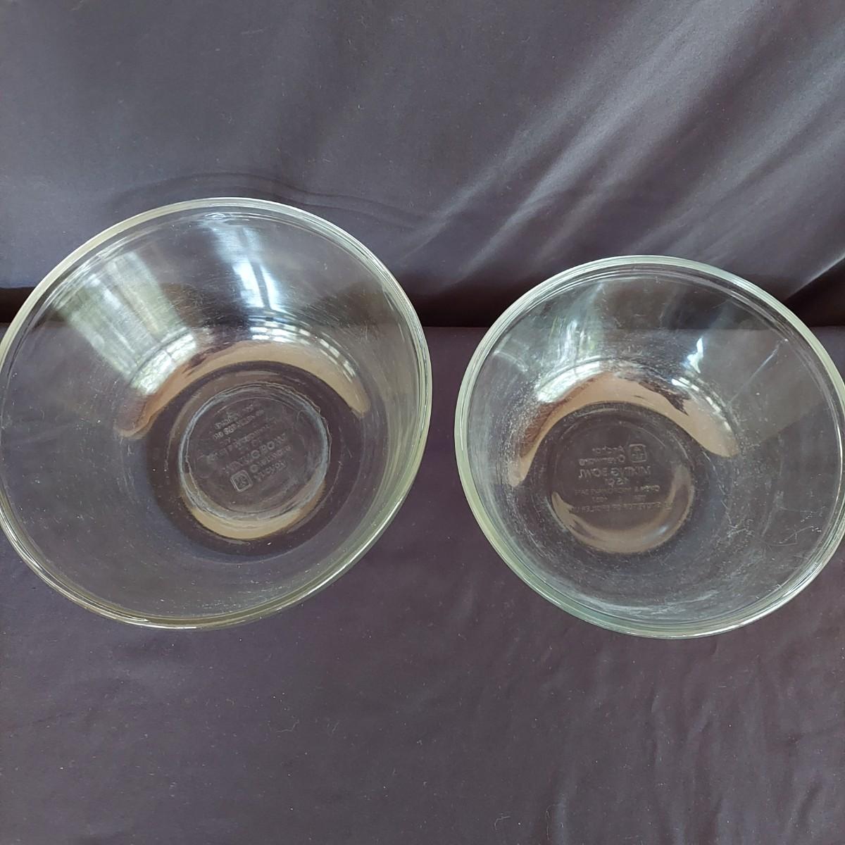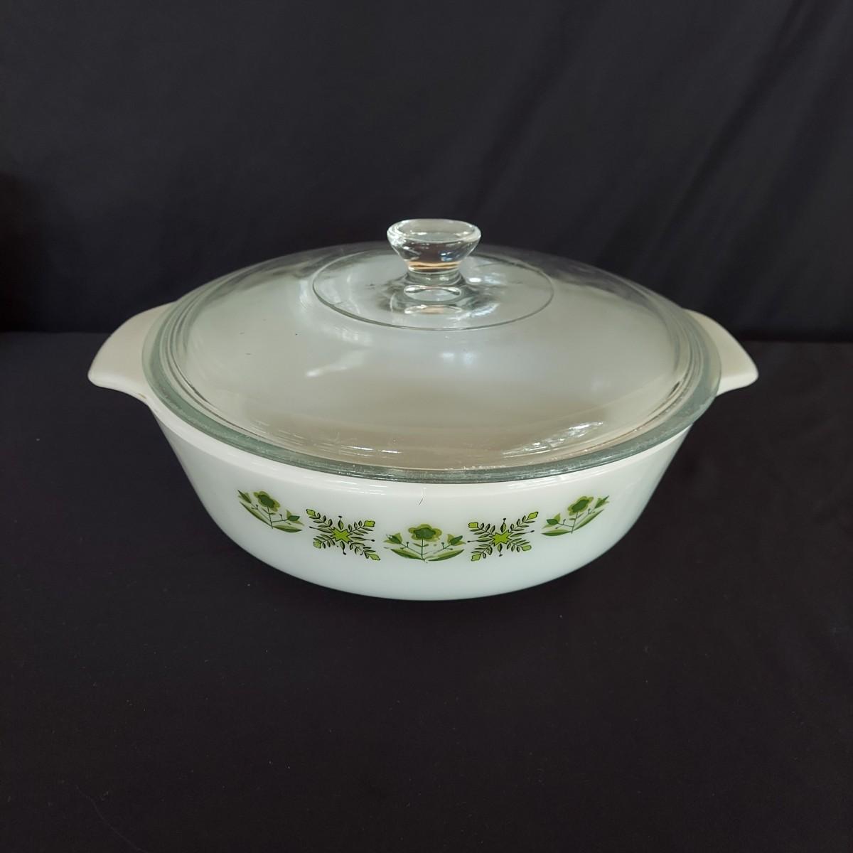Lot includes several clear and milk glass baking dishes, mixing bowls and more by Anchor Hocking Fire King, Pyrex and others. Includes a Meadow Green printed 9.5" casserole dish with lid and a stack of 3.5" bowls with lids. Plus a large 11" mixing bowl with lid and insulated carrying case and several more bowls and baking dishes. Local Pickup Only