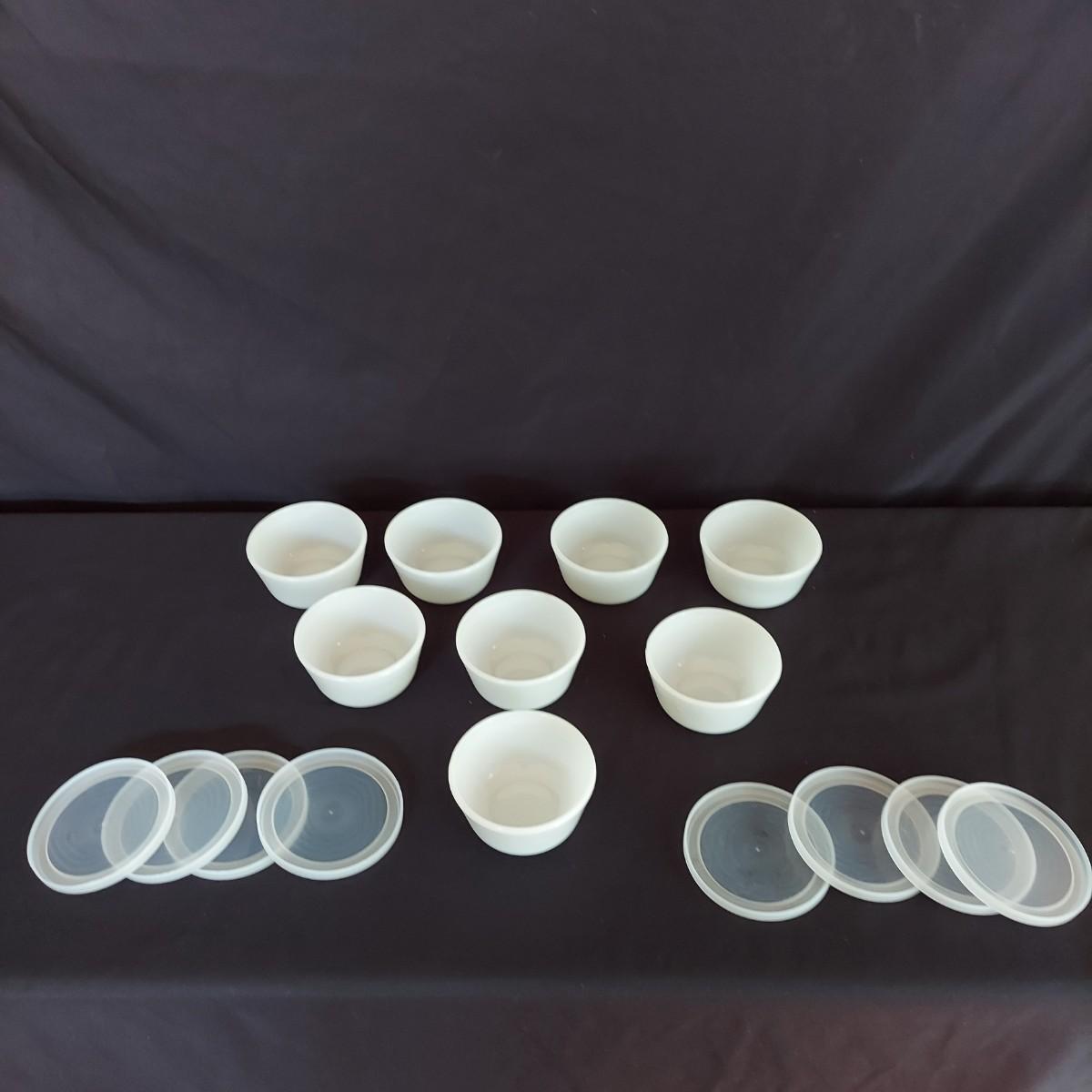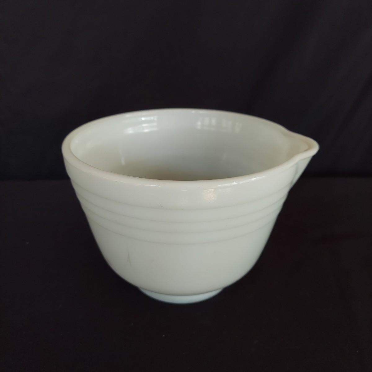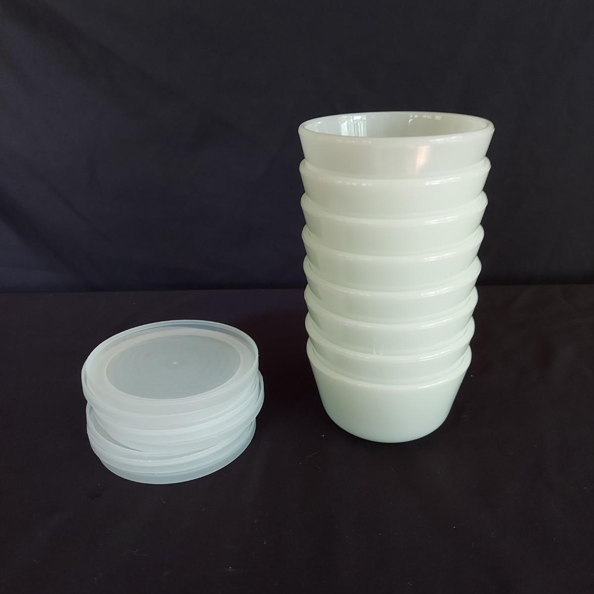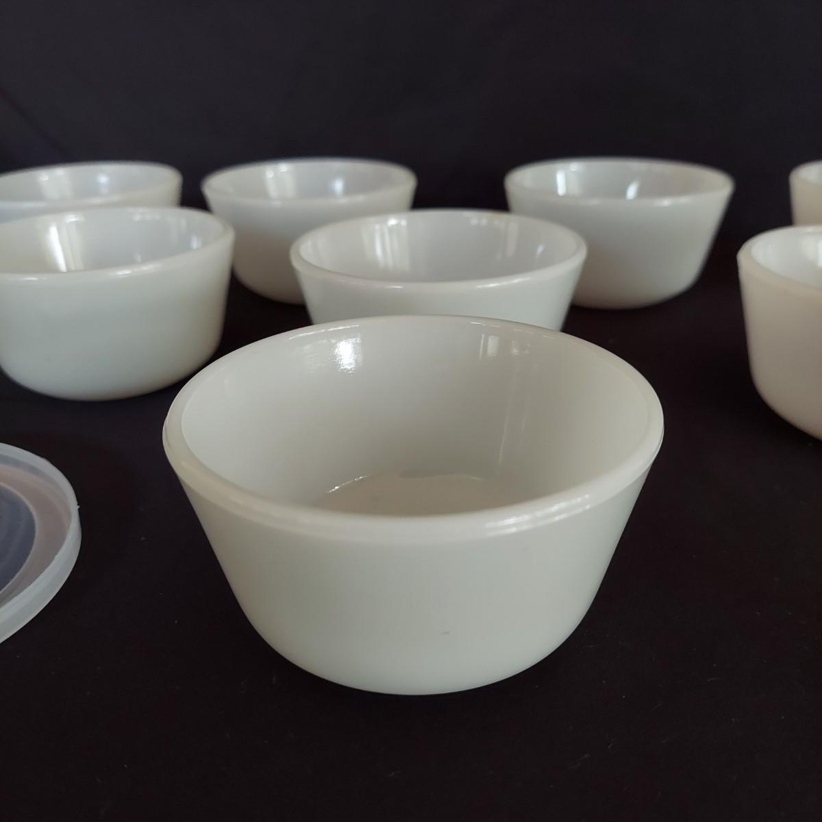 Lot includes several clear and milk glass baking dishes, mixing bowls and more by Anchor Hocking Fire King, Pyrex and others. Includes a Meadow Green printed 9.5" casserole dish with lid and a stack of 3.5" bowls with lids. Plus a large 11" mixing bowl with lid and insulated carrying case and several more bowls and baking dishes. Local Pickup Only