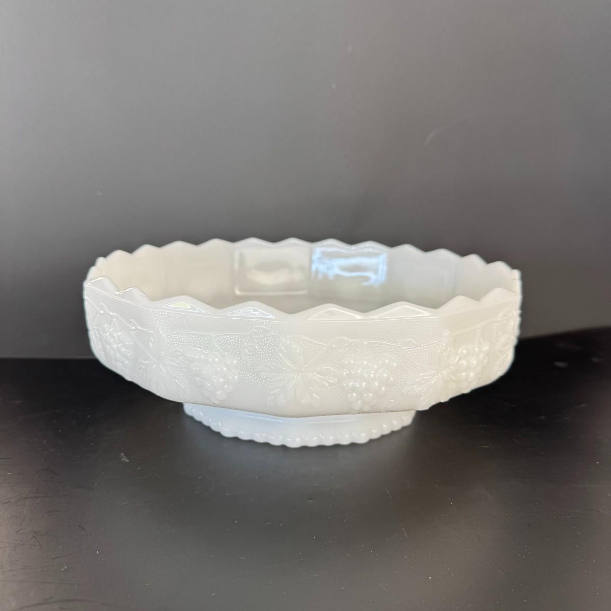 vintage Anchor Hocking Fire King milk glass pedestal bowl, featuring the Harvest Grape pattern.