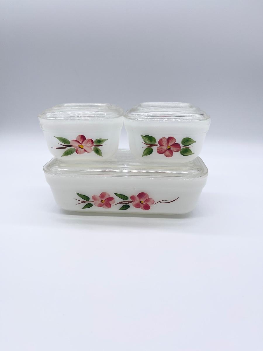 ANCHOR HOCKING ~ Fire King ~ Peach Blossom ~ Three (3)~ Lidded Refrigerator Dishes