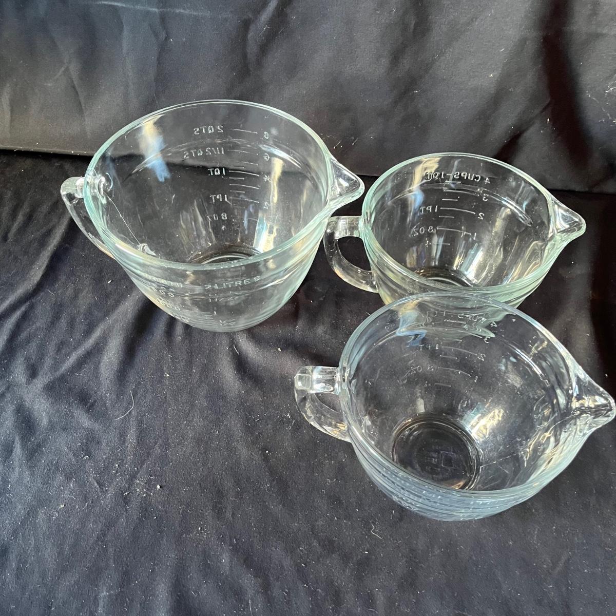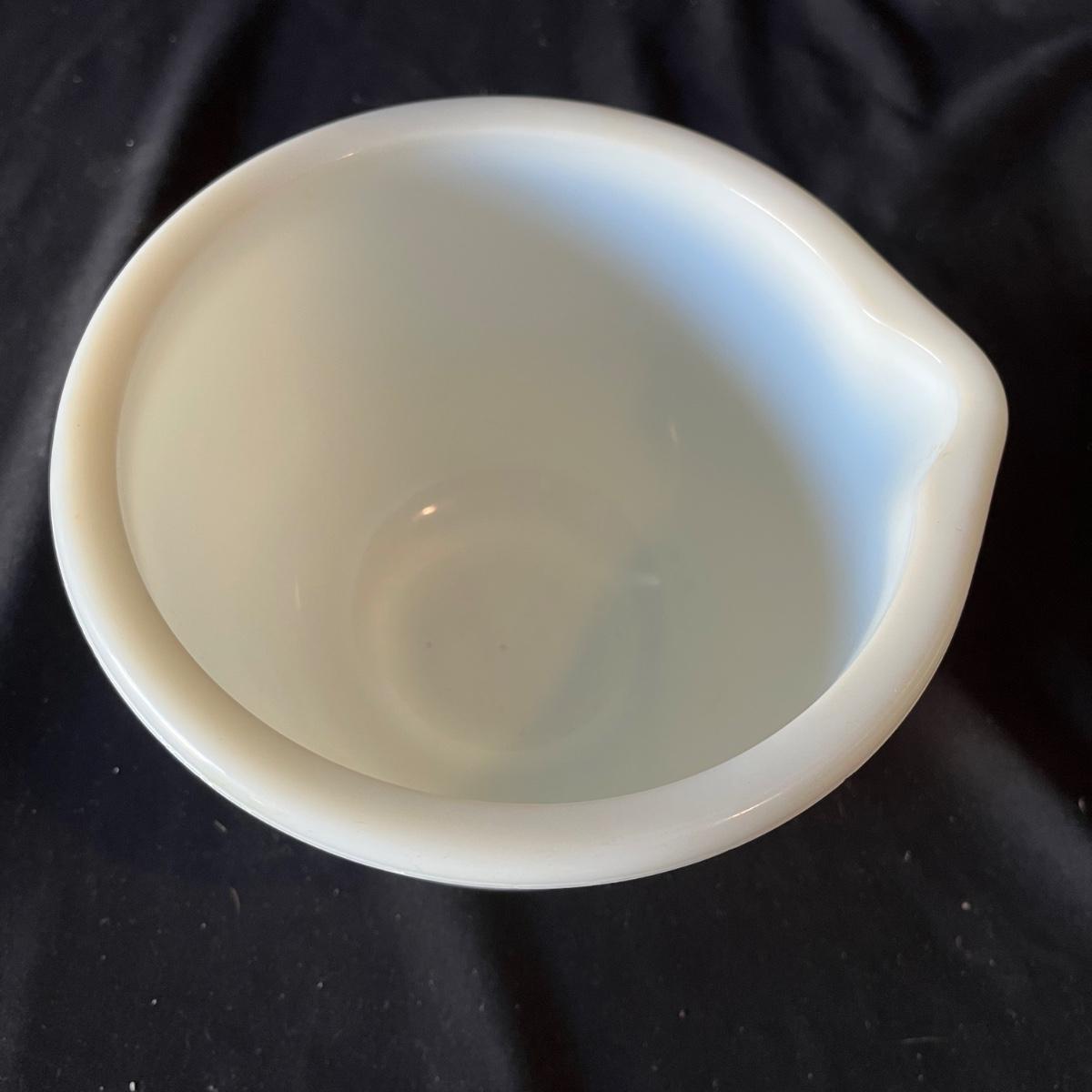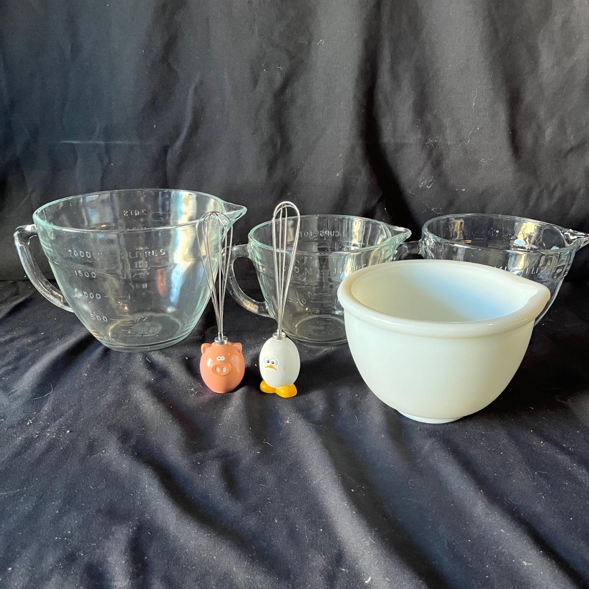 Lot includes two one quart and one two quart Anchor Hocking measuring cups, milk glass mixing bowl and two animal whiskers.