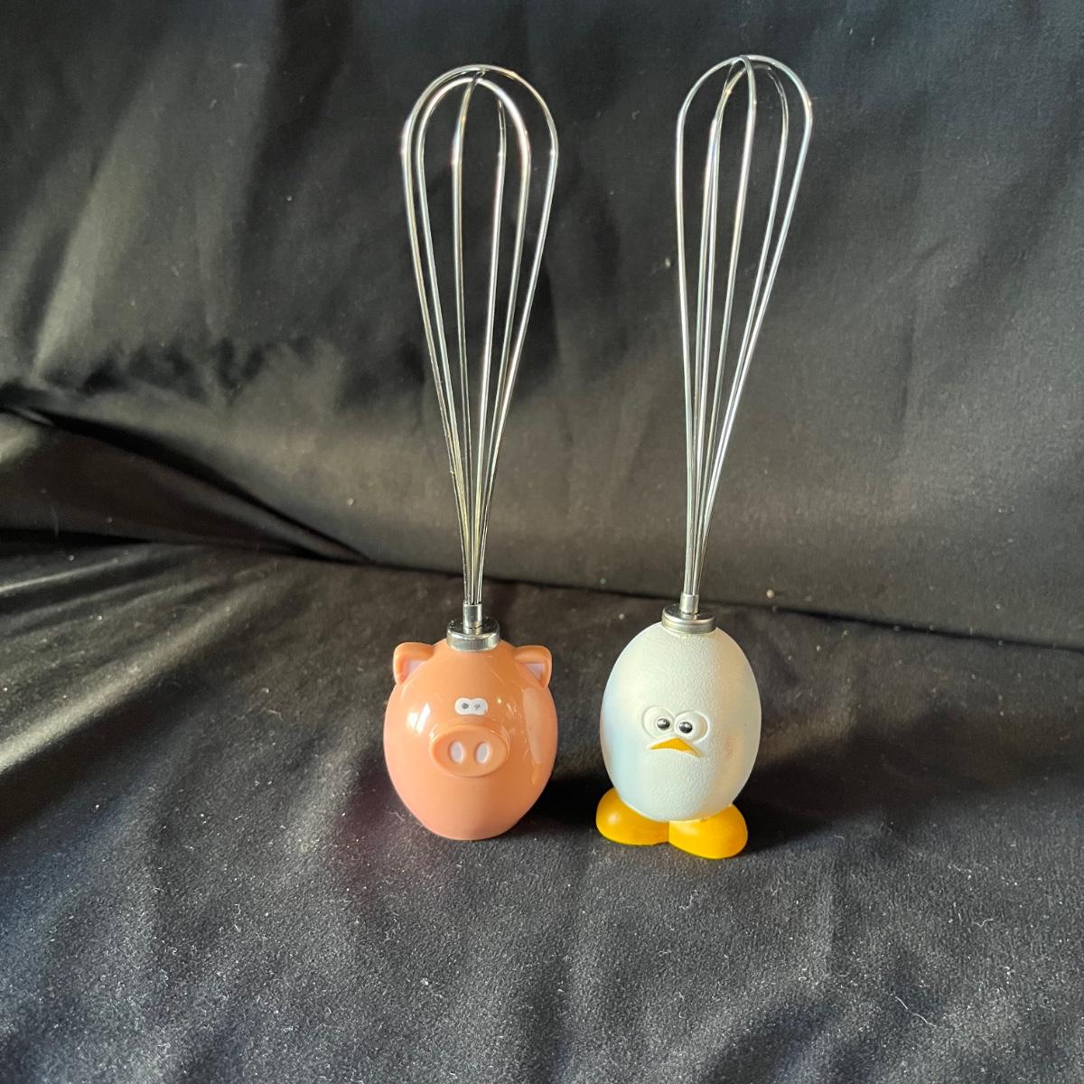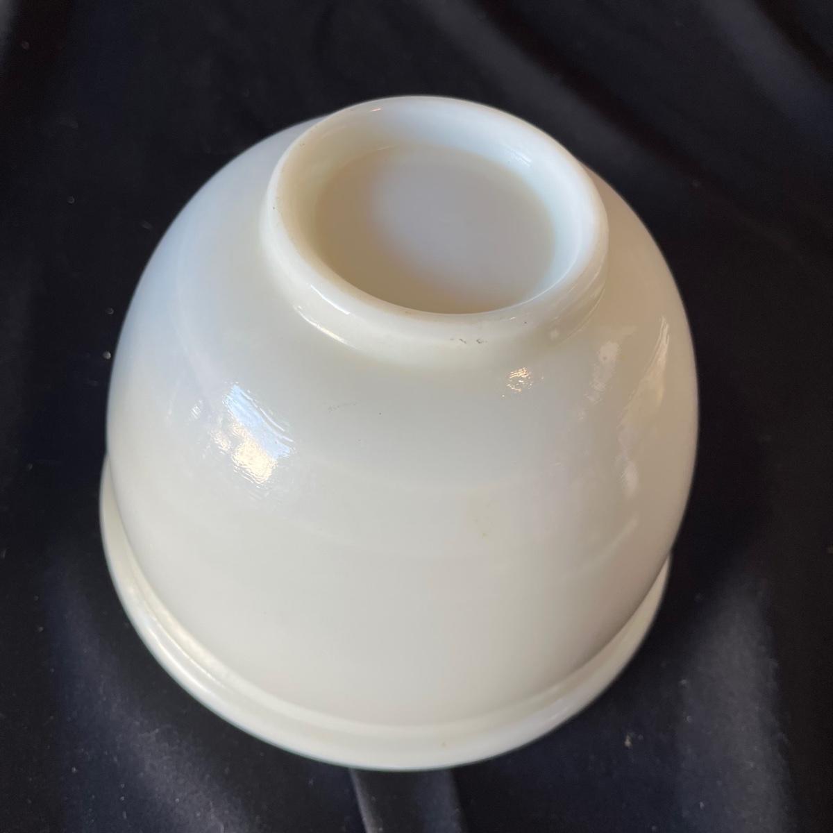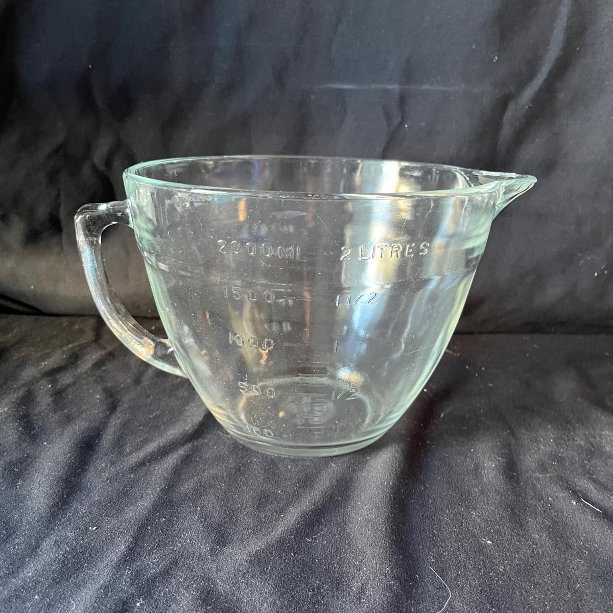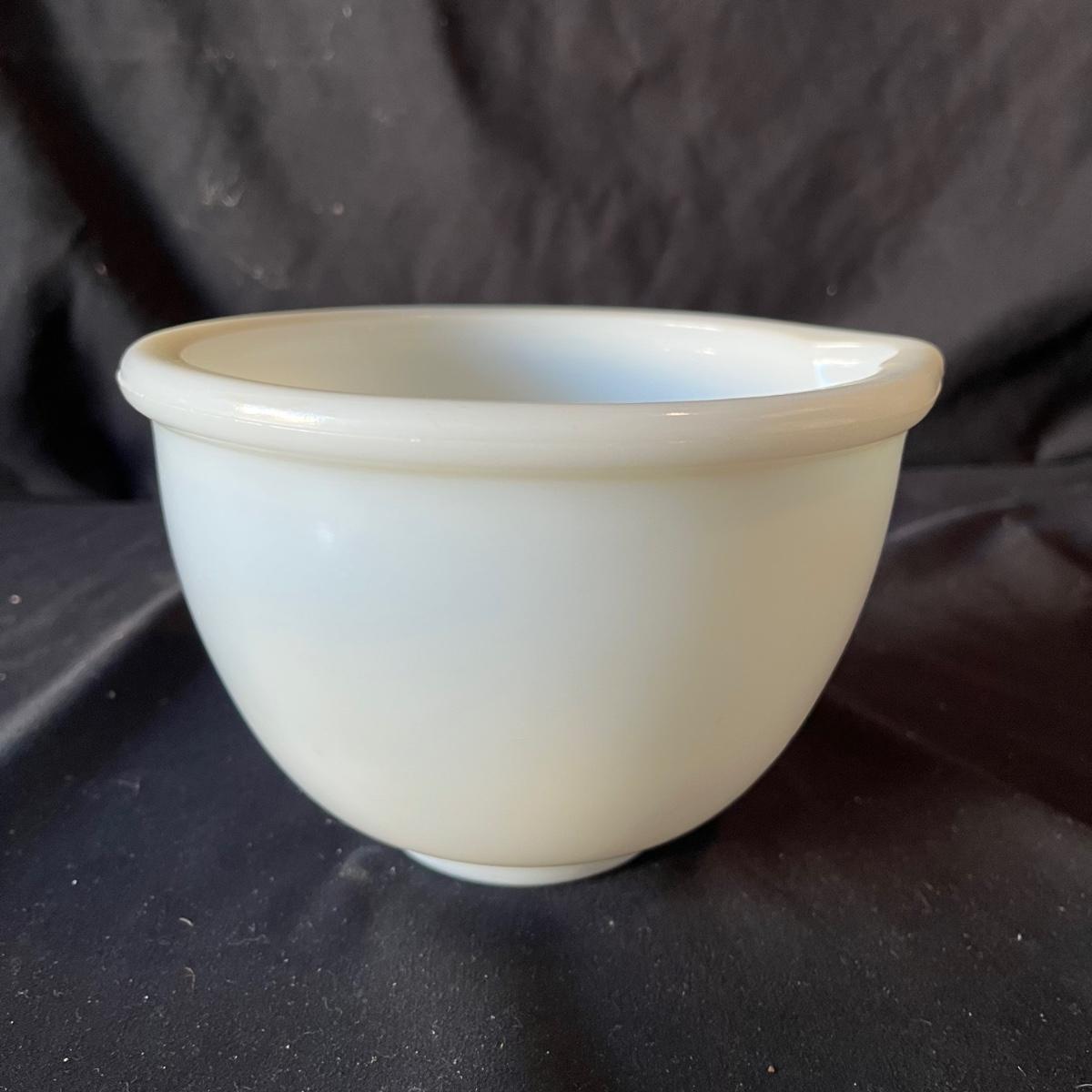 Lot includes two one quart and one two quart Anchor Hocking measuring cups, milk glass mixing bowl and two animal whiskers.