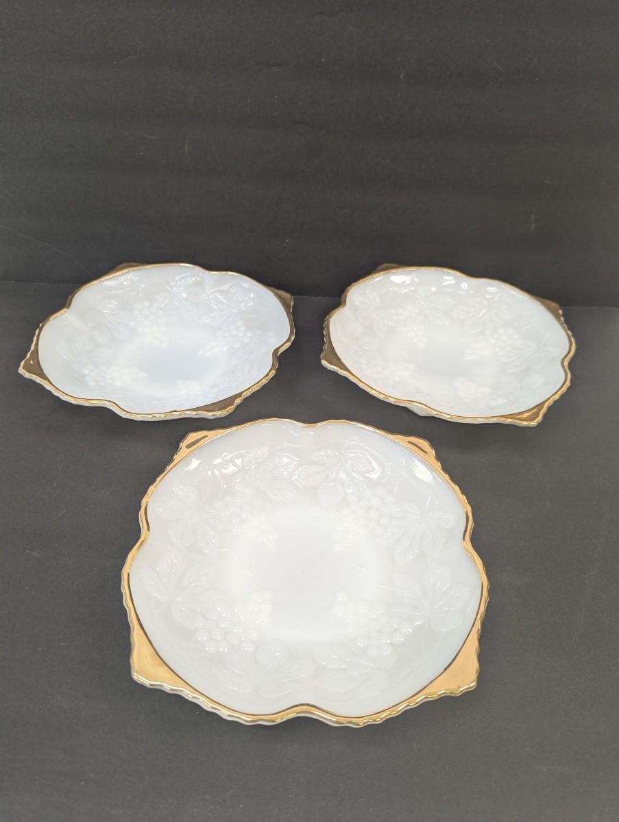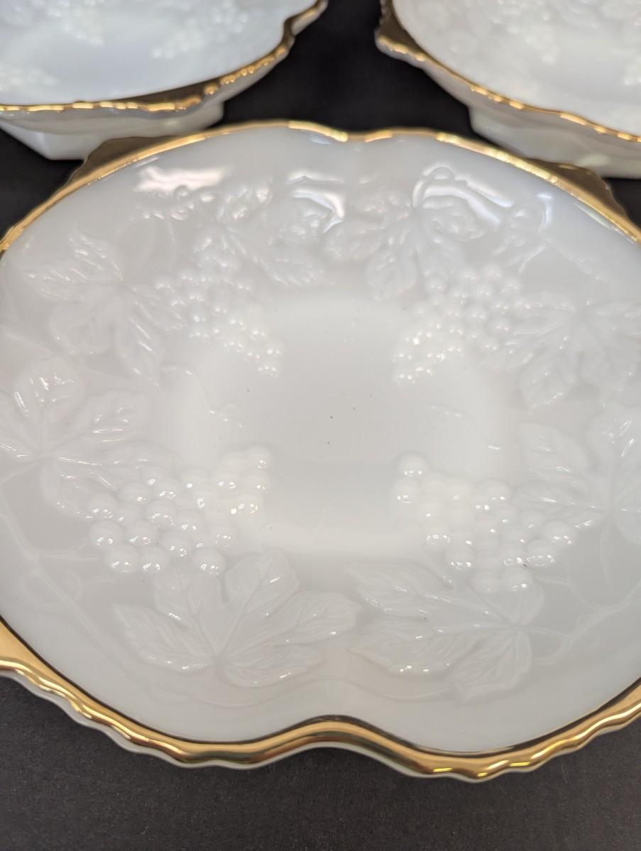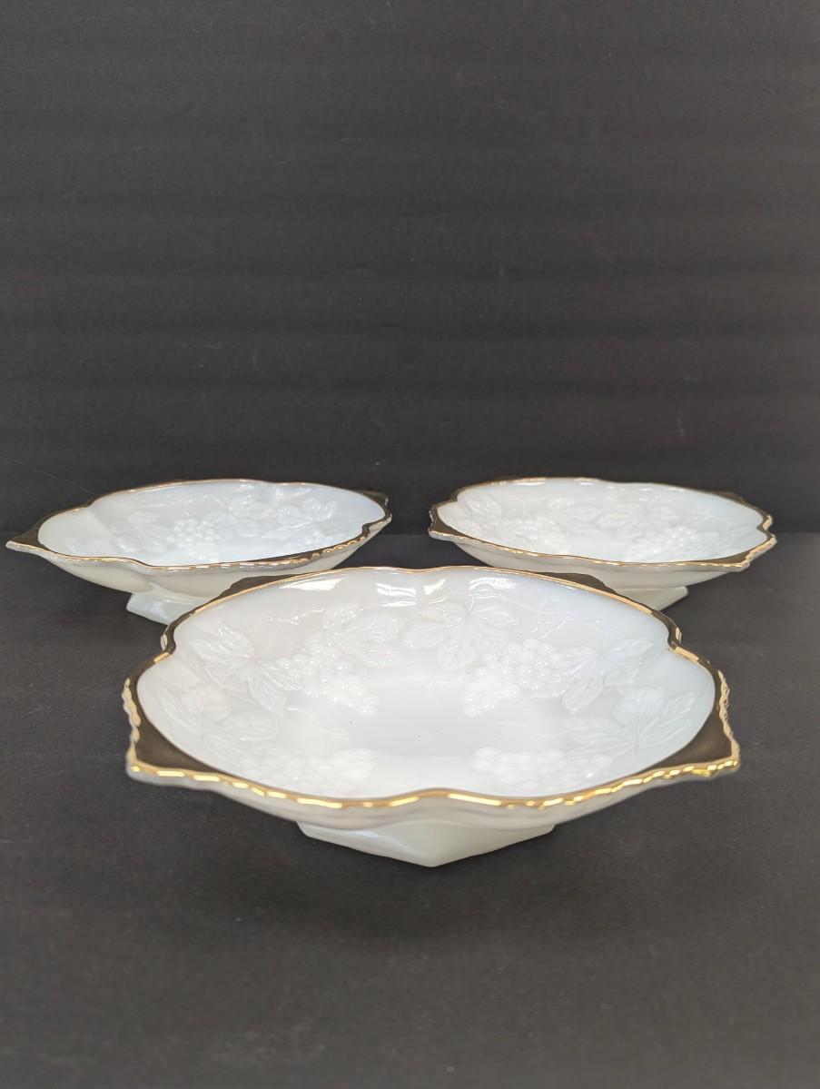 Anchor Hocking Grape Leaves Milk Glass Fruit Bowls With Gold Trim